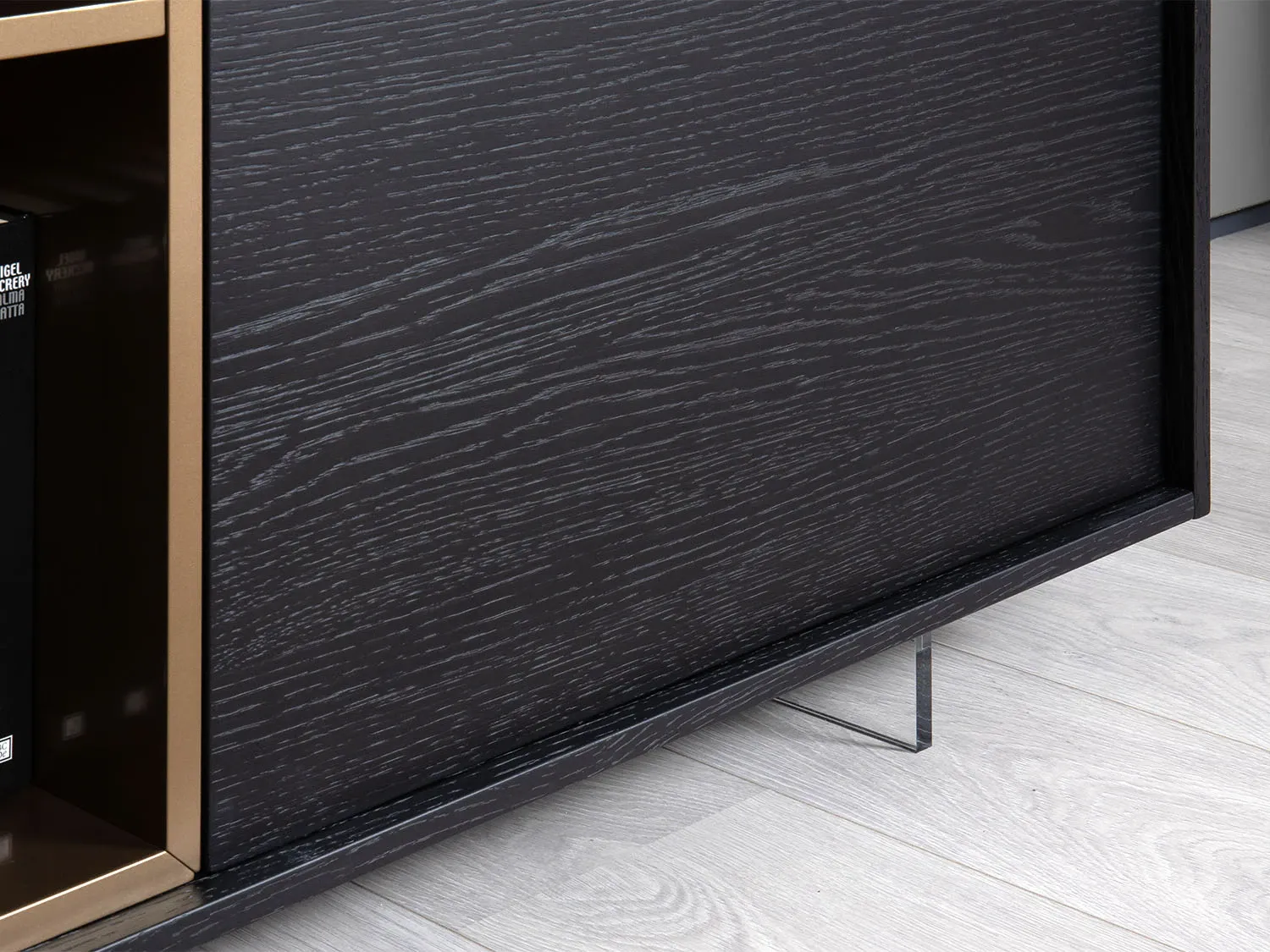 Il piano superiore si raccorda ai fianchi laterali attraverso una giunzione a 45° con scuretto rompifilo, una lavorazione che esprime cura artigianale e attenzione costruttiva. La base è completata da piedini in metacrilato trasparente, che alleggeriscono visivamente il mobile, conferendogli un aspetto elegante e sospeso nonostante le importanti dimensioni.