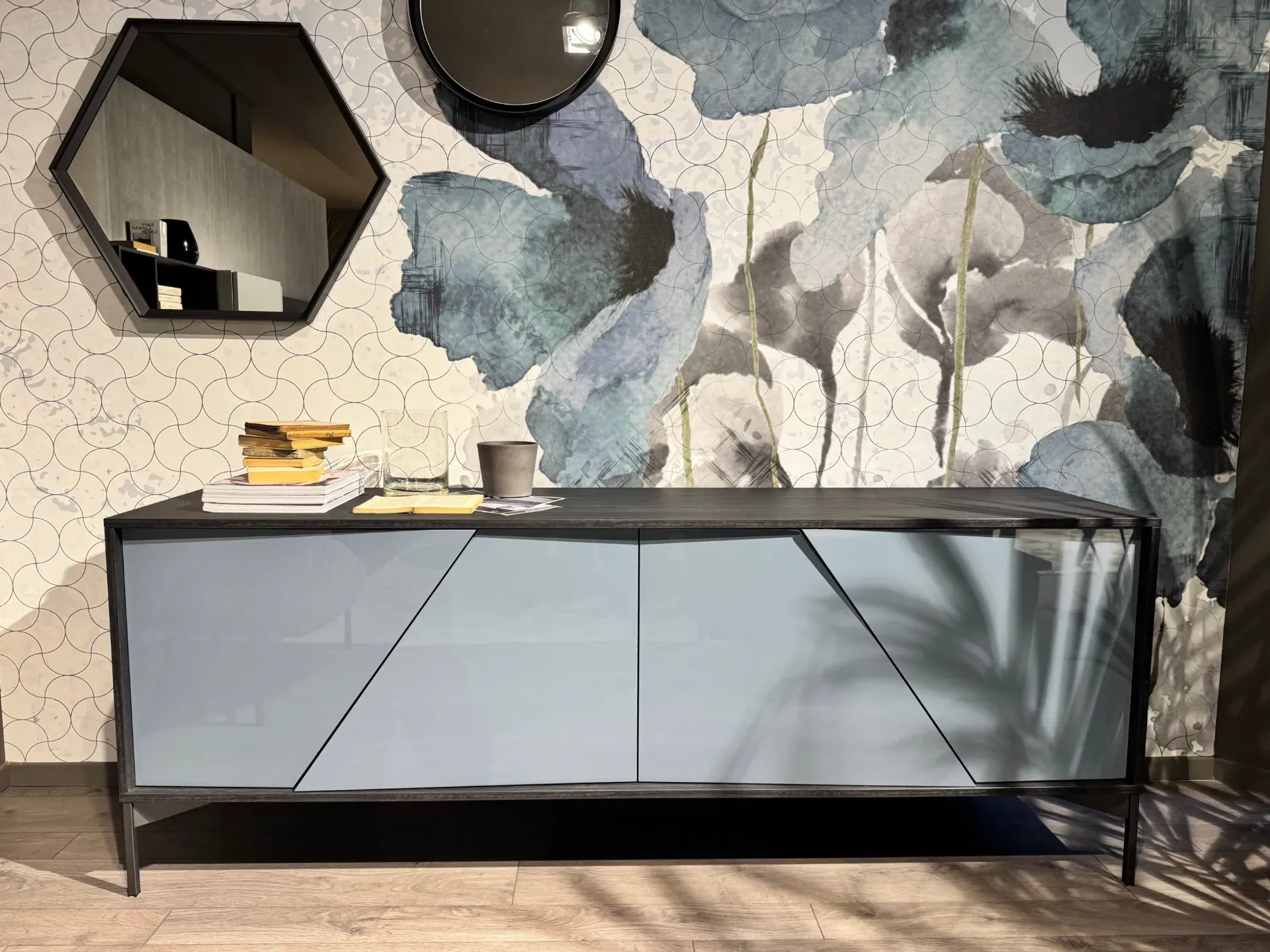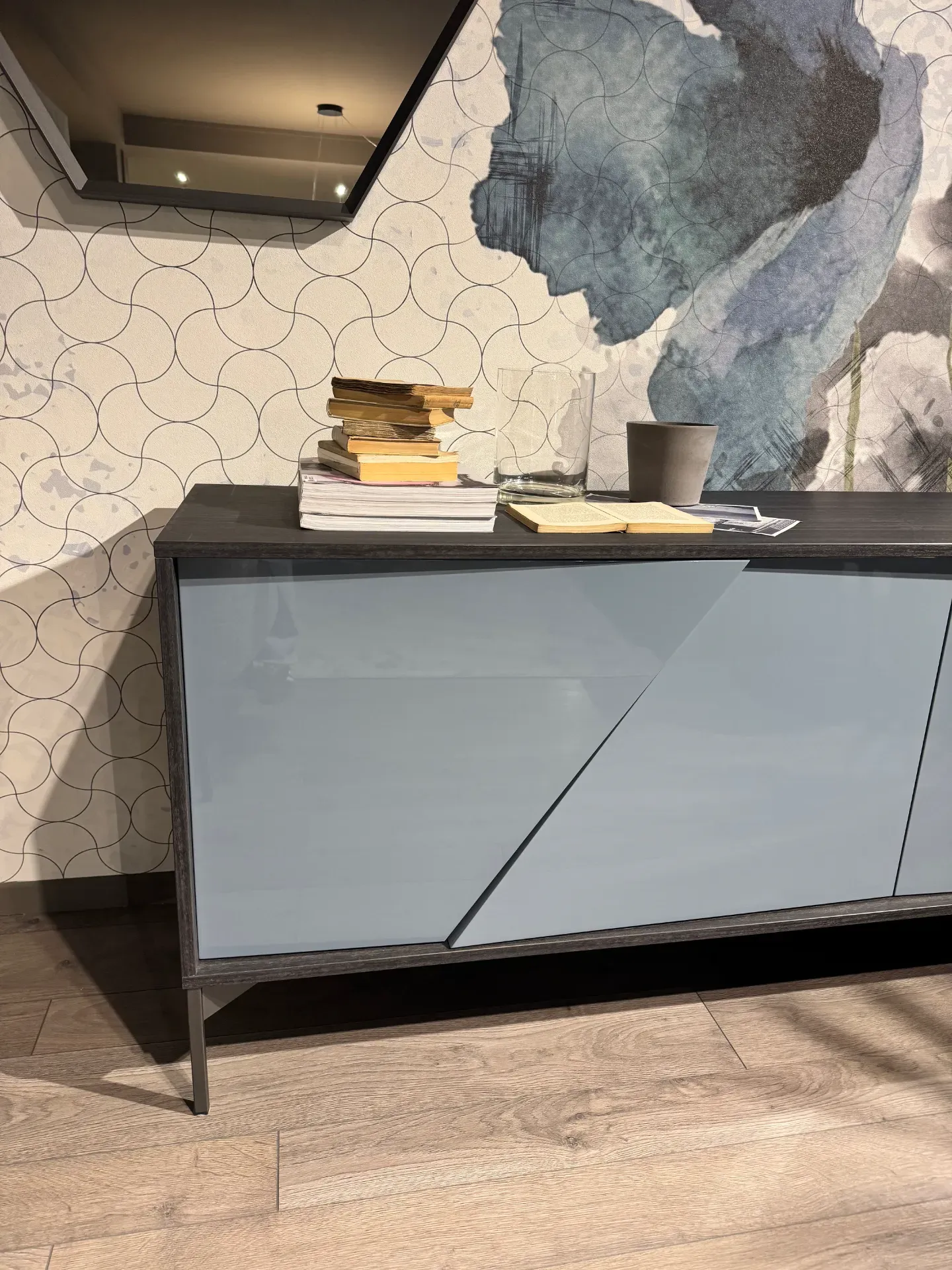 Madia Kendo di Alf Da Frè scontata a 1.163,00 euro. Madia moderna caratterizzata da un particolare gioco geometrico delle ante, ciascuna anta presenta un taglio di 30 gradi che la divide in due parti non perfettamente complanari ma lievemente dissestate, regalando alla superficie un effetto di chiaroscuro. Credenza composta da quattro ante, all'interno due ripiani in vetro trasparente grigio, sollevata da terra da un basamento con piedini perimetrali in metallo moka shine. Madia proposta con finiture differenti, la struttura e il top sono in nobilitato eukalipto fossile, mentre le ante sono laccate lucide pacifico. Madia di design perfetta da collocare in ogni zona giorno o sala da pranzo. Misure madia: larghezza 210, profondità 50, altezza 78 centimetri. Prodotto che potrete vedere all'interno della nostra esposizione a Giussano, in provincia di Monza e Brianza. Per qualsiasi informazione non esitate a contattarci.