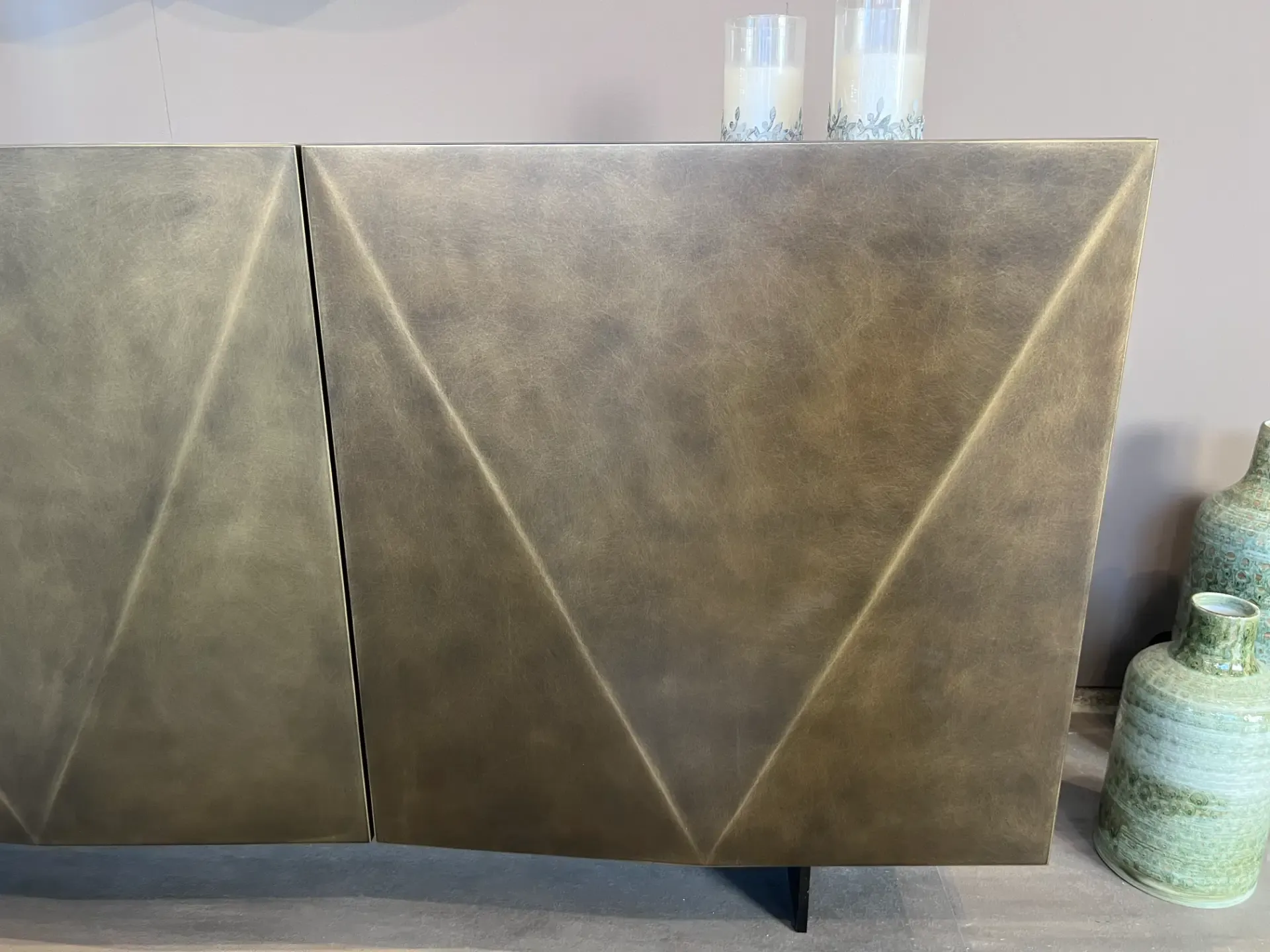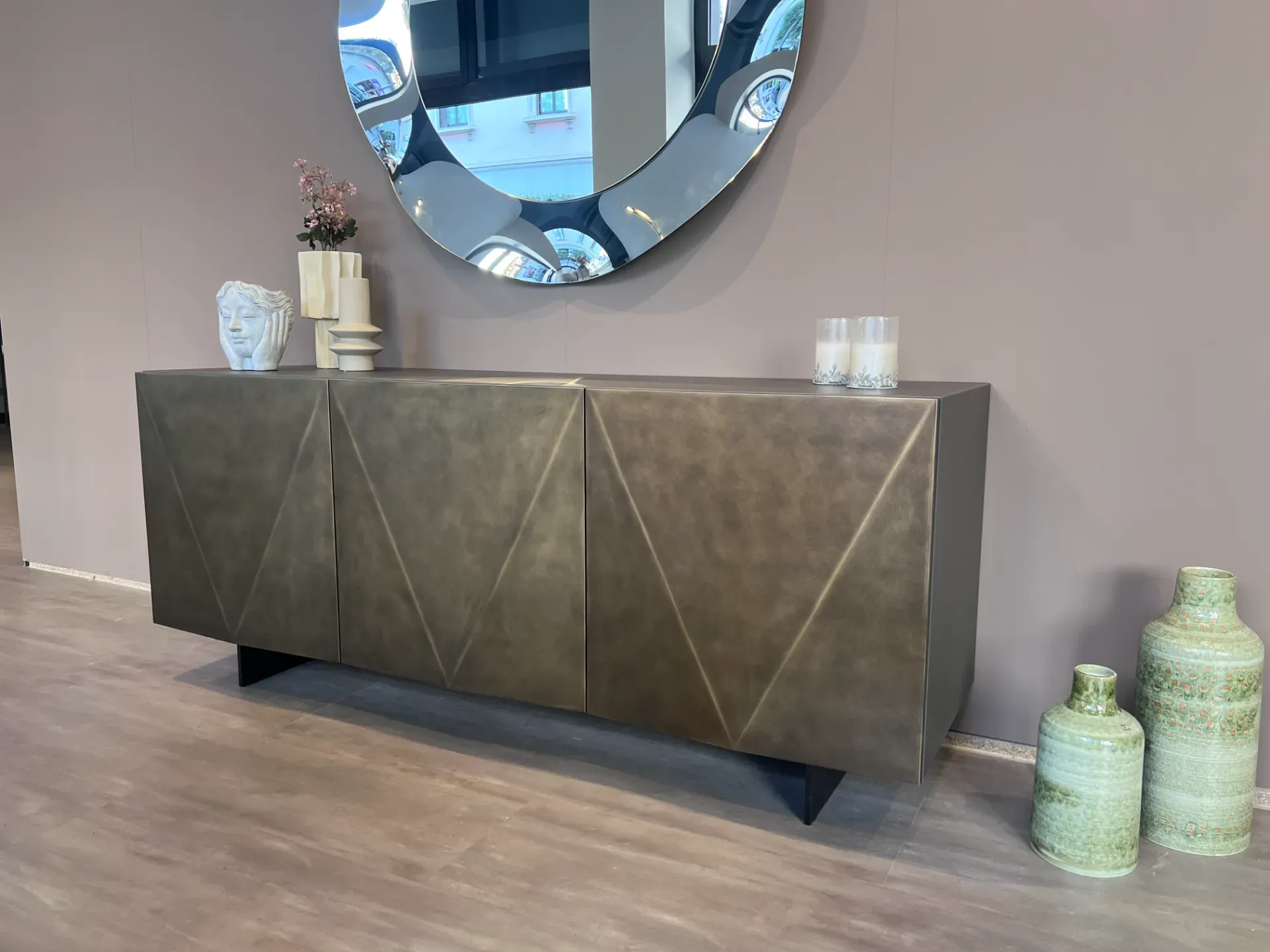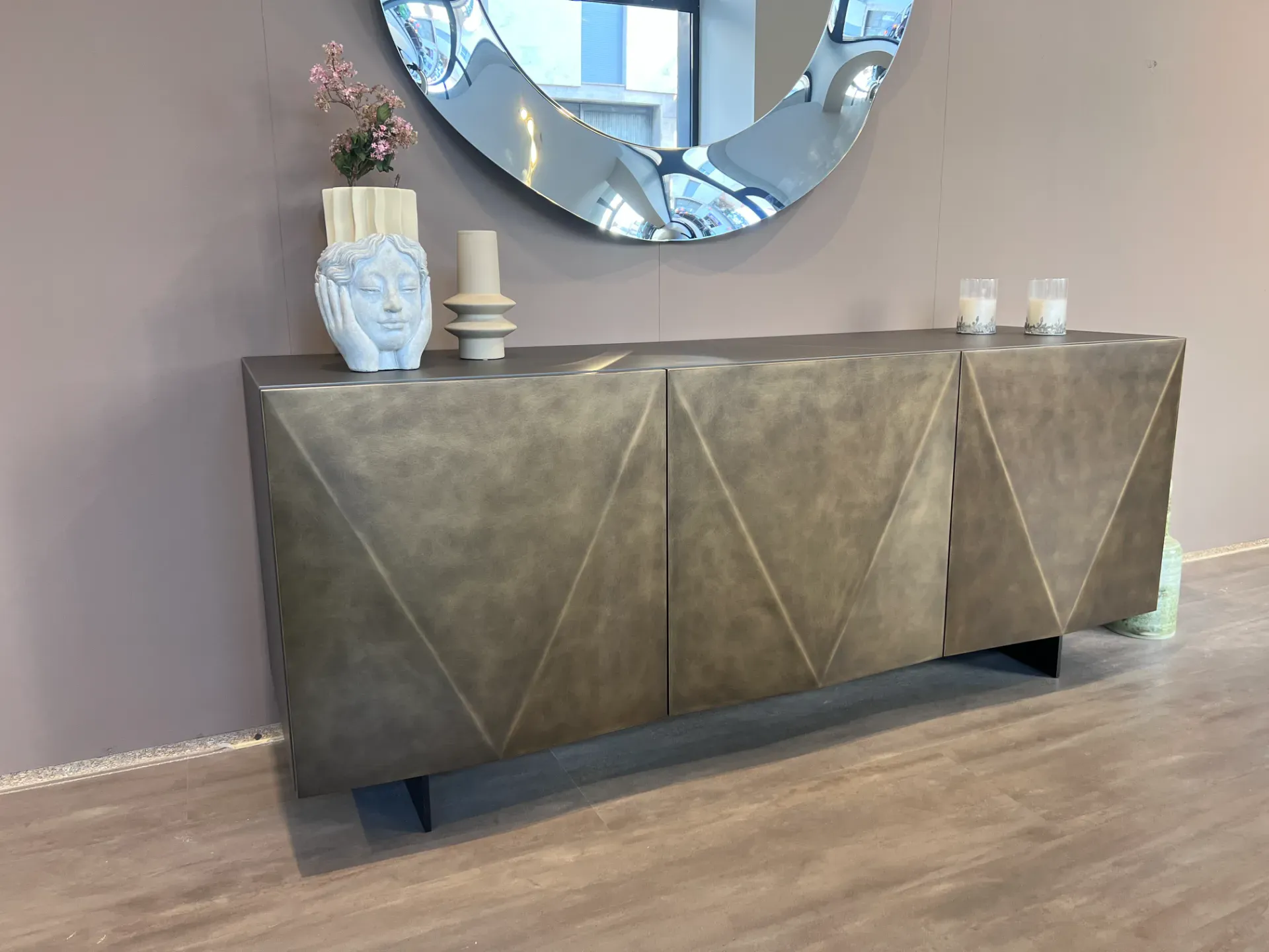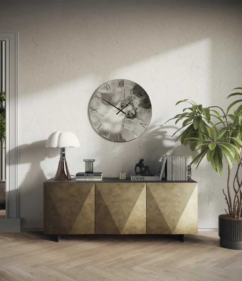 Le ante della madia sono il vero elemento distintivo: la loro particolare forma a diamante, rifinita in un suggestivo metallo ossido, crea giochi di luce e ombre che catturano l'attenzione e donano profondità visiva. Questa caratteristica non solo esalta l'estetica del mobile, ma aggiunge anche un tocco di lusso discreto al tuo soggiorno.
