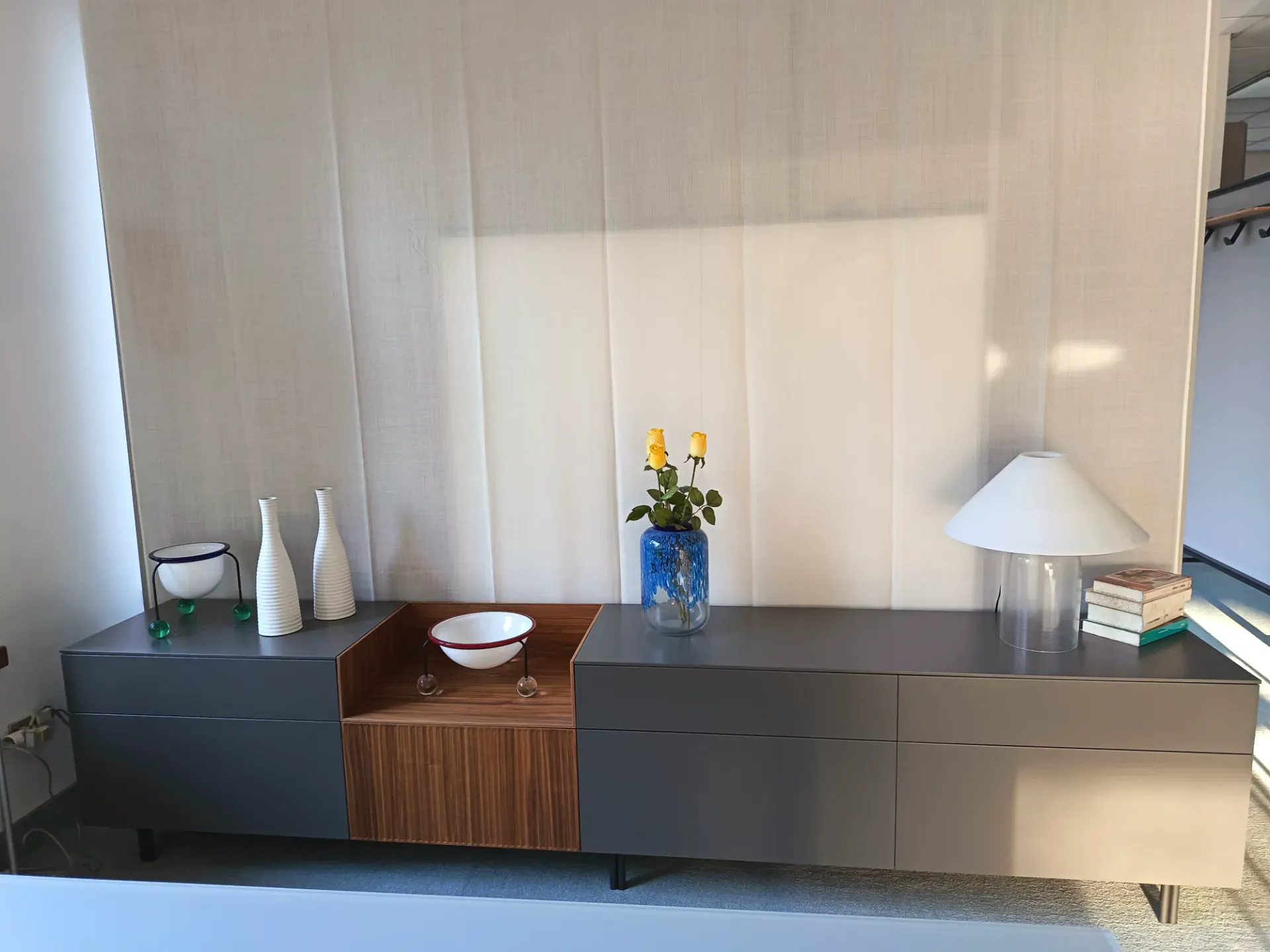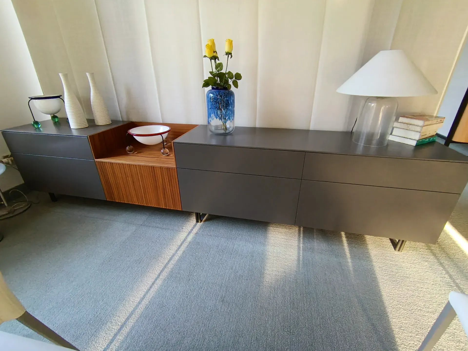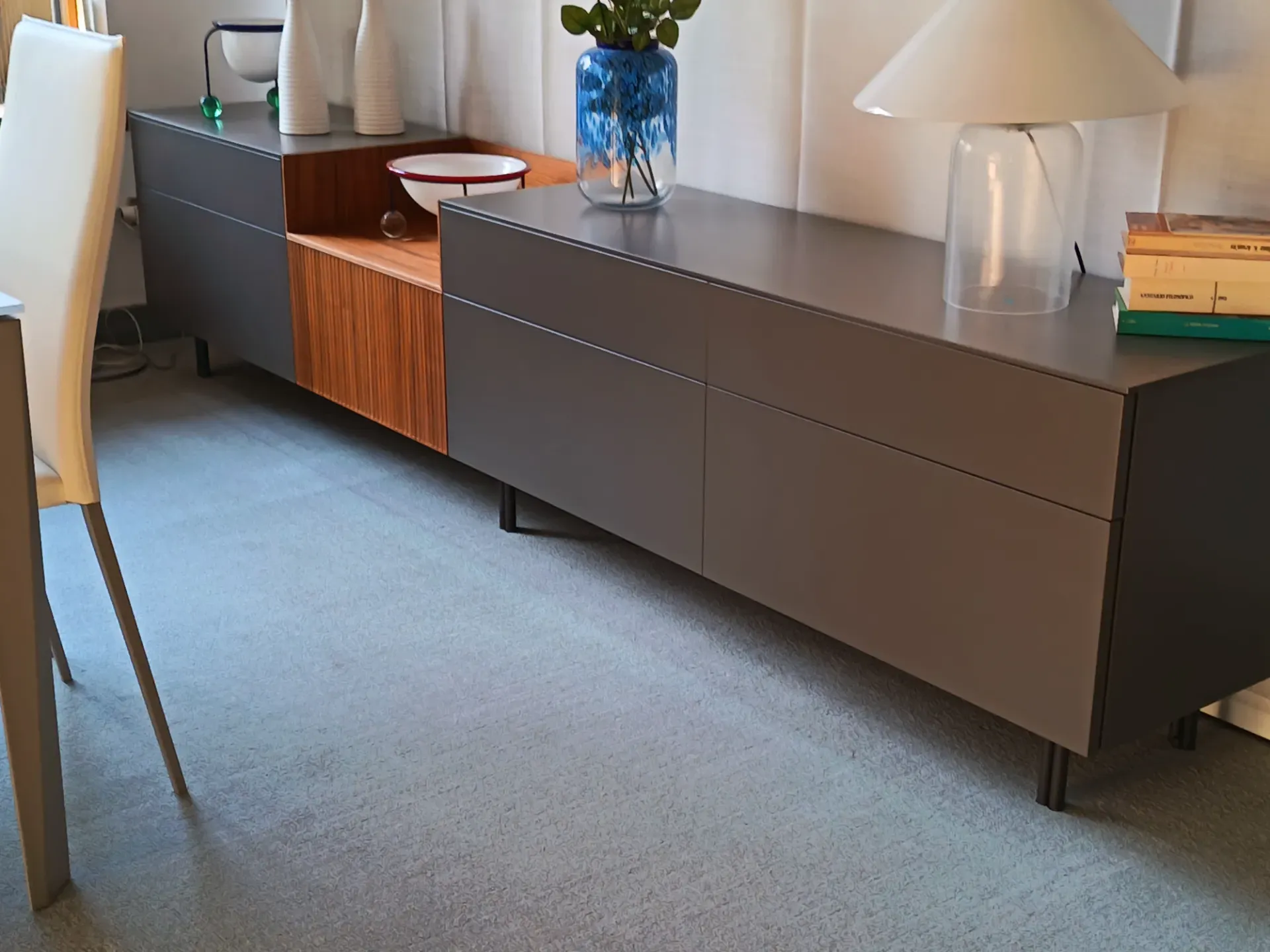 MADIA LACCATA QUARZO OPACO APPOGGIATA SU UNA PANCA CON PIEDINI METALLO LACCATO ANTRACITE CON CASSETTI E CESTONI CON UN CESTONE IMPIALLACCIATO NOCE CANALETTO FINITURA CON INCISIONI VERTICALI.