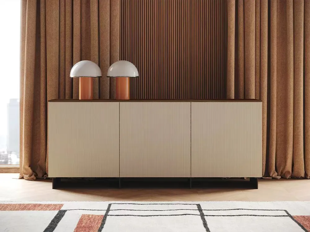 Questa moderna madia per il tuo salotto è scontata del 40% sul prezzo di listino. La sua struttura presenta tre ante cannettate in nobilitato cannettato opaco e un top di 12 mm in nobilitato della medesima finitura della cassa.
