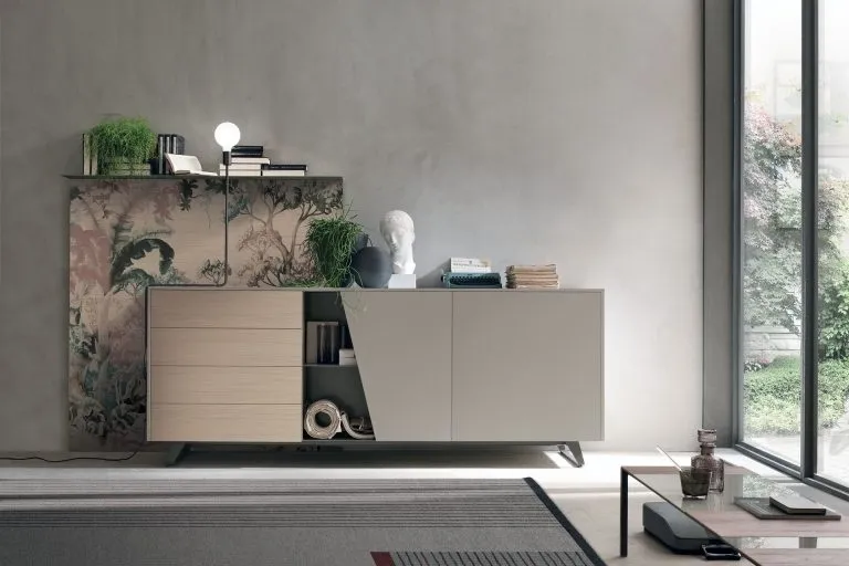 Forme decise e materiali di prima scelta: scopri la madia in laccato opaco qui visibile e potrai completare il living.