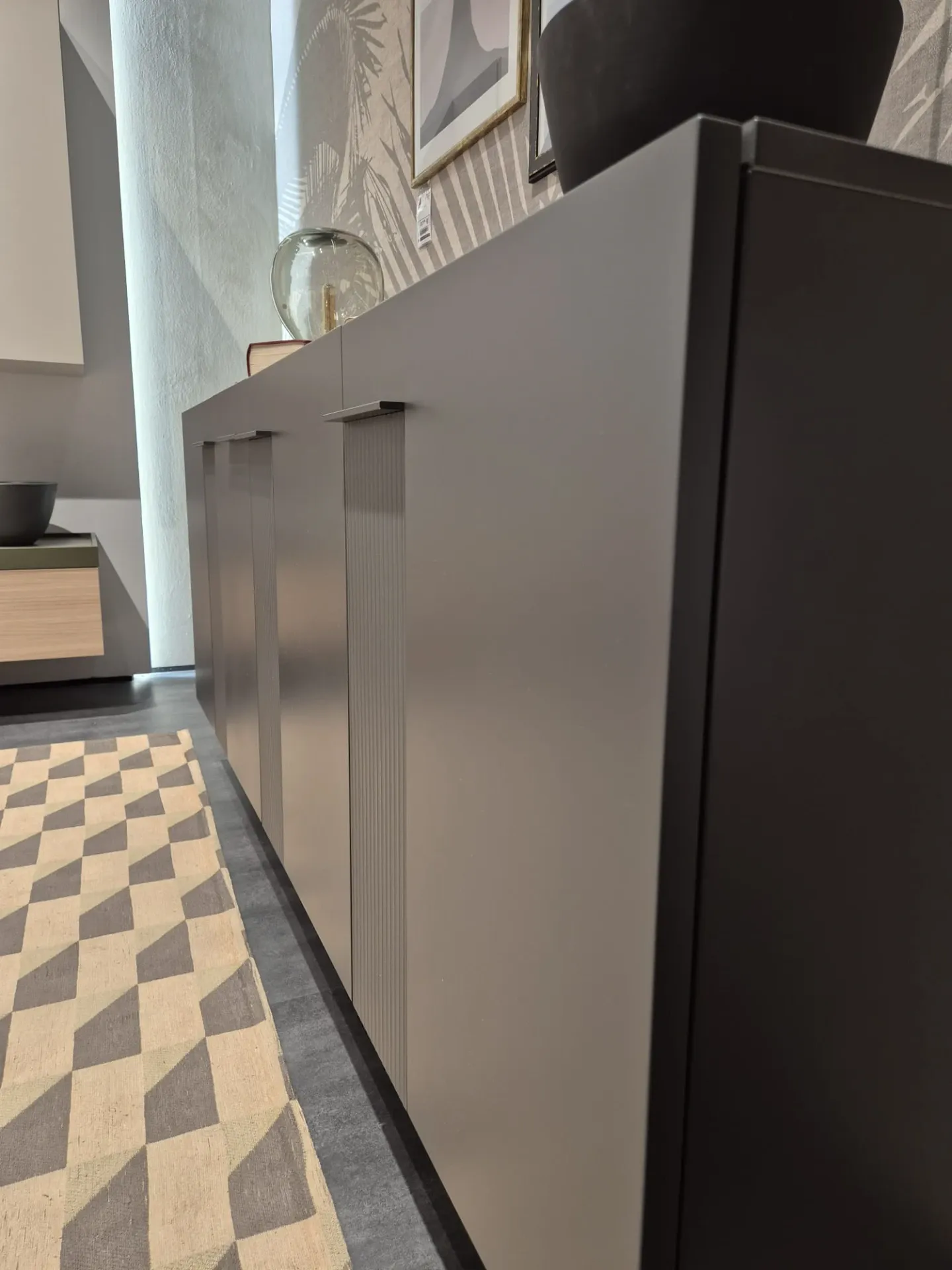 La finitura laccata antracite valorizza le superfici e rende il mobile attuale, facile da inserire sia in ambienti moderni che più raffinati.
