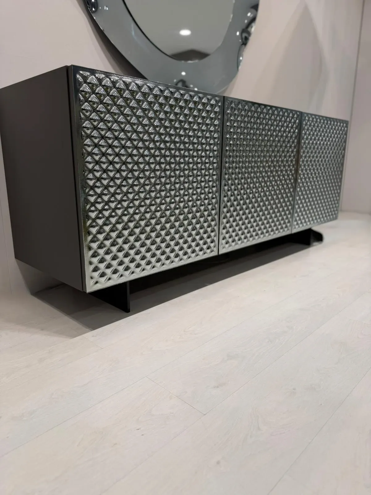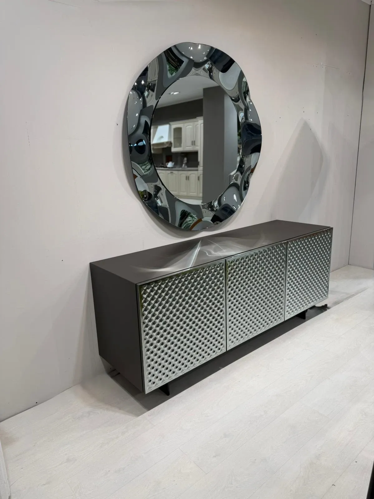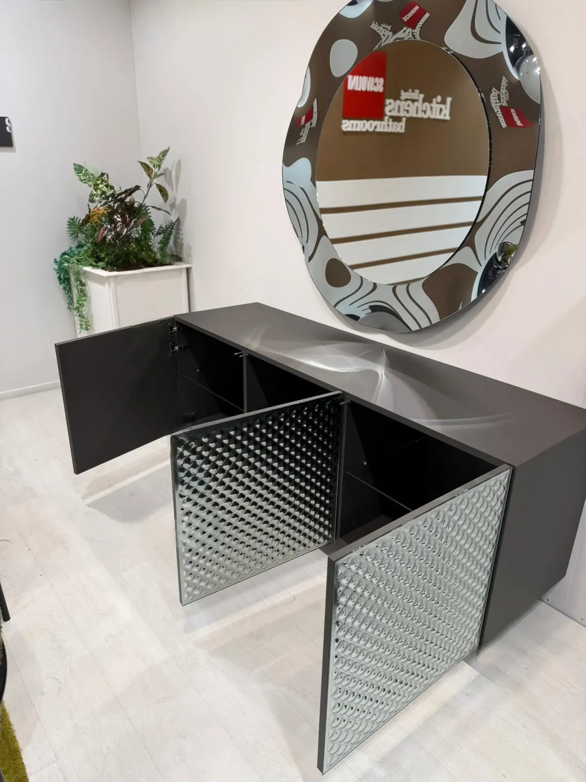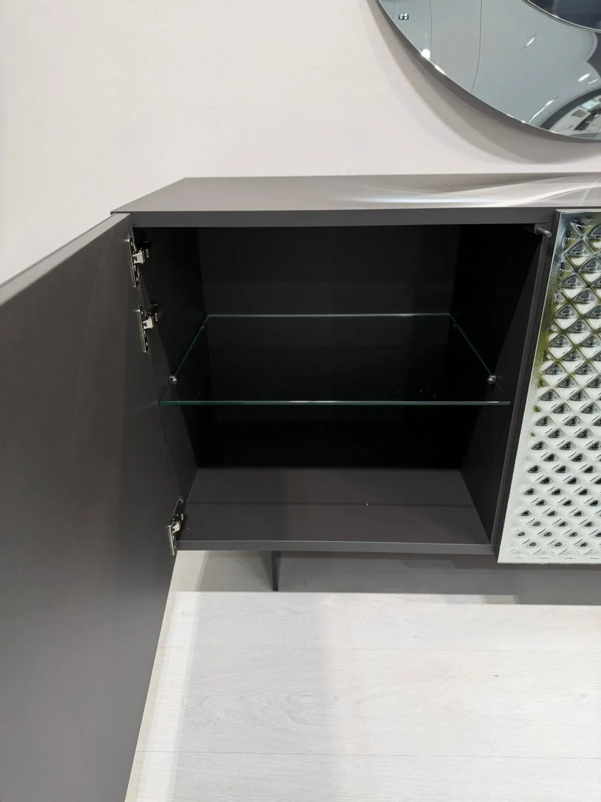 Dettagli: anta in vetro specchiato "Net" con trama a rombi, contenitore realizzato in folding in finitura grigio ferro.