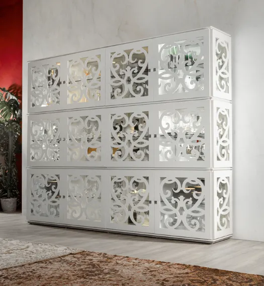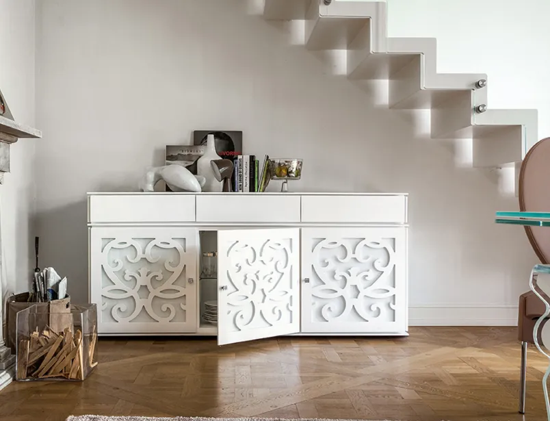 MADIA PARIS TONIN CASA Versione foto. Dimensioni L.184 P.50 H.84 cm informativa tecnica: Madia con 3 ante traforate e 3 cassetti in legno laccato con vetro temperato Struttura Bianco Opaco Ante Vetro extra chiaro bianco
