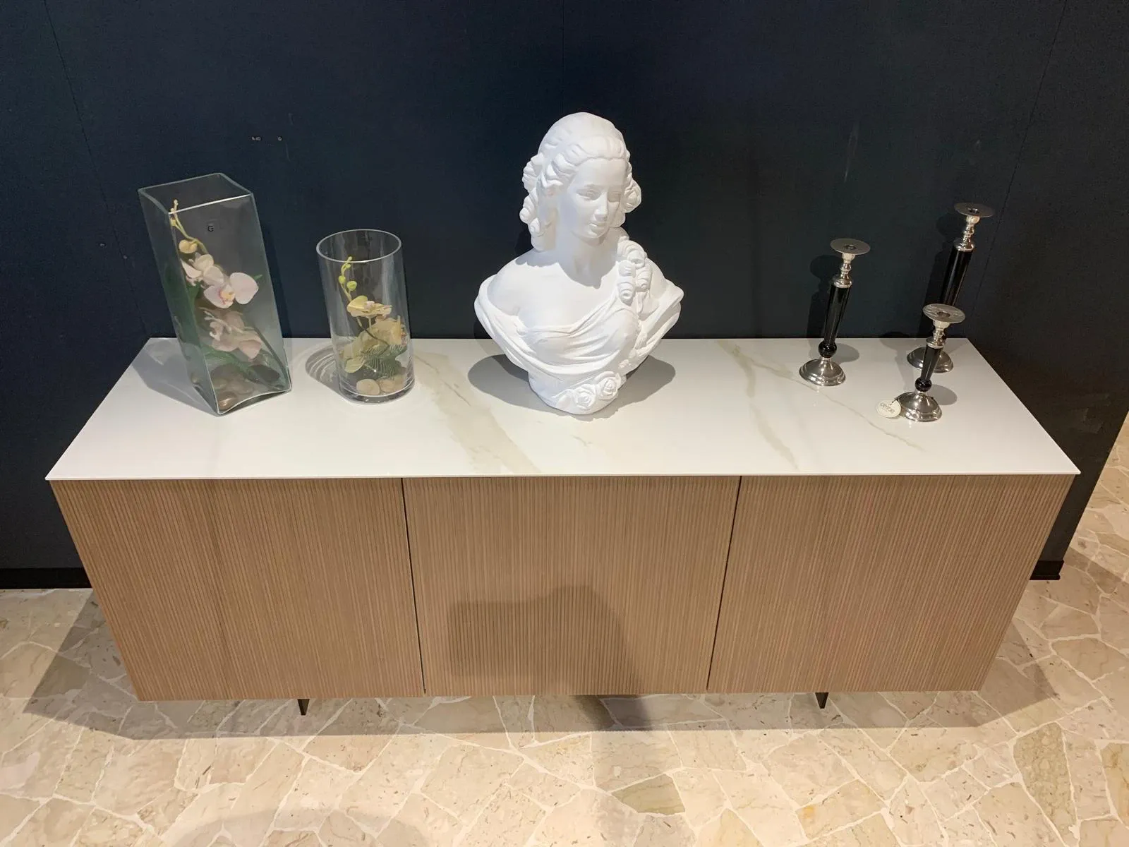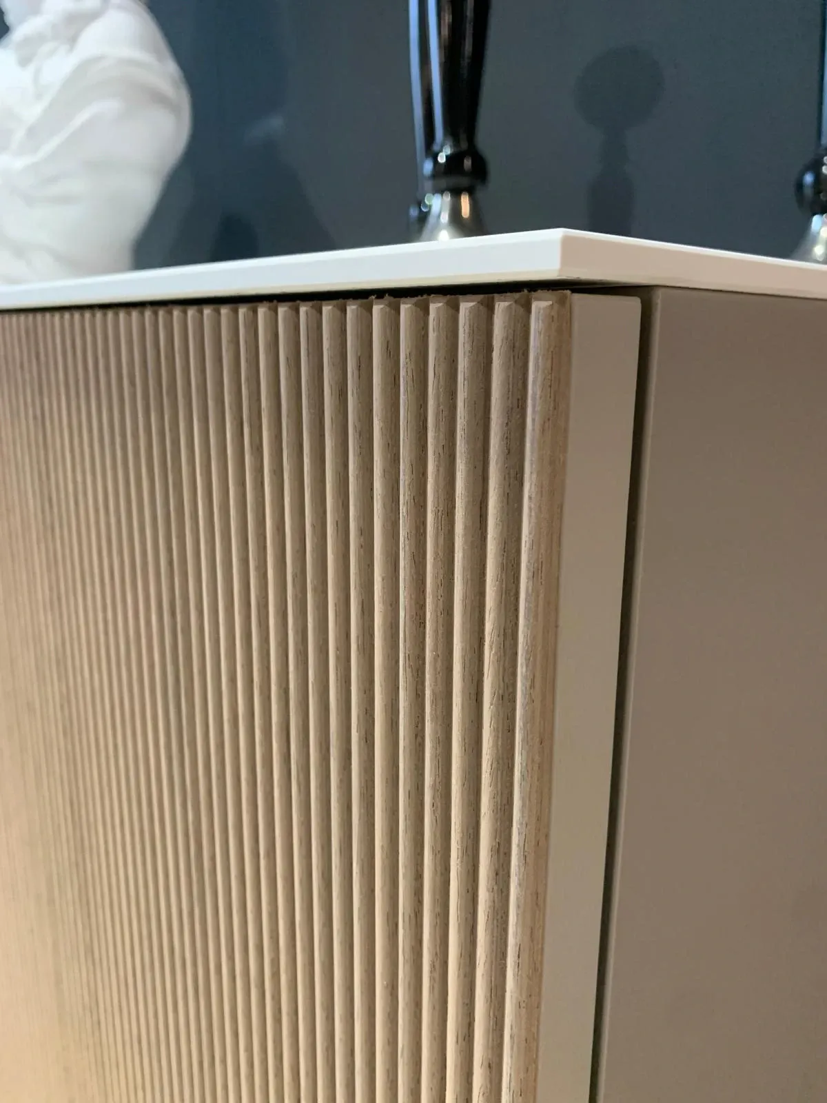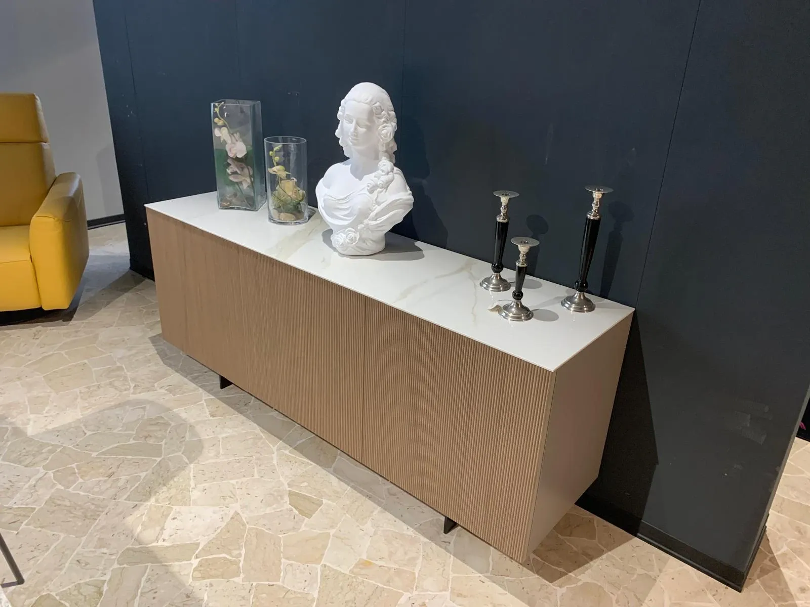 Madia con top in ceramica calacatta oro, ante in cannettato verticale.
