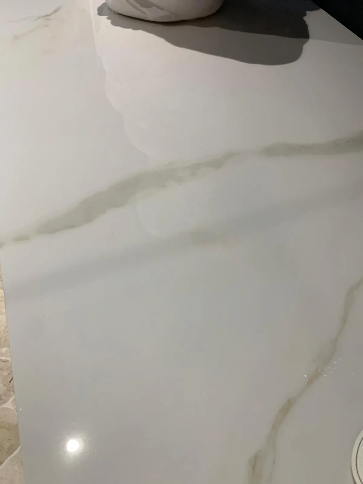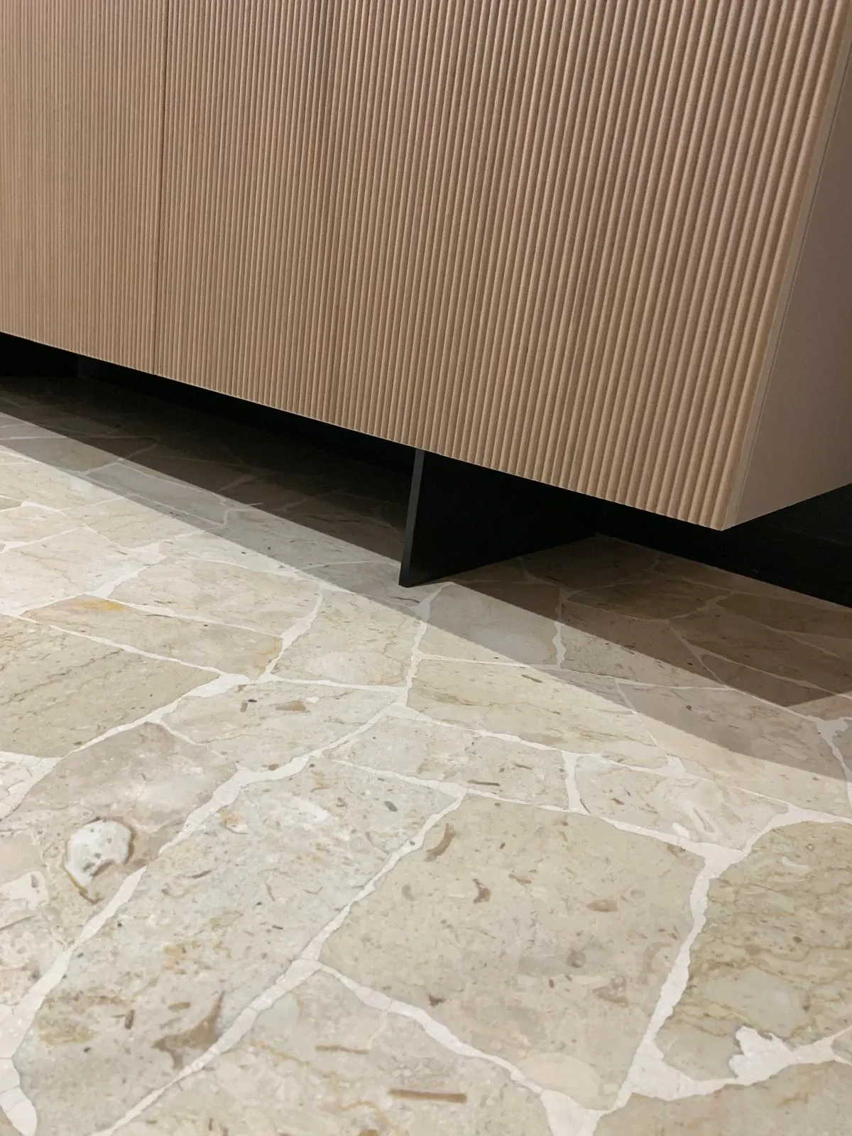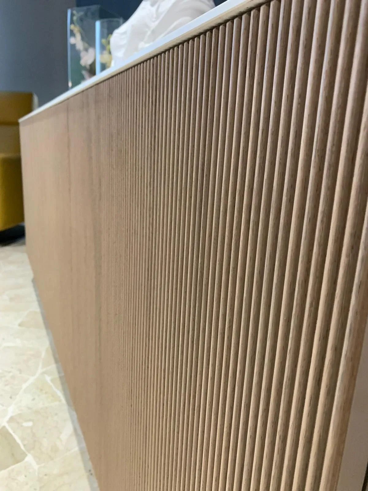 Madia con top in ceramica calacatta oro, ante in cannettato verticale.