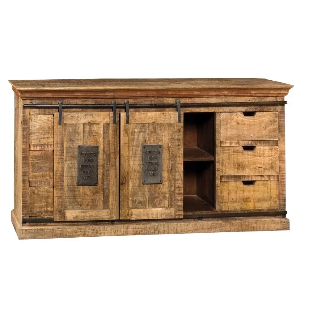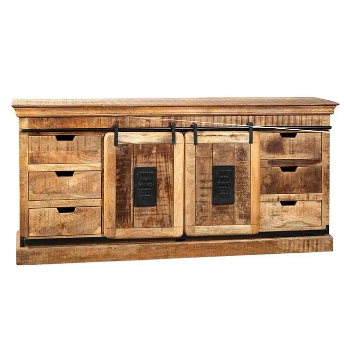 Credenza Newport 6 Css+2 Ante, in legno massello riciclato con 2 ante scorrevoli su asta in ferro + 6 cassetti con maniglie in metallo. Lo stile industrial con legni riciclati, vissuti e linee che si ispirano alle vecchie fabbriche , arredando con una personalità . per tutti i tipi di ambianti
