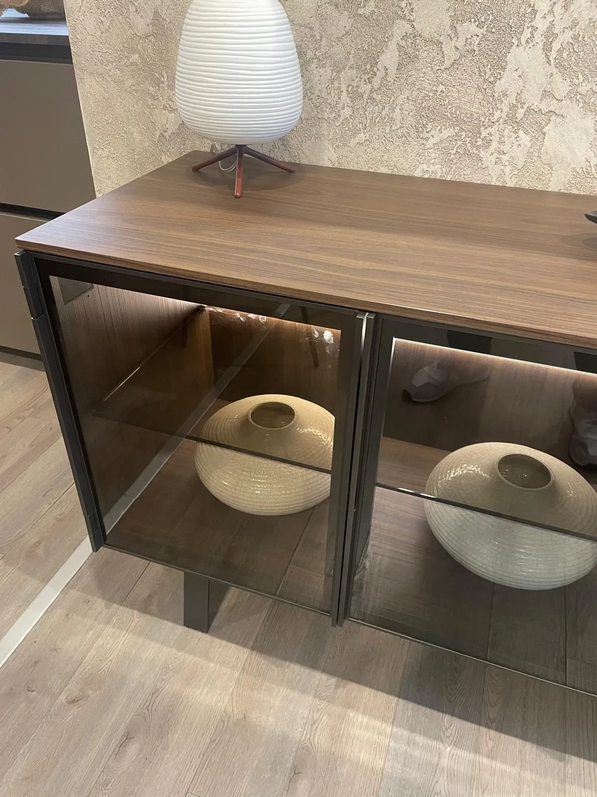 Misura in lunghezza 1800mm per una profondità di 485mm e un altezza di 775mm, in finitura noce canaletto e ante in vetro fumè con telaio in alluminio, retroilluminata.
