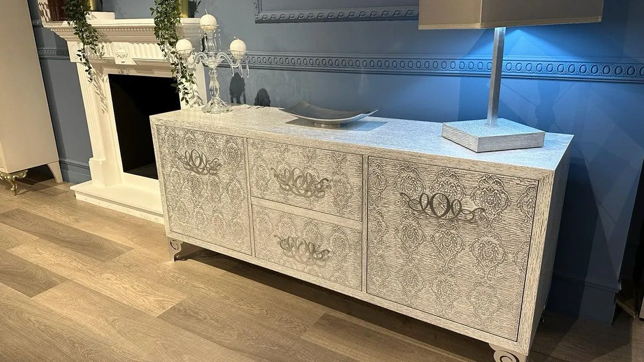 Madia modello Keope firmata CorteZari in rovere sabbiato in finitura 18 foglia argento carrara con decor rococò e piedi argento kaleido.