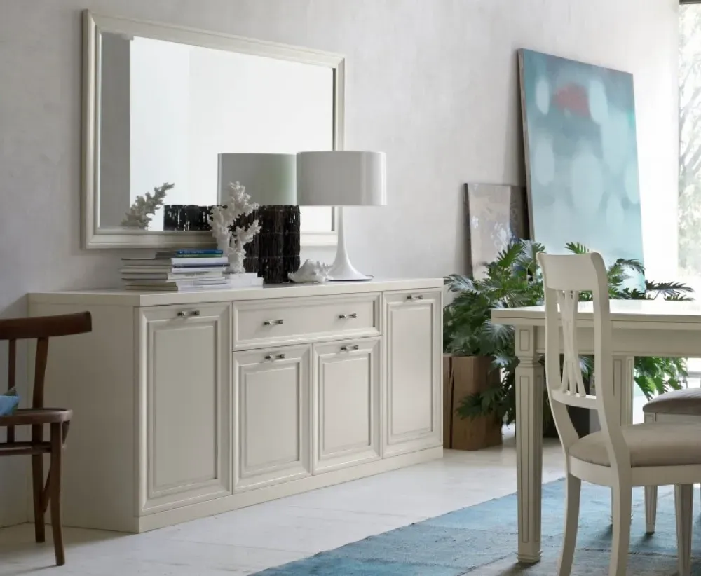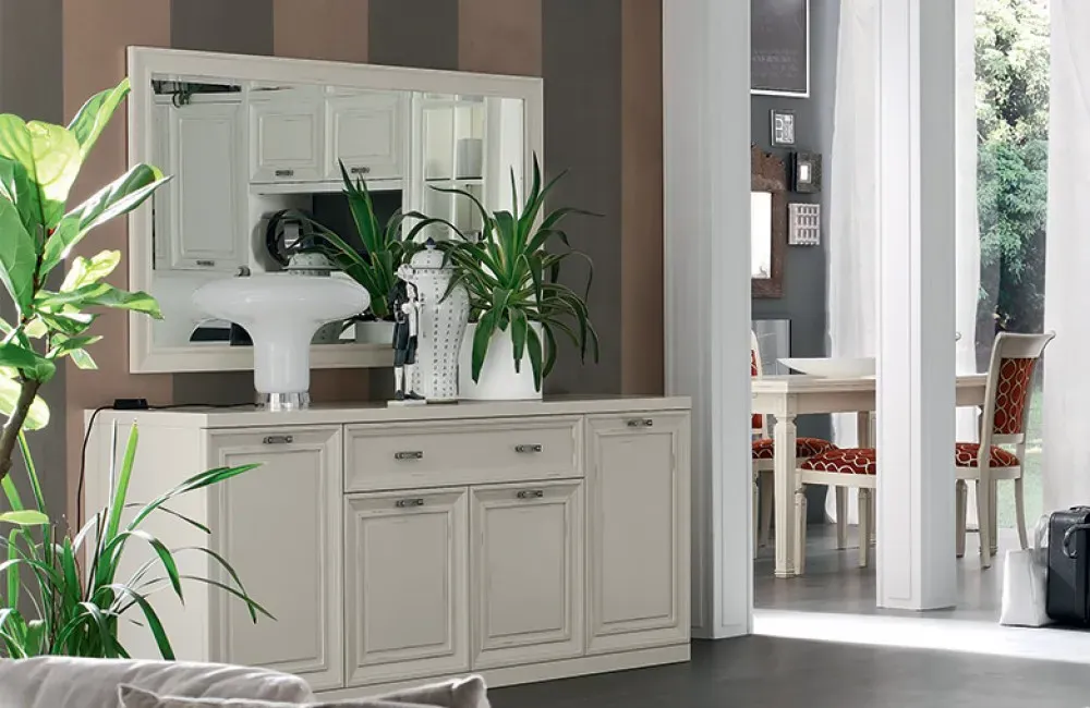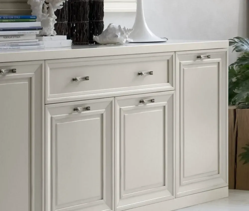 Madia da soggiorno classica con cornice modello Murano di Maronese Acf, finitura panna invecchiato su richiesta disponibile anche la finitura noce con scelta delle maniglie. Dimensioni composizione cm L.190 X P. 52 x h.82,4 oppure L.143 X P. 52 x h.82,4