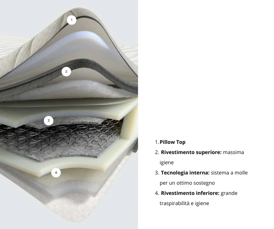 La sua struttura interna lavora in modo armonioso per distribuire il peso in maniera uniforme, favorendo una postura corretta e un rilassamento progressivo che accompagna il sonno per tutta la notte.