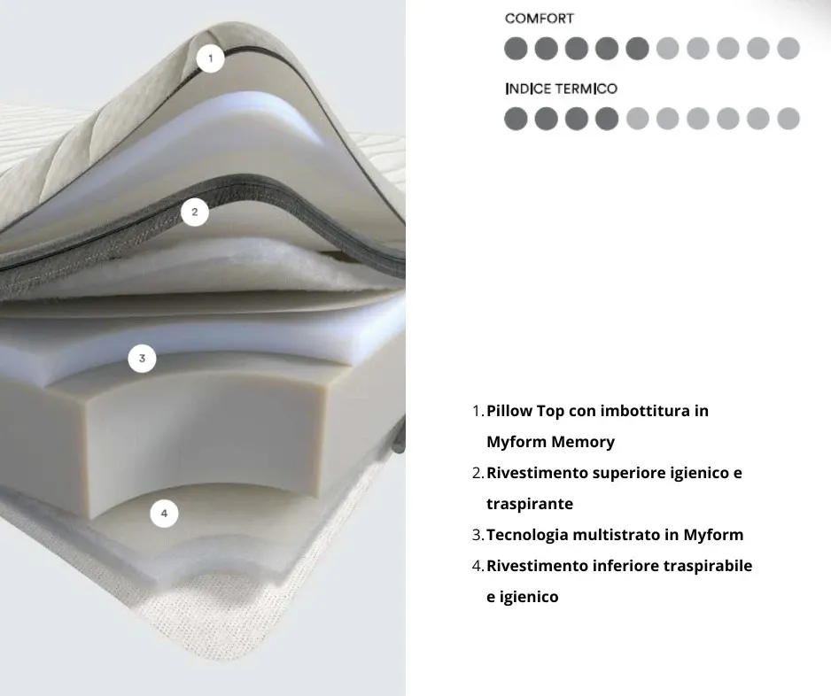 La struttura interna lavora in modo armonioso, distribuendo il peso senza creare punti di pressione e accompagnando i movimenti con una fluidità che rende il sonno più continuo e piacevole.