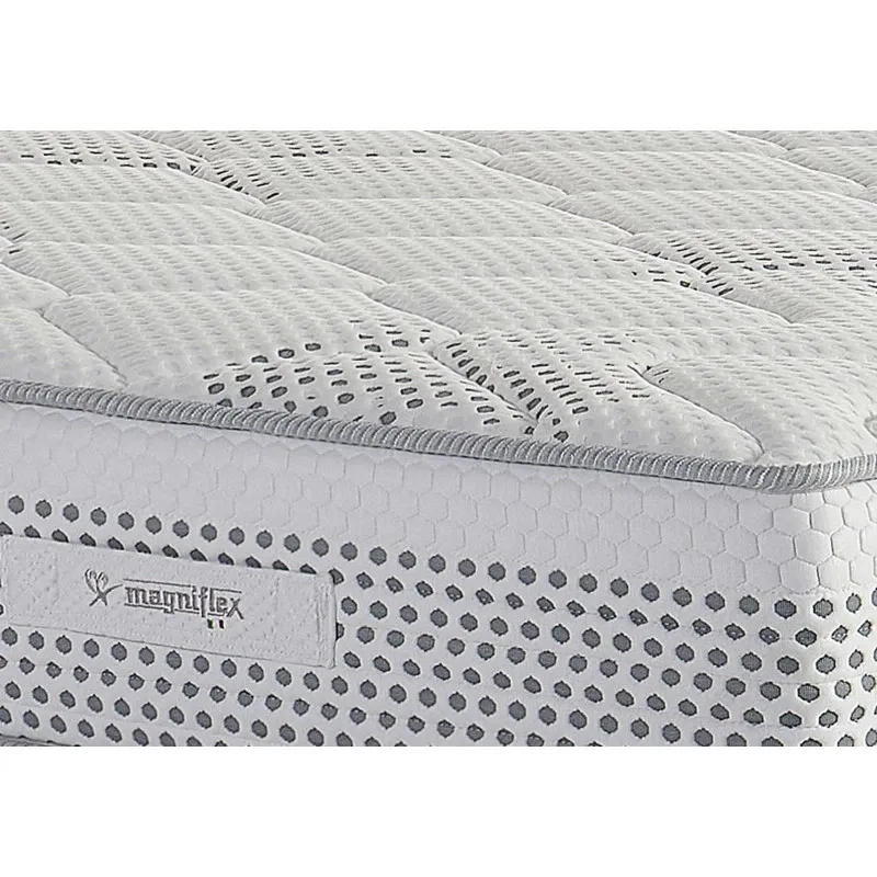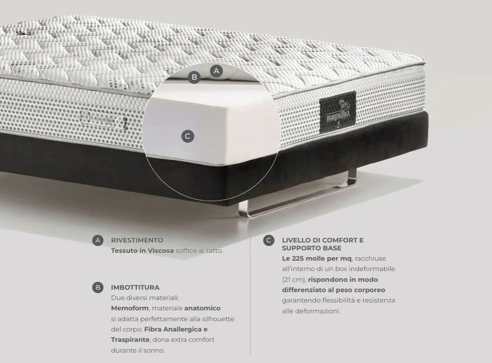 Materasso Sonno Spring Effect Magniflex linea Leggenda composto da una lastra in Memoform e molle insacchettate contenute in un box di poliuretano. Imbottitura interna in memoform, eliosoft e molle insacchettate, rivestimento in viscosa. Le molle insacchettate inserite sono realizzate in acciaio temperato 2.2, un materiale che garantisce flessibilità e resistenza alle deformazioni. Il Memoform è il più anatomico tra i materiali utilizzati, ed è studiato per reagire al peso del corpo e per adattarsi perfettamente a ogni silhouette.