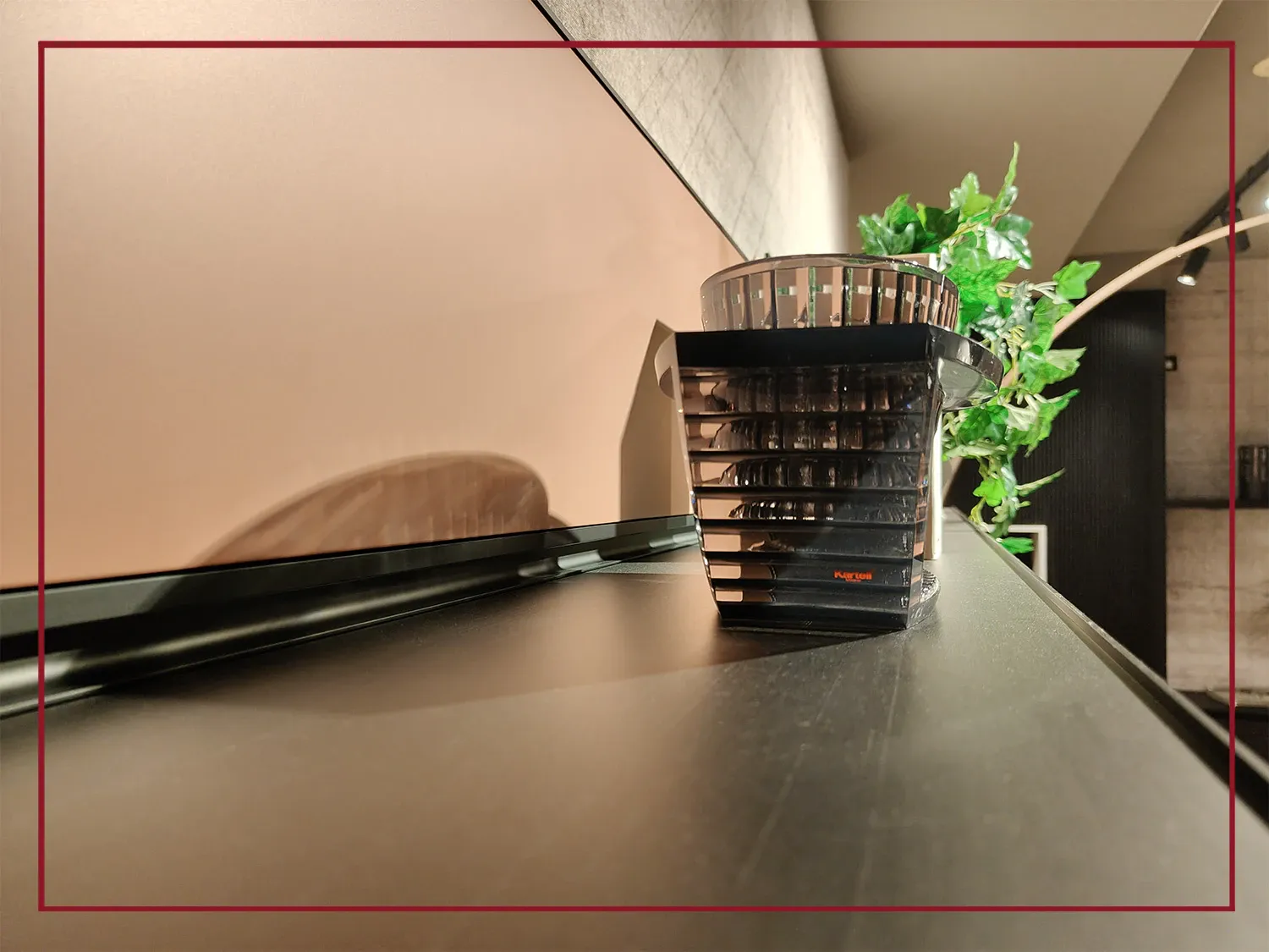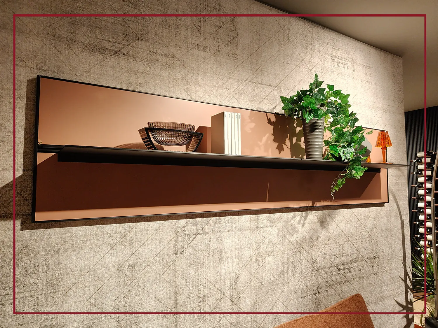 I pannelli, sono scanditi da profili e mensole in alluminio finitura Nero che creano un effetto grafico sofisticato, quasi decorativo, conferendo ritmo e profondità alla superficie.