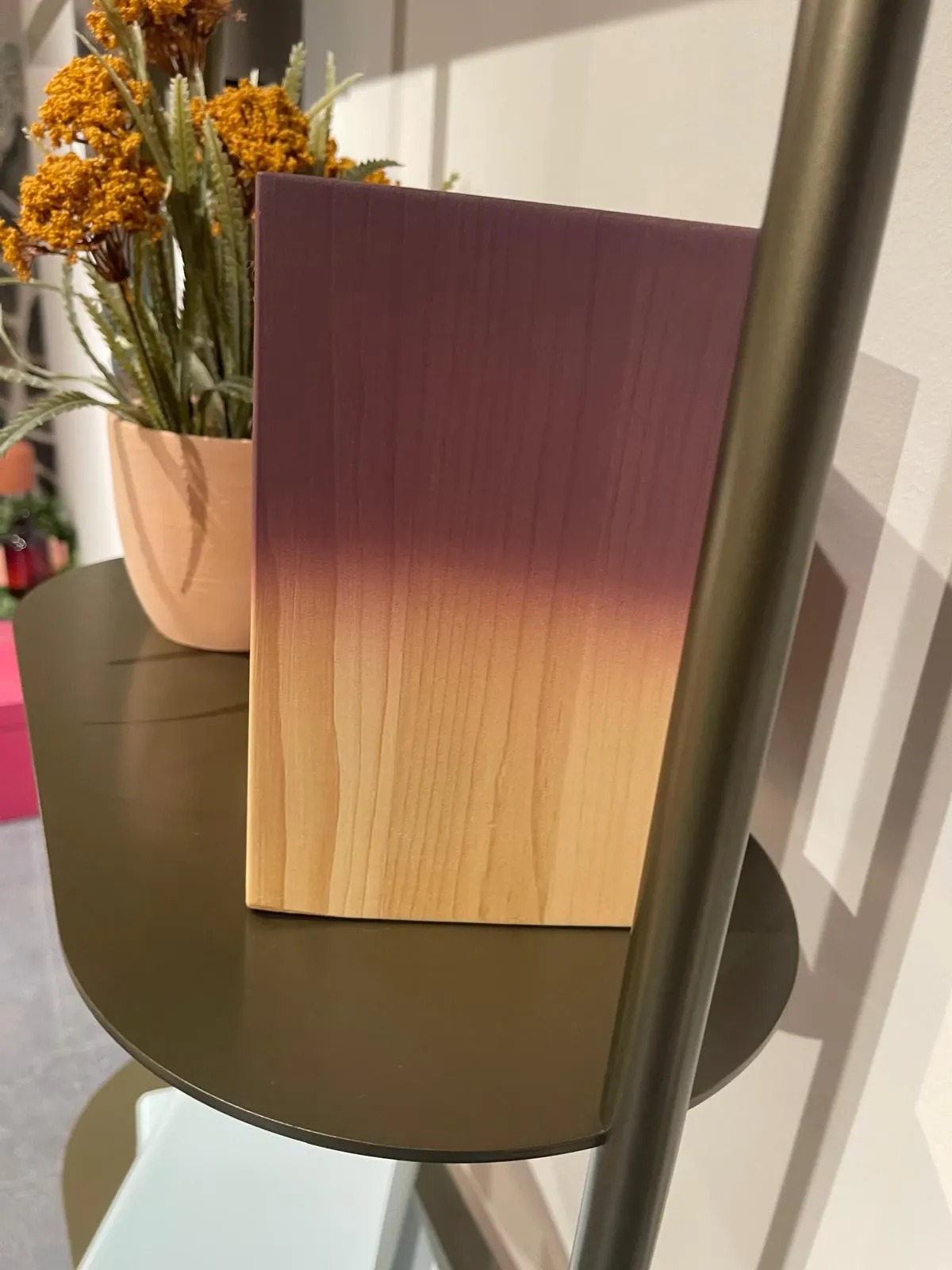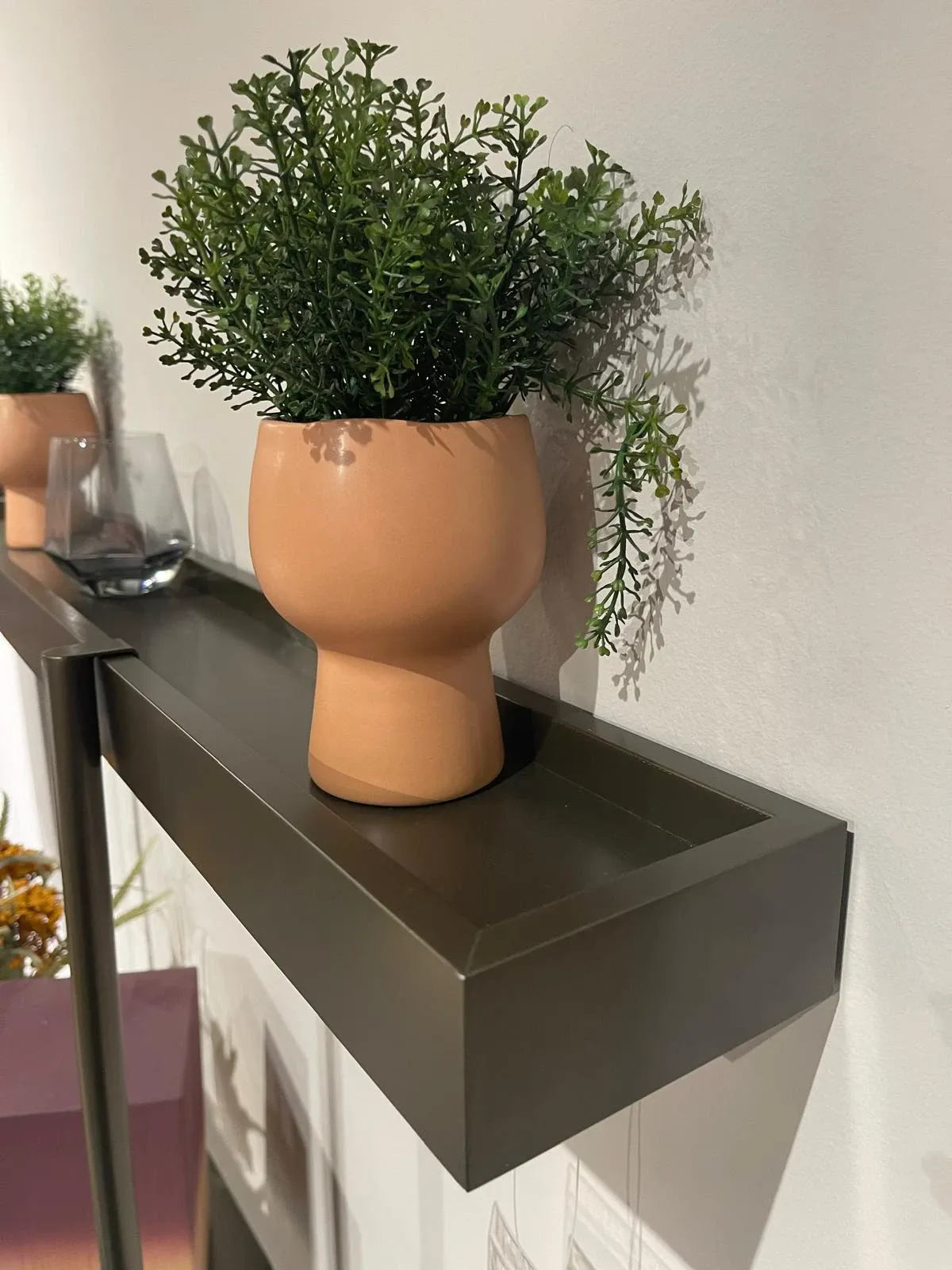 Realizzata in laccato Bronzo Ossidato, una finitura profonda e sofisticata, la mensola si sviluppa in larghezza (ben 225 cm) con una presenza leggera ma decisa. Il tocco dello specchio grigio, integrato nella composizione, crea un gioco di luci e riflessi che amplifica visivamente lo spazio, aggiungendo profondità e modernità.