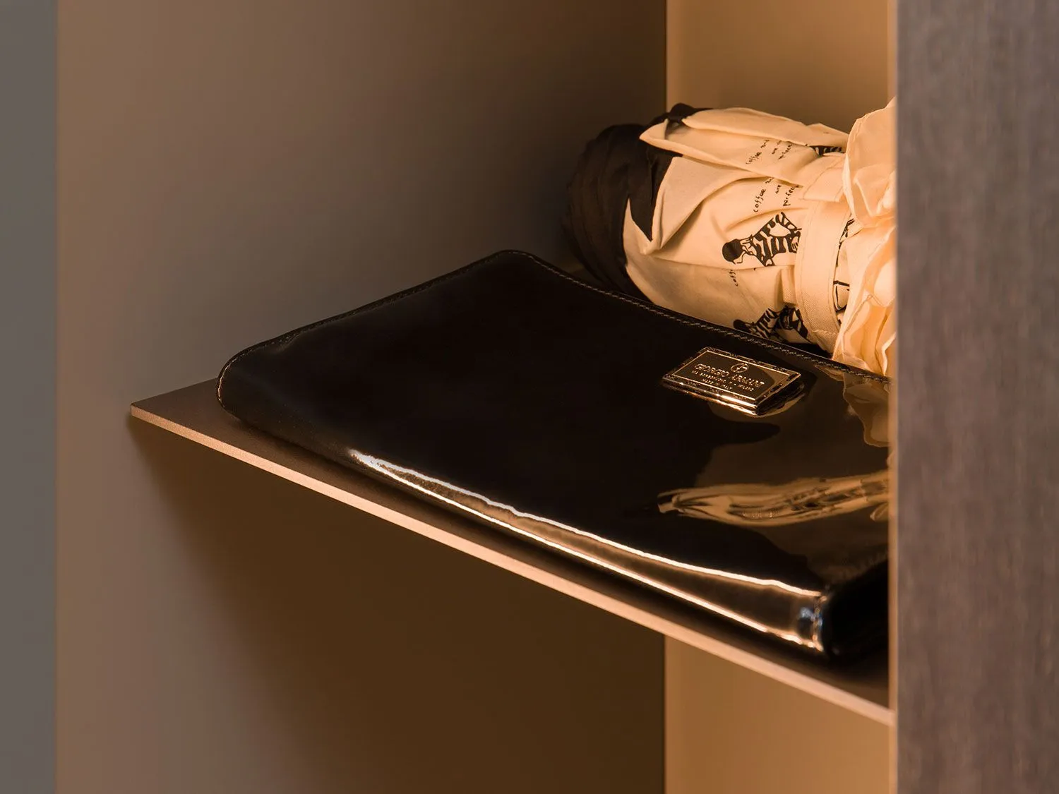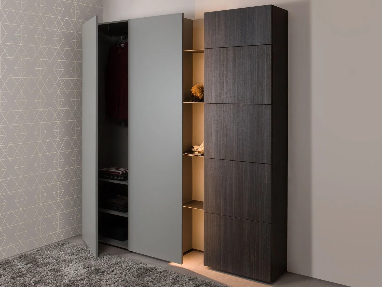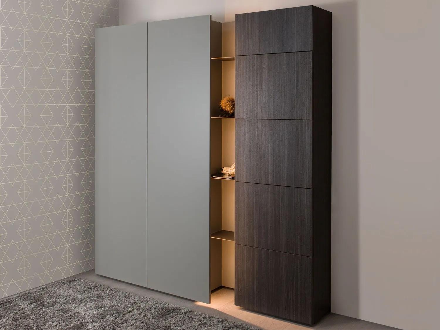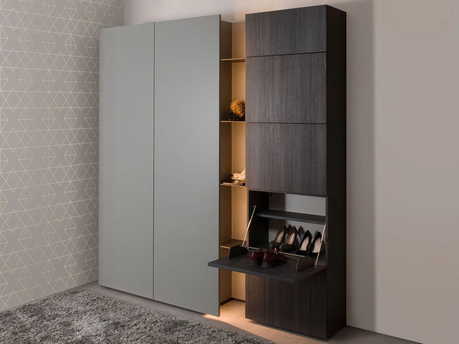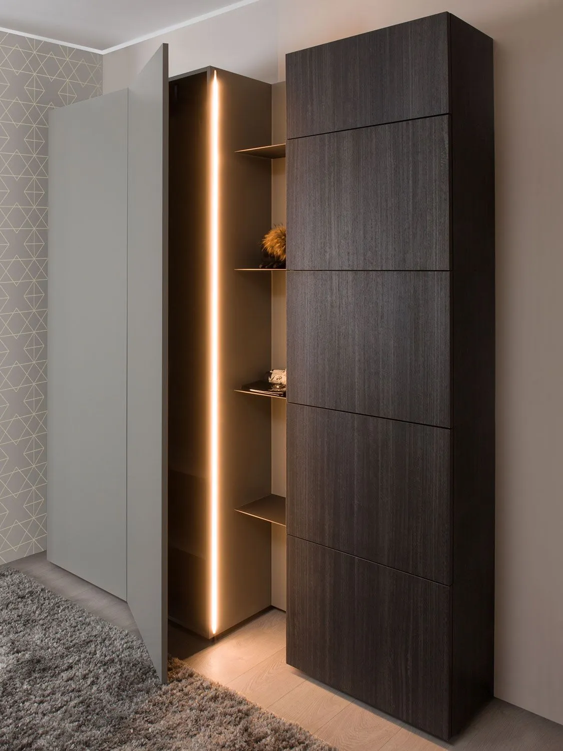 Caratteristiche - mobile ingresso con scarpiera e appendiabiti - moduli appendiabiti con ante battenti completi di appenderia superiore e due ripiani inferiori - modulo scarpiera con quattro ante ribalta sormontate superiormente da un contenitore battente - apertura di ante battenti e a ribalta con push-pull, per la massima pulizia formale del mobile - vano a giorno centrale con mensole metalliche, perfette anche come svuota-tasche - illuminazione indiretta del vano a giorno con barra LED incassata sul fianco