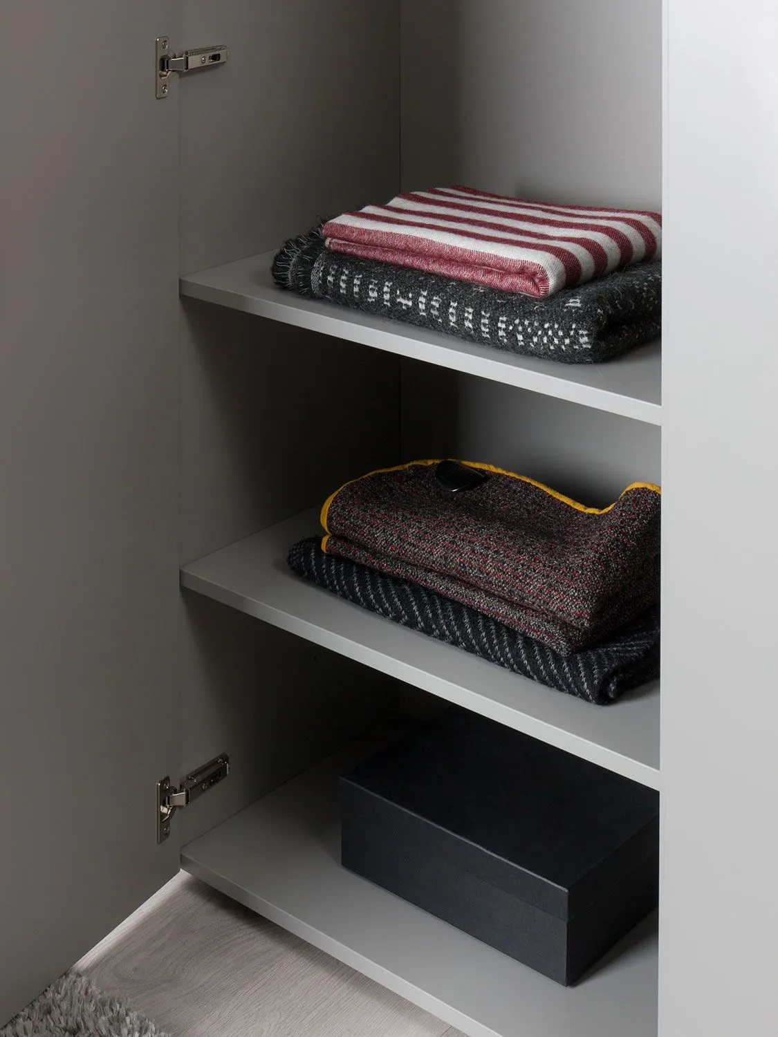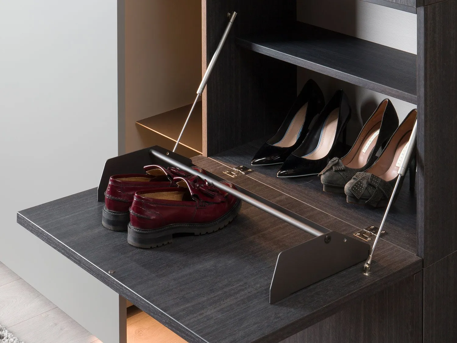 Plan 37 Outlet è un mobile da ingresso con scarpiera e appendiabiti, progettato con una profondità contenuta ma in grado di garantire un’elevata capacità di contenimento. La composizione include un modulo con due ante battenti e quattro vani a ribalta sovrapposti, completati da un quinto scomparto superiore con apertura a battente. Nonostante le dimensioni compatte, offre una soluzione funzionale con una scarpiera capiente suddivisa in quattro moduli e un ampio spazio dedicato all’appendiabiti, separati da un pratico vano a giorno centrale. Gli elementi appendiabiti sono dotati di due ripiani in legno per ottimizzare l’organizzazione interna. Il vano a giorno, valorizzato da una barra LED incassata lateralmente, si trasforma in un comodo svuotasche grazie alla presenza di quattro sottili mensole in metallo, perfette anche per esporre oggetti decorativi.