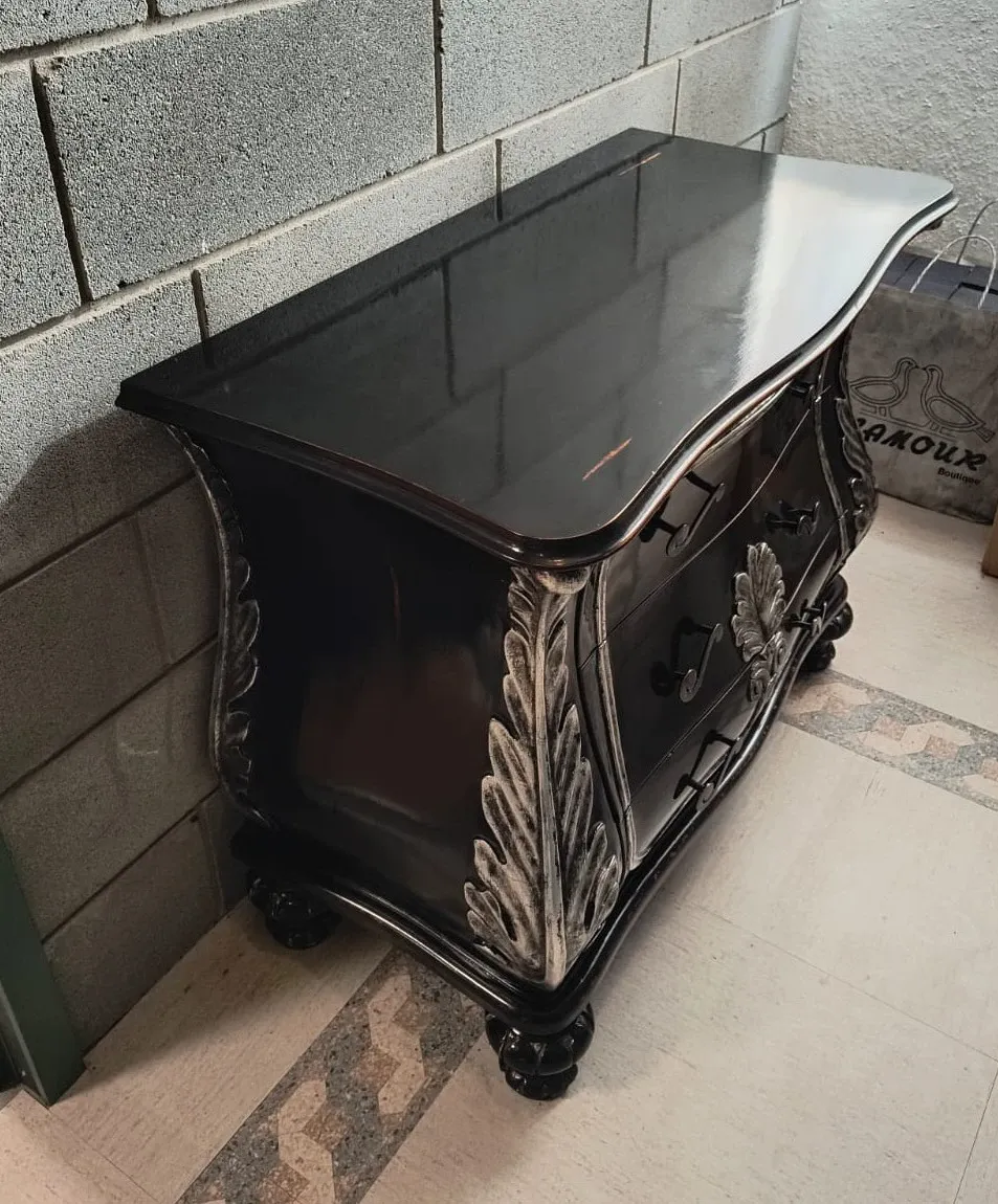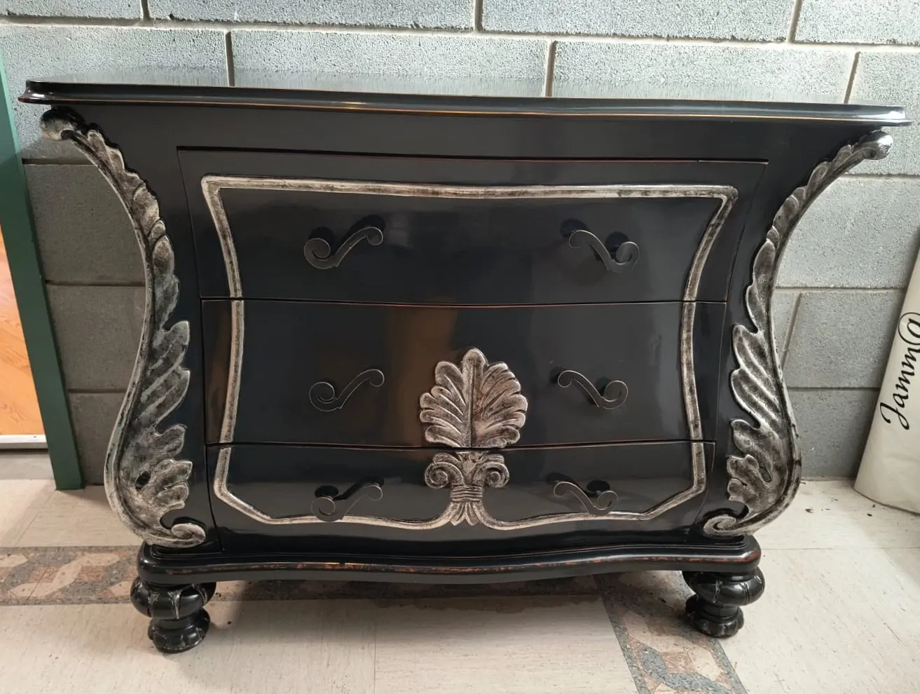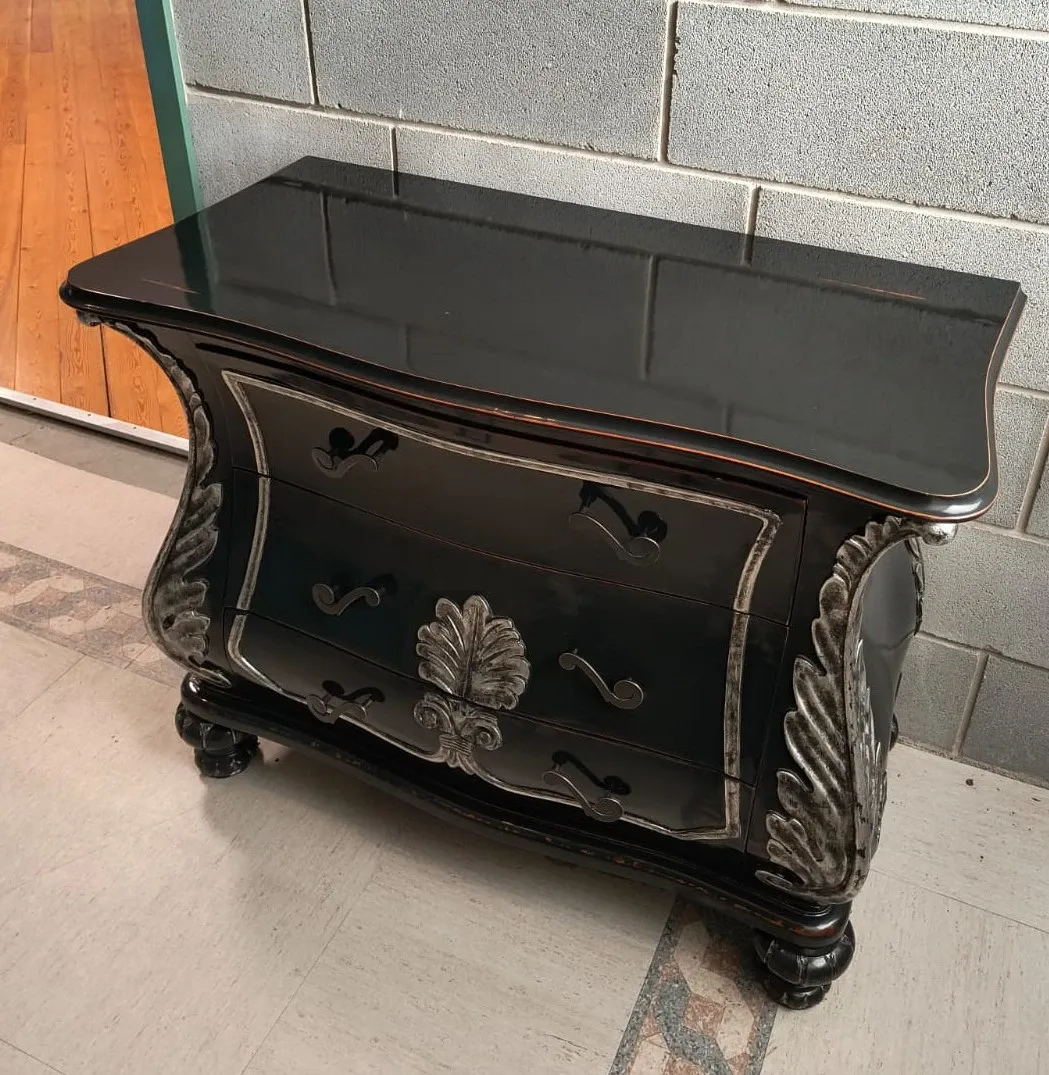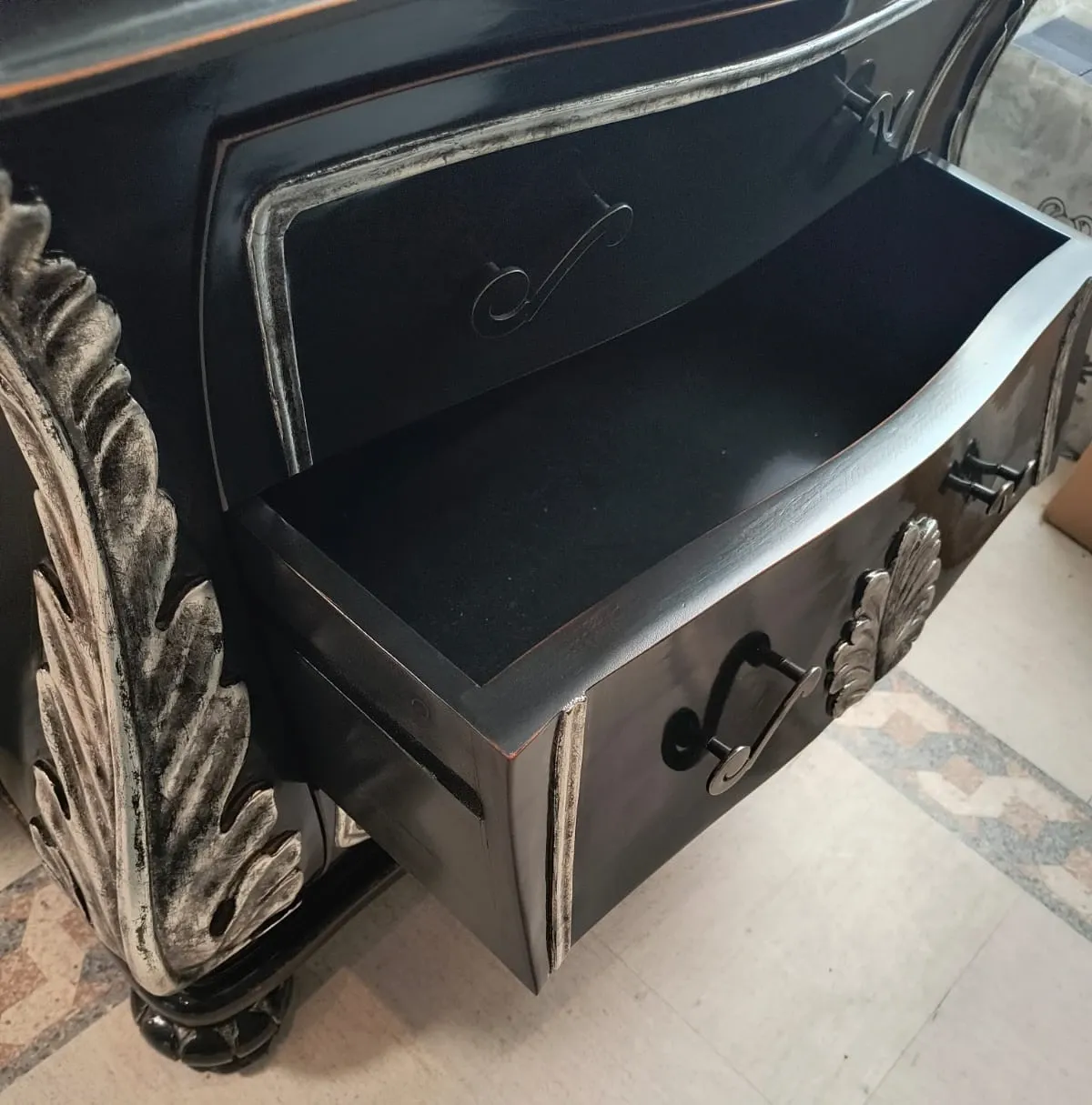 Mobile da ingresso artigianale , completamente massiccia e intagliata a mano , laccata liquerizia con dettagli in foglia argento patinata , misure 97x48x75h ,ULTIMO PEZZO DISPONIBILE