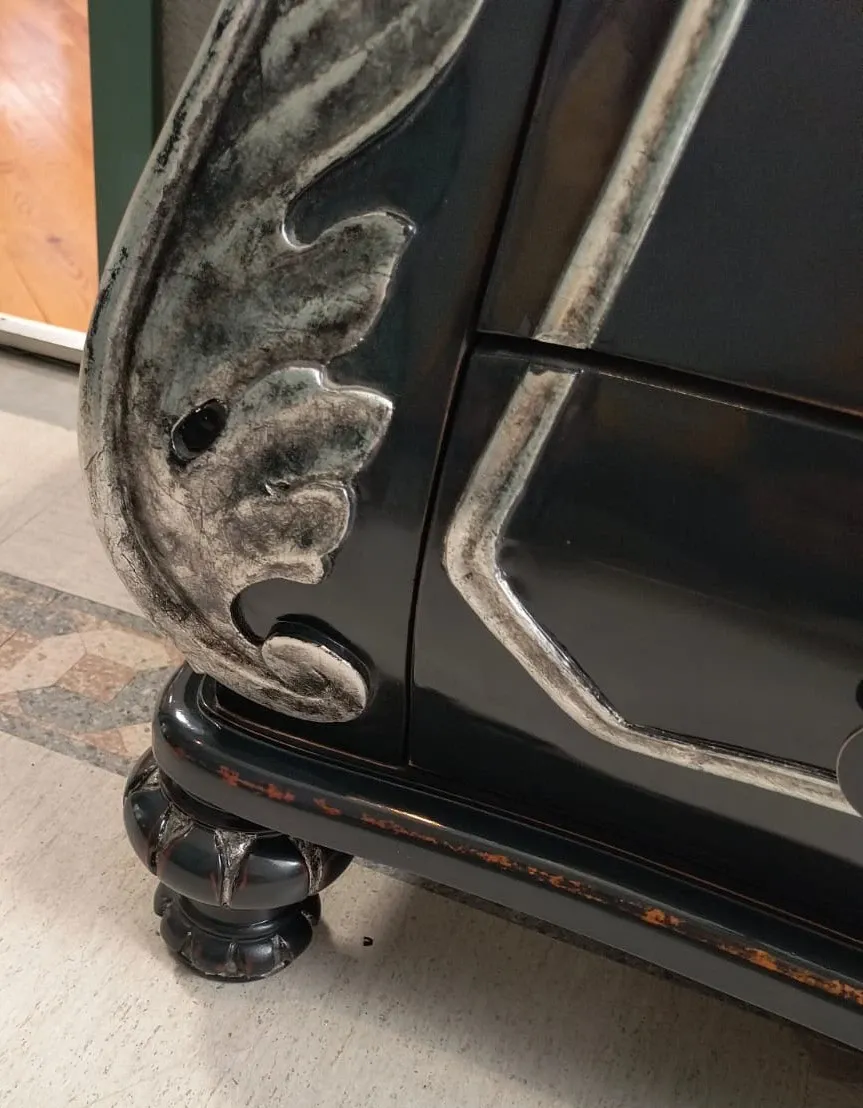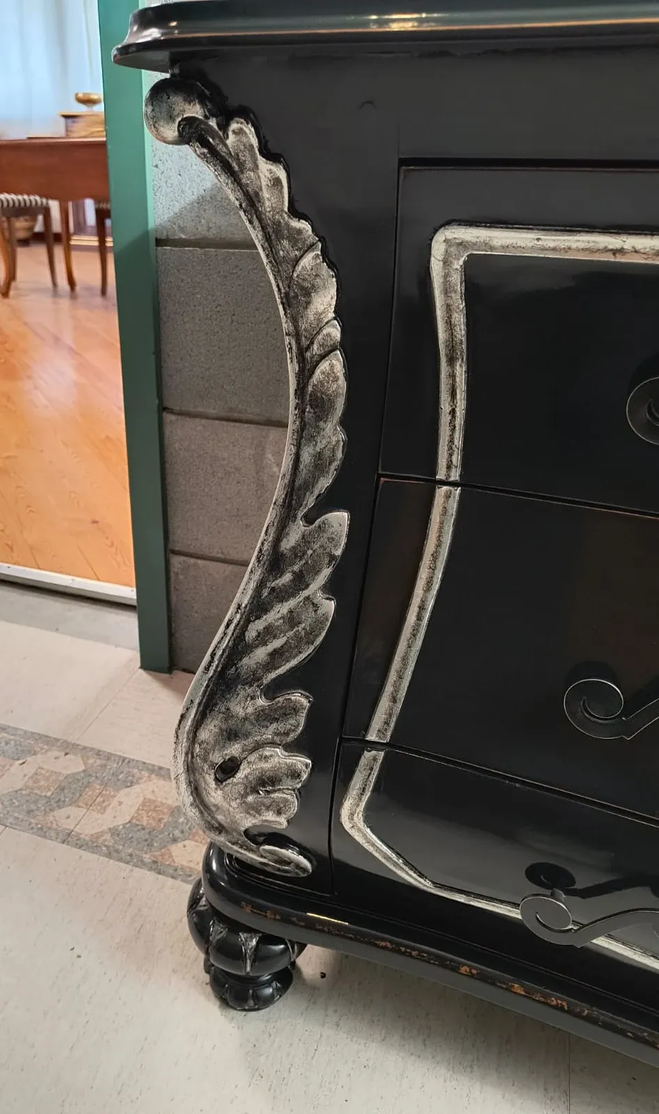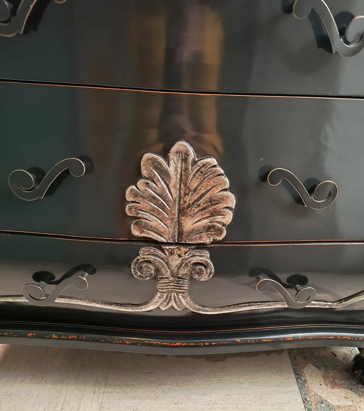 Un pezzo unico di alta artigianalità, questo mobile da ingresso è interamente realizzato in legno massello e intagliato a mano, espressione autentica della maestria artigiana italiana. La raffinata finitura laccata color liquerizia, abbinata ai dettagli in foglia argento patinata, dona un tocco di eleganza sofisticata e senza tempo.