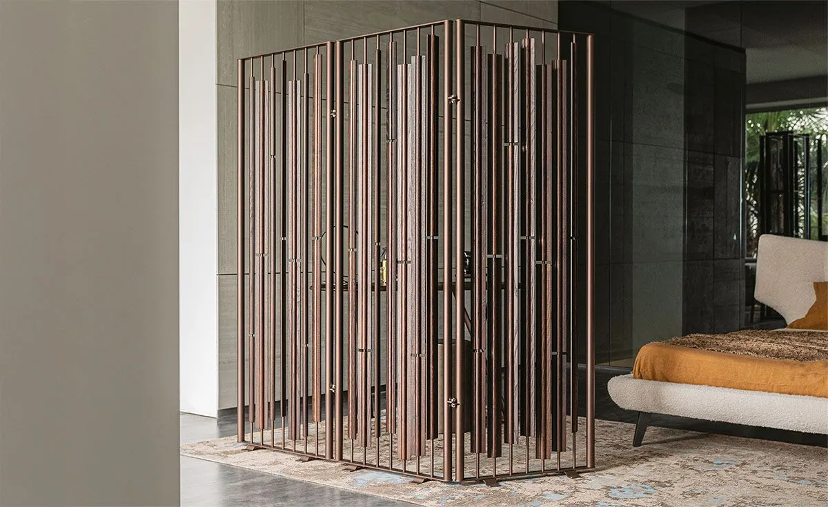Separé modulare con elementi girevoli in frassino tinto noce Canaletto (frNC) o frassino tinto rovere bruciato (frRB) e con struttura in metallo verniciato goffrato titanio (GFM11) o bronzo (GFM18). Dimensioni cm.199x183h.x15 sono tre moduli assemblati, disponibili anche singoli o doppi Informativa tecnica Struttura in acciaio verniciato a polveri epossidiche. Palette in legno massello di frassino tinto Contattateci per qualsiasi informazione o richiesta