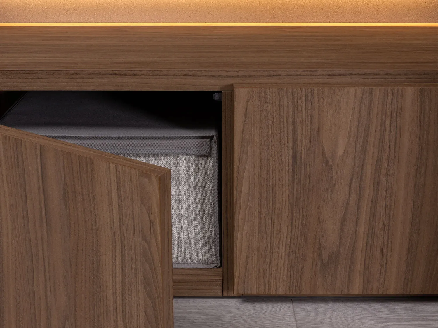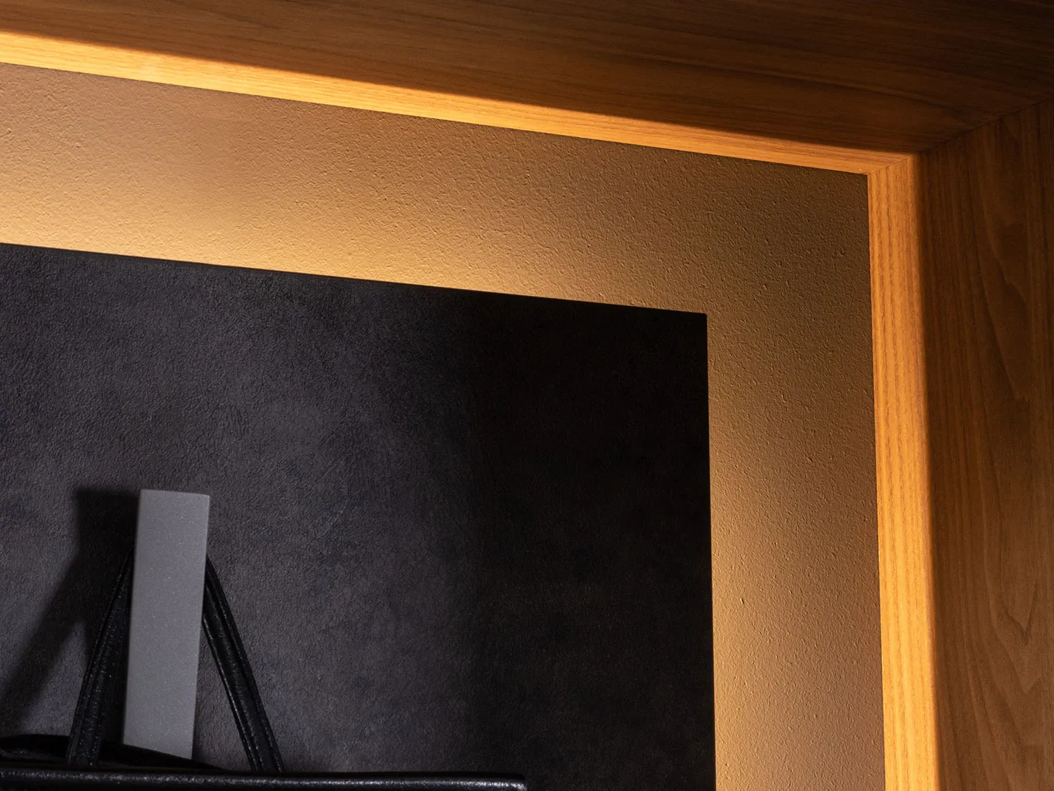 La finitura effetto legno, calda e naturale, si abbina armoniosamente allo schienale del vano a giorno, dando vita a un raffinato contrasto materico e a una composizione dal gusto contemporaneo.
