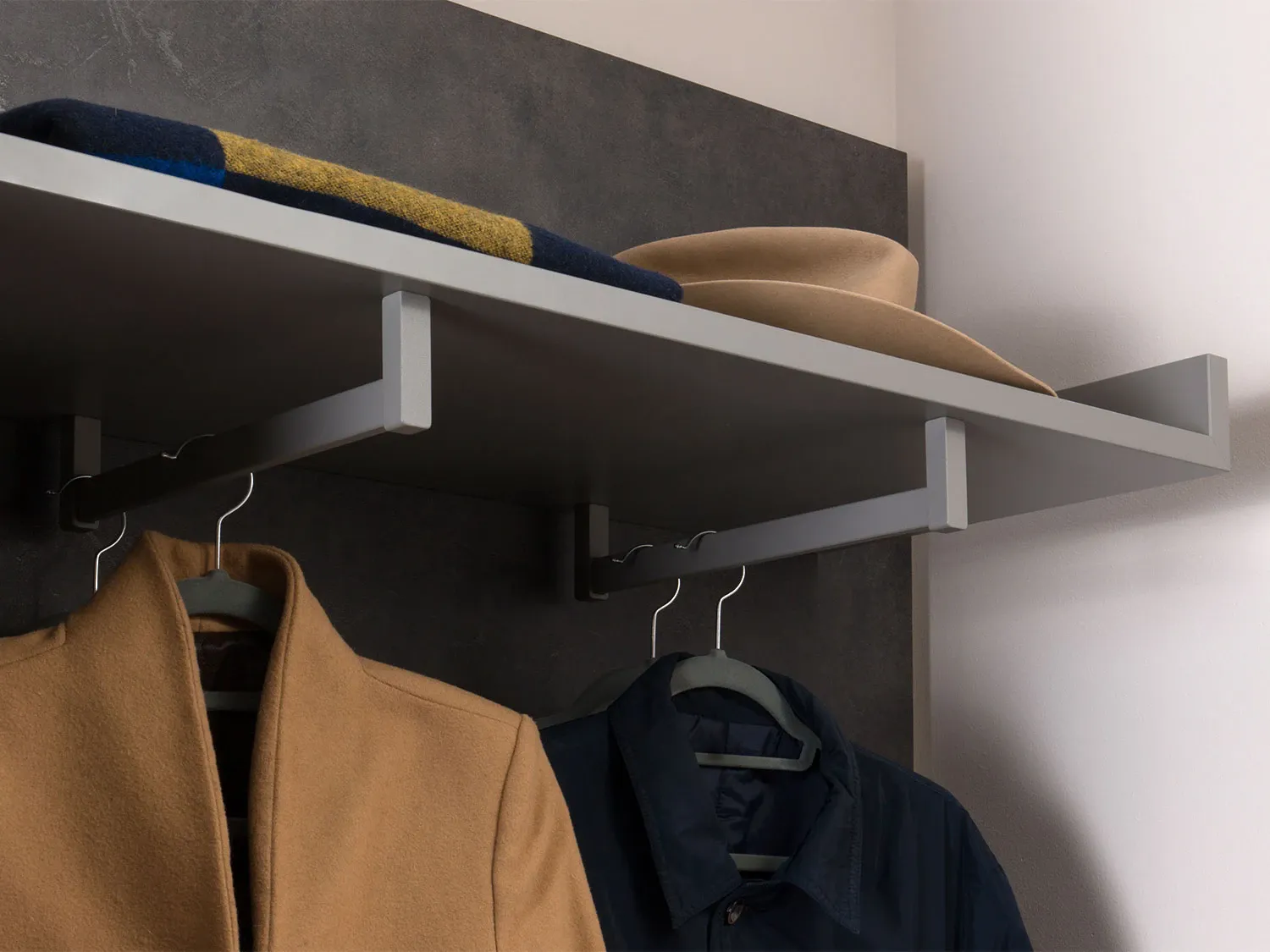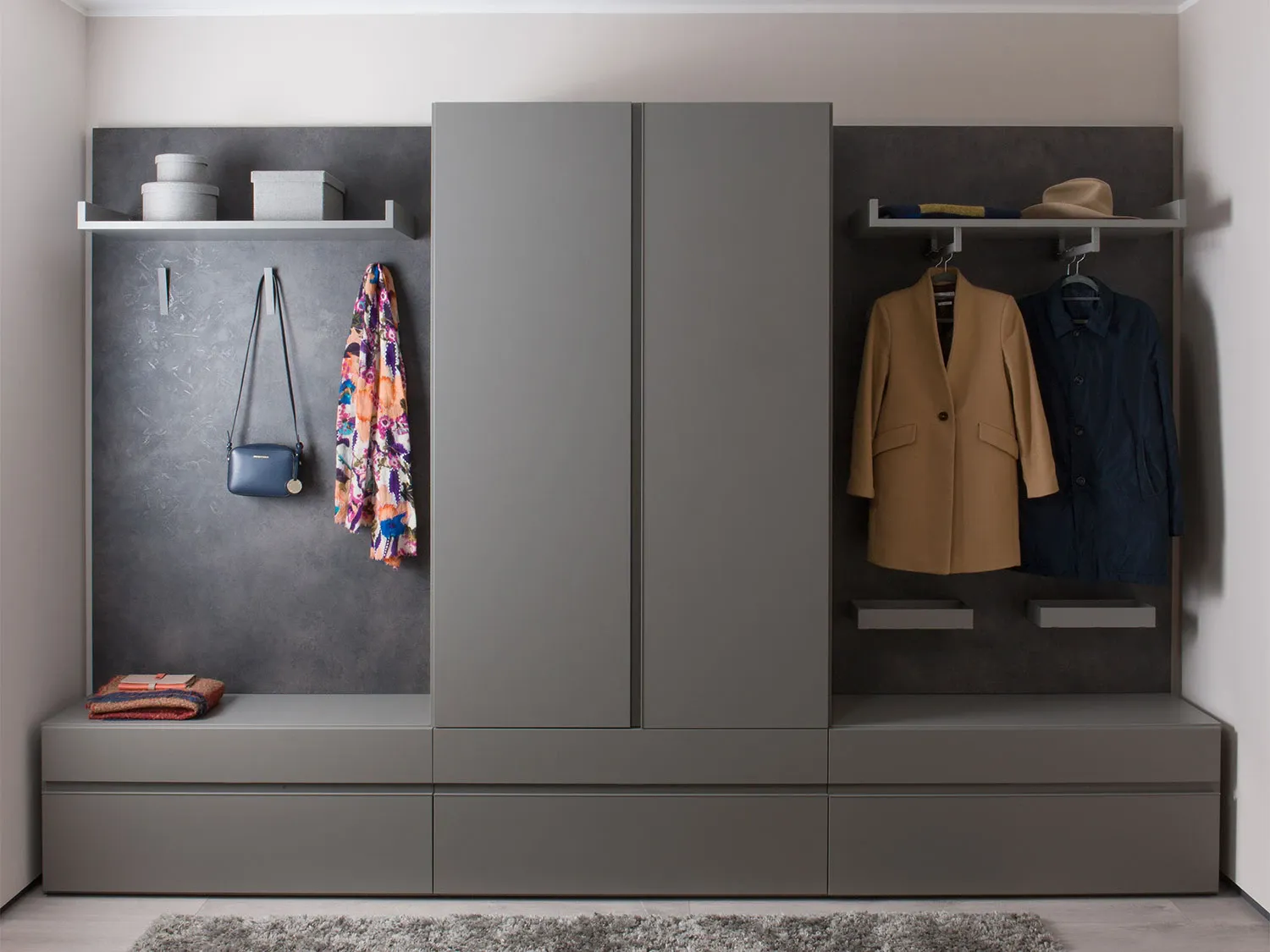 La parete si sviluppa in modo armonioso e simmetrico: al centro, l'armadio con due ante battenti, completo di ripiani e tubi appendiabiti, accoglie cappotti, giacche e accessori garantendo ampia capacità contenitiva e ordine visivo. Ai lati, due moduli attrezzati con pannello schienale effetto materico valorizzano la composizione creando un raffinato contrasto materico.