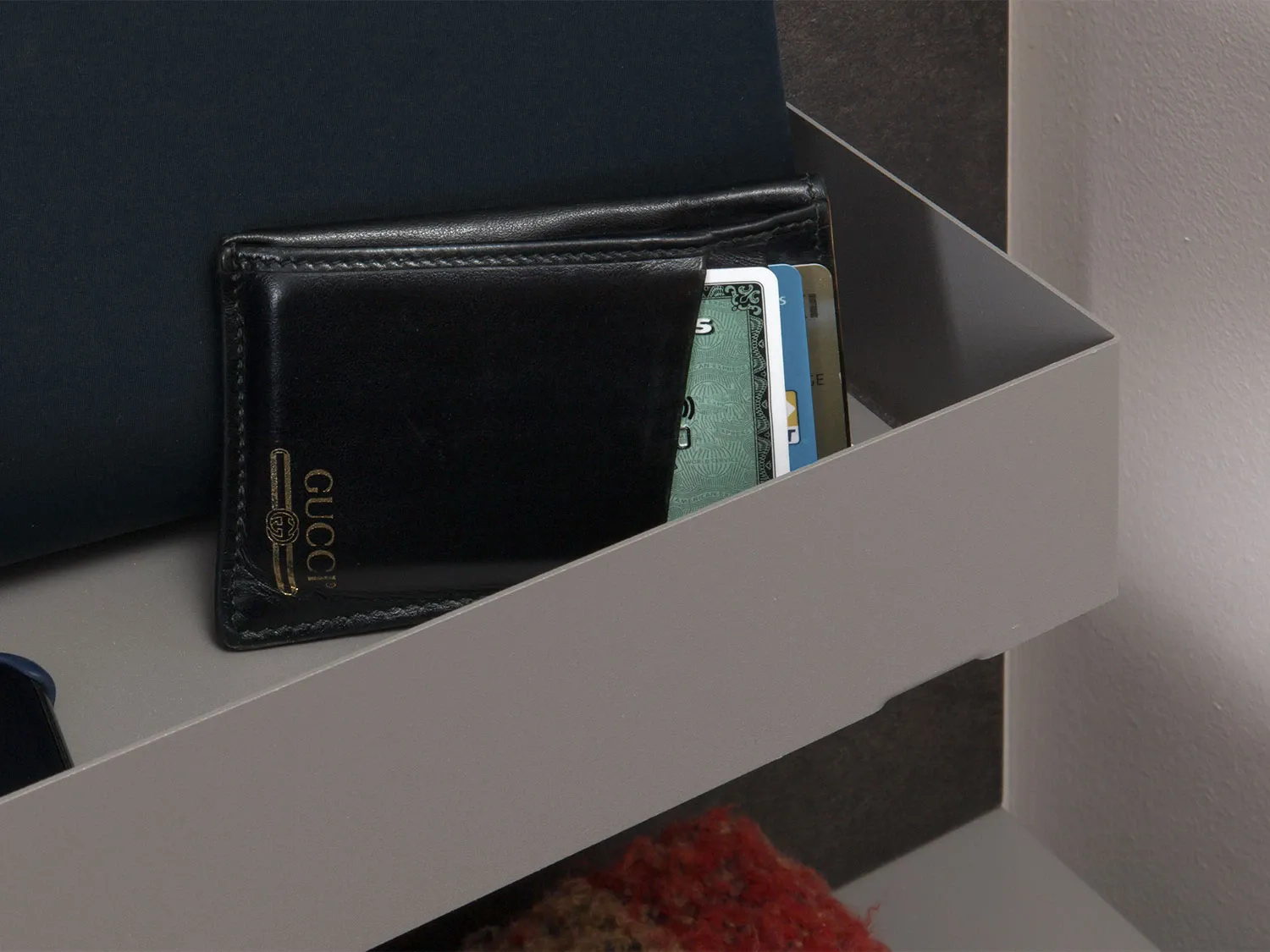 A corredo della composizione, due pratiche vaschette svuota-tasche in metallo fissate allo schienale, ideali per riporre chiavi, portafoglio e piccoli oggetti.