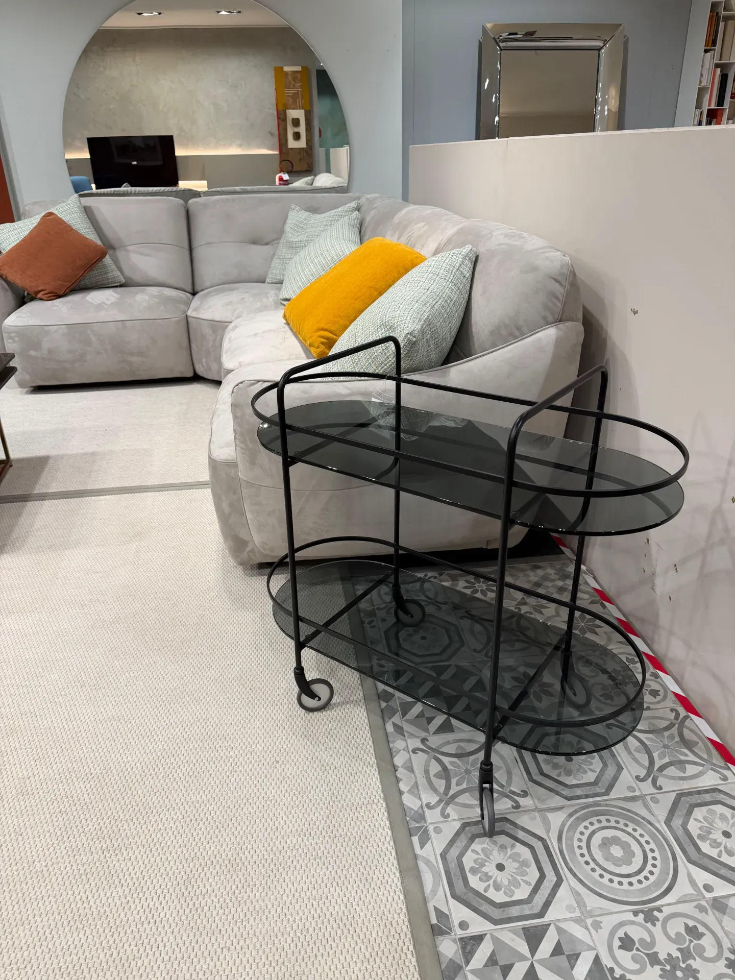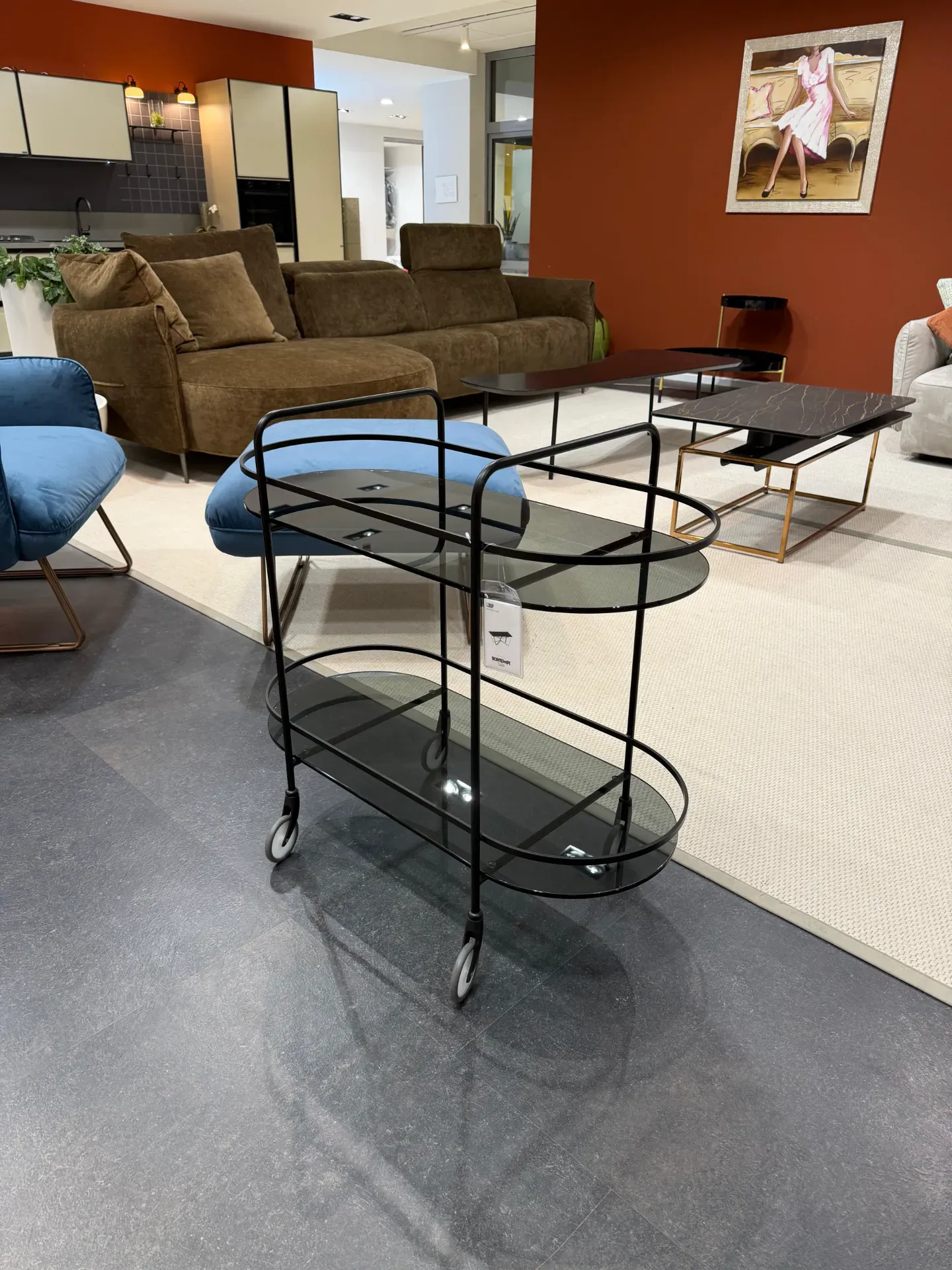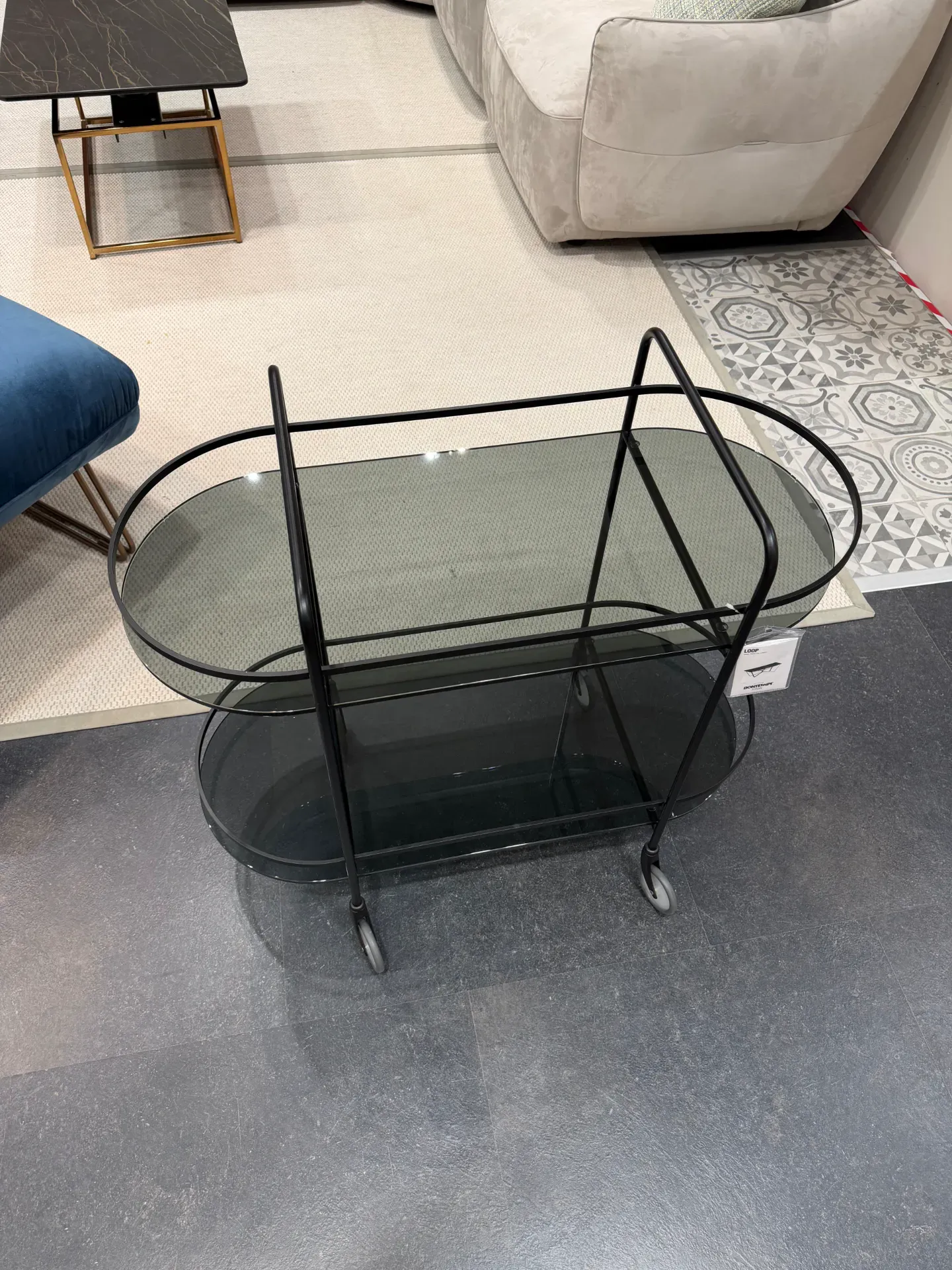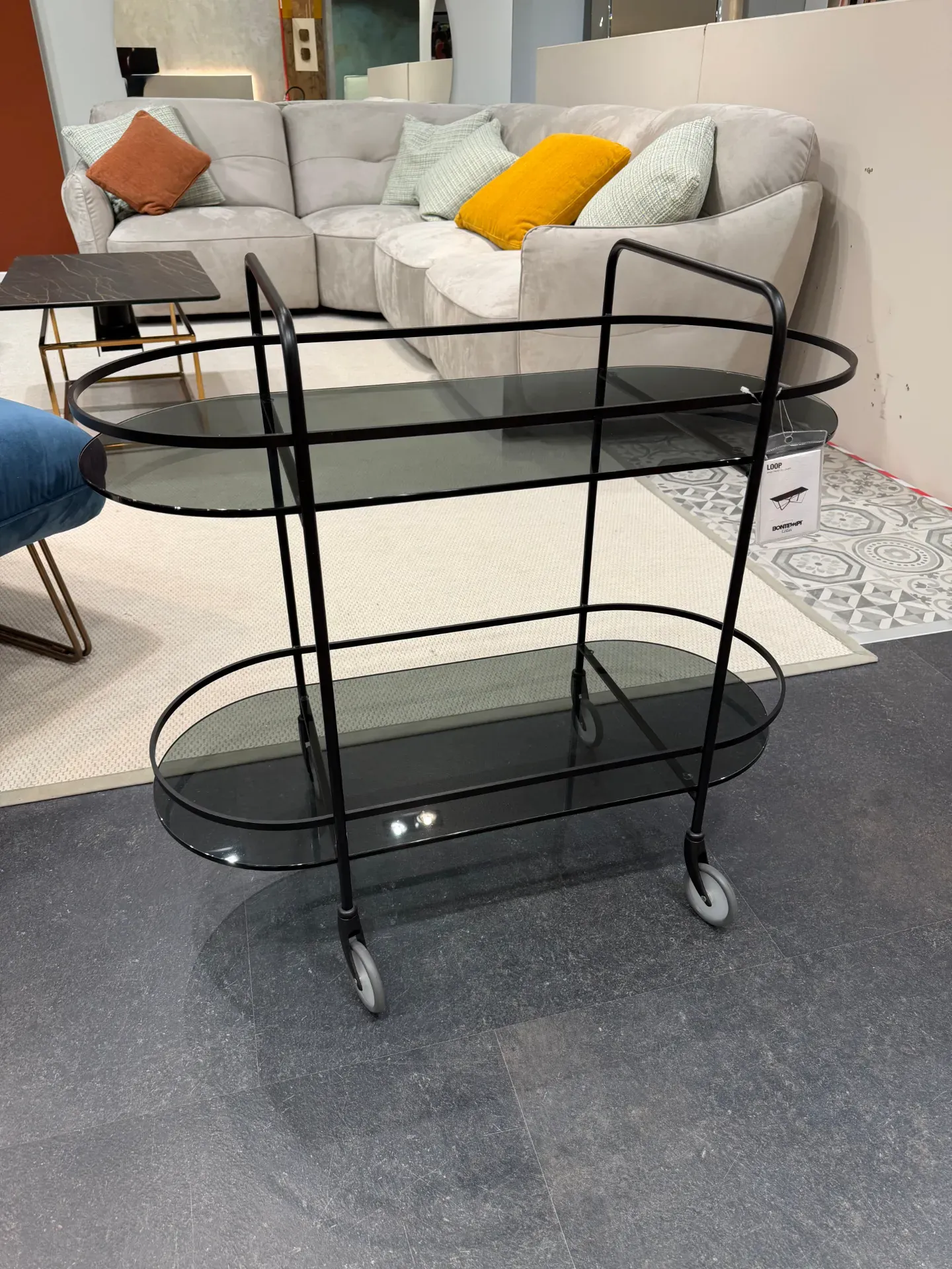 La versatilità è un punto di forza: il carrello, con struttura in metallo e ripiani in vetro fumè, è ideale per living, sala da pranzo o ambienti contract, ed è facile da spostare grazie alle ruote.