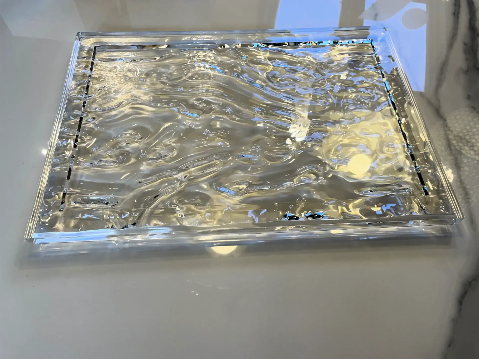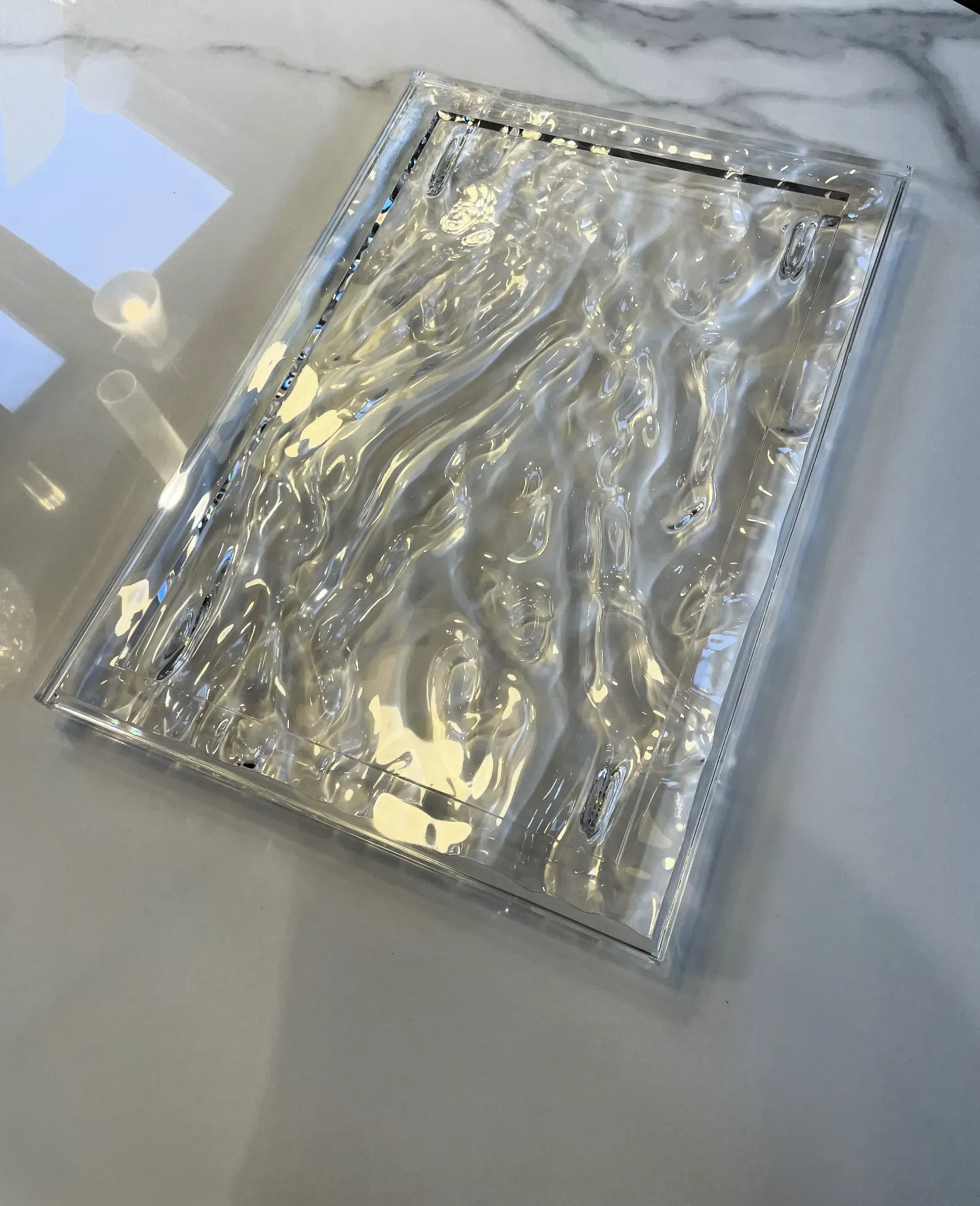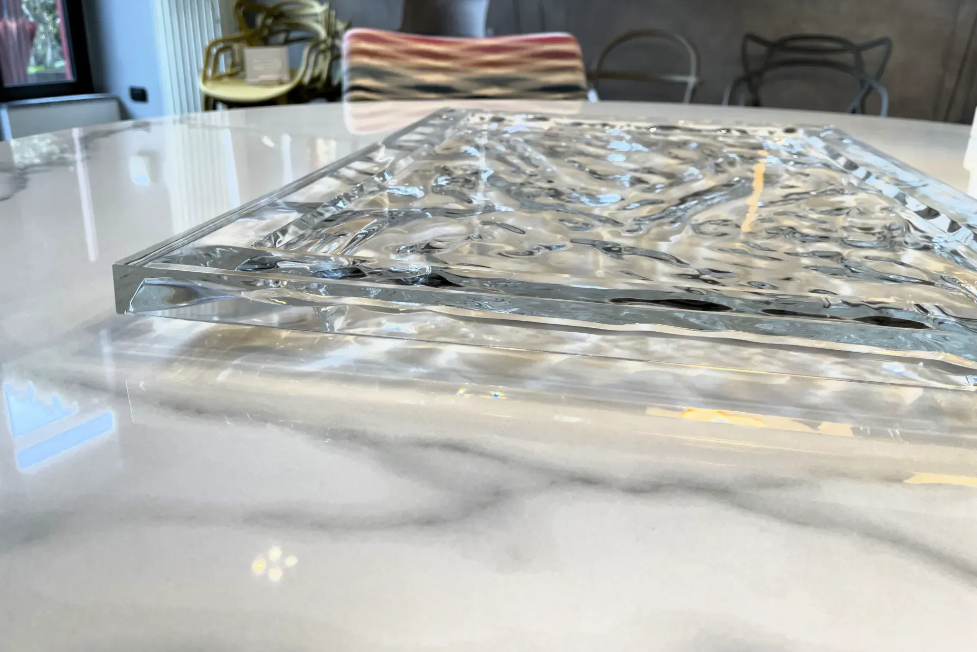 La finitura trasparente del vassoio amplifica la sua capacità di riflettere e rifrangere la luce, creando un effetto cangiante che arricchisce qualsiasi ambiente. Che sia utilizzato per servire o come elemento decorativo, il Dune Big aggiunge un tocco di eleganza moderna a ogni occasione.