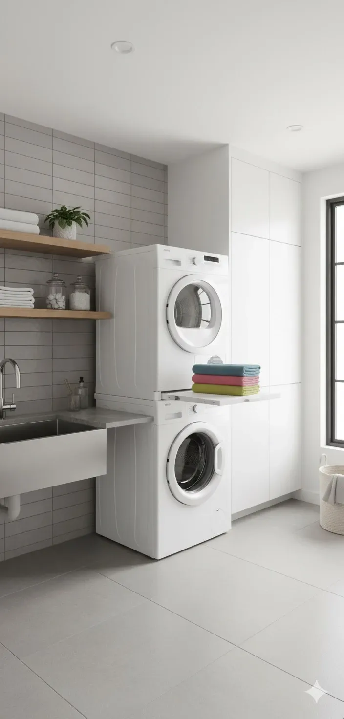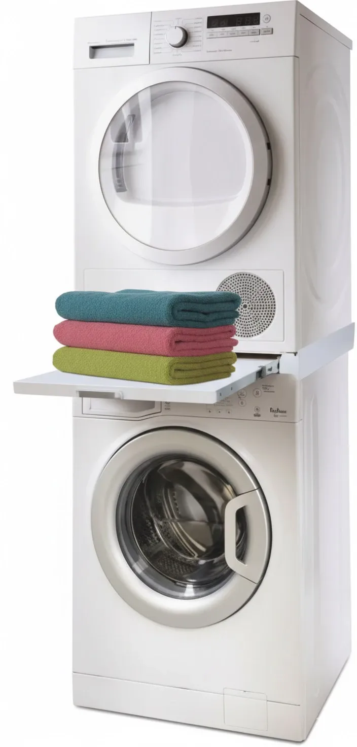 Supporto in acciaio verniciato bianco anticorrosione con ripiano estraibile, per sovrapporre lavatrici ed asciugatrici ed asciugatrici di qualsiasi marca: