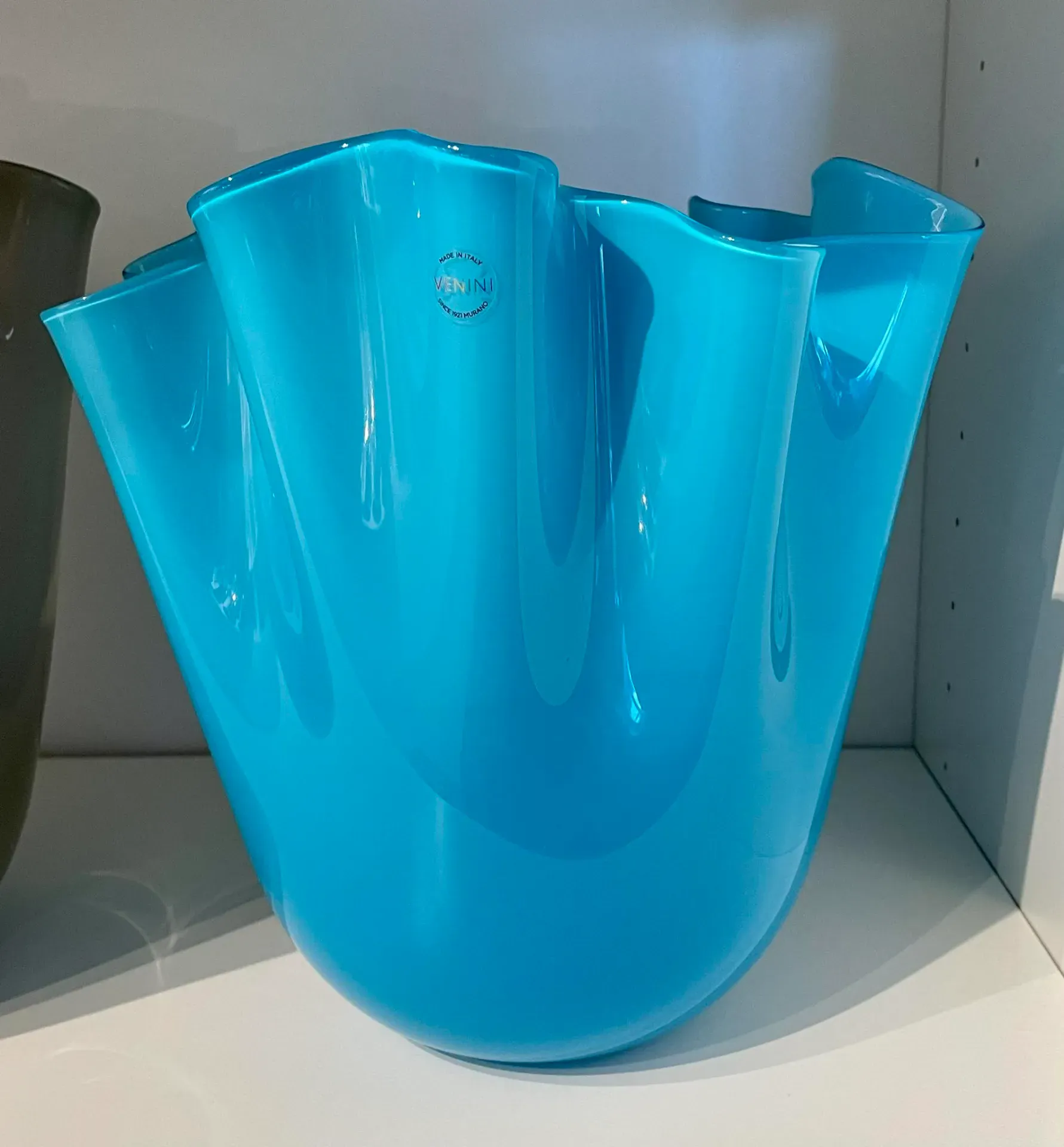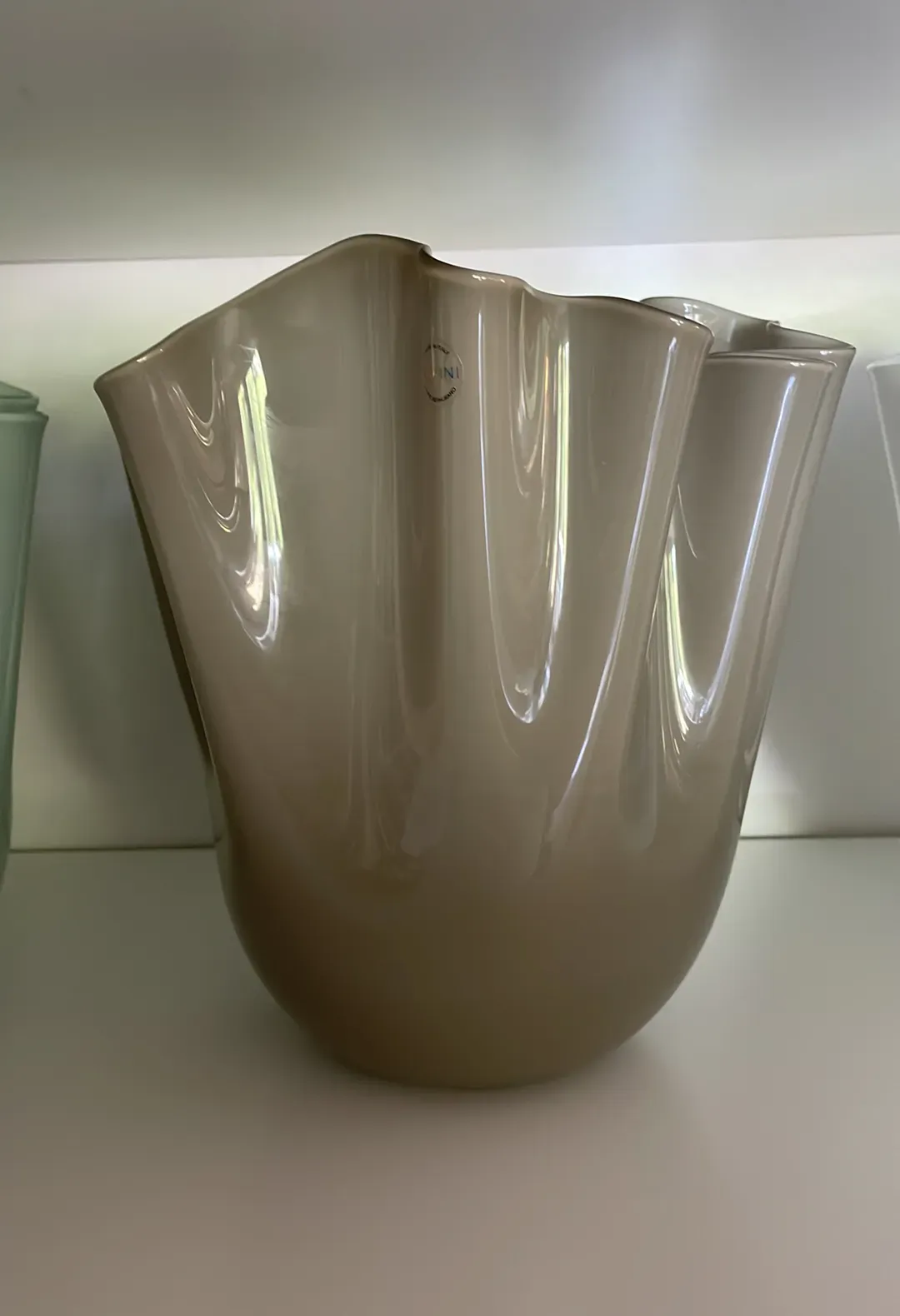 Vaso Fazzoletto opalino Venini 700.02. Il Fazzoletto è uno dei simboli di Venini, da quasi 50 anni presente in tutte le esposizioni, le pubblicazioni e nei Musei di tutto il Mondo. Disegnato da Fulvio Bianconi e Paolo Venini nel 1948. Diametro 20 cm x H 24 cm. Disponibile in diversi colori.