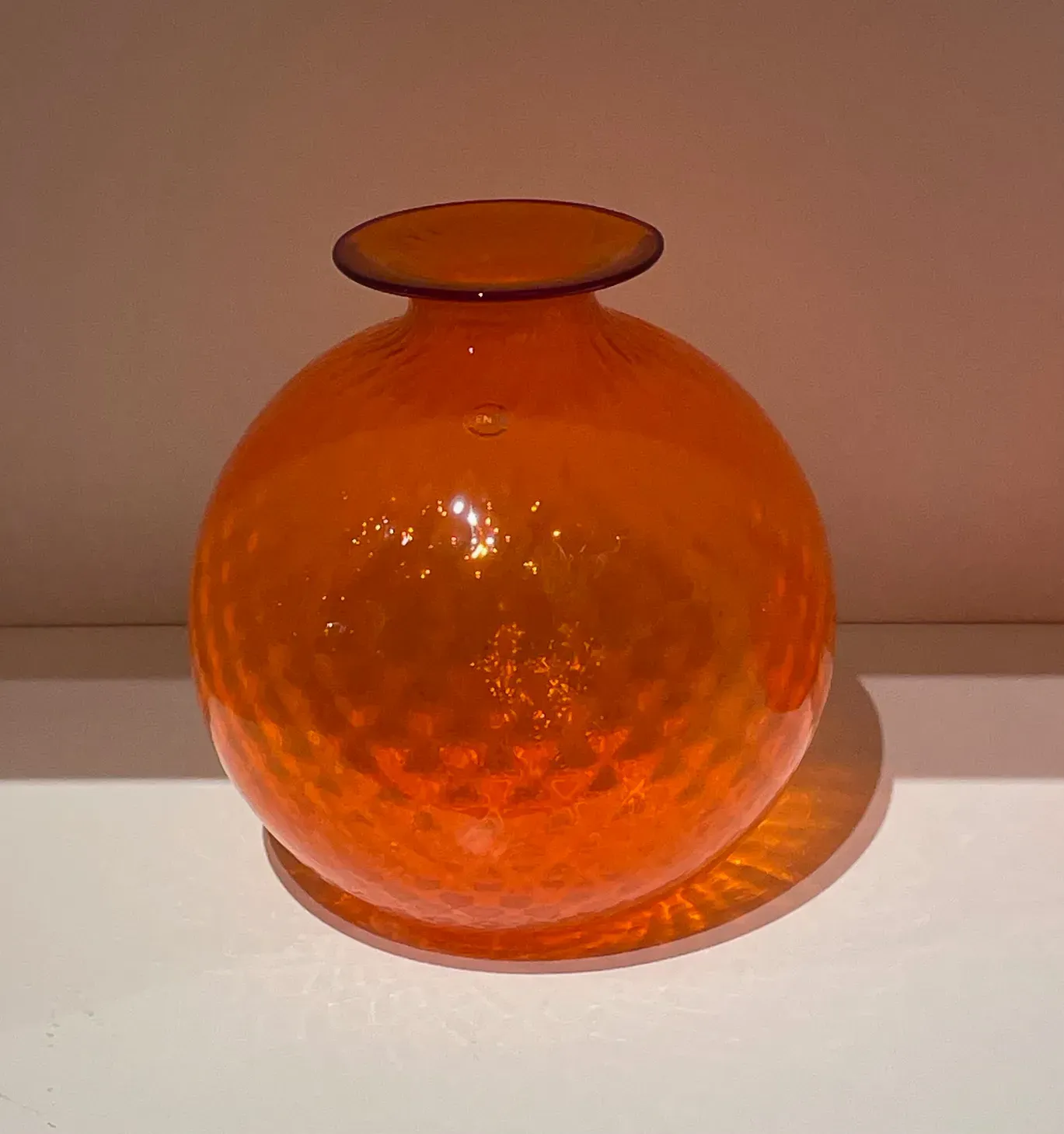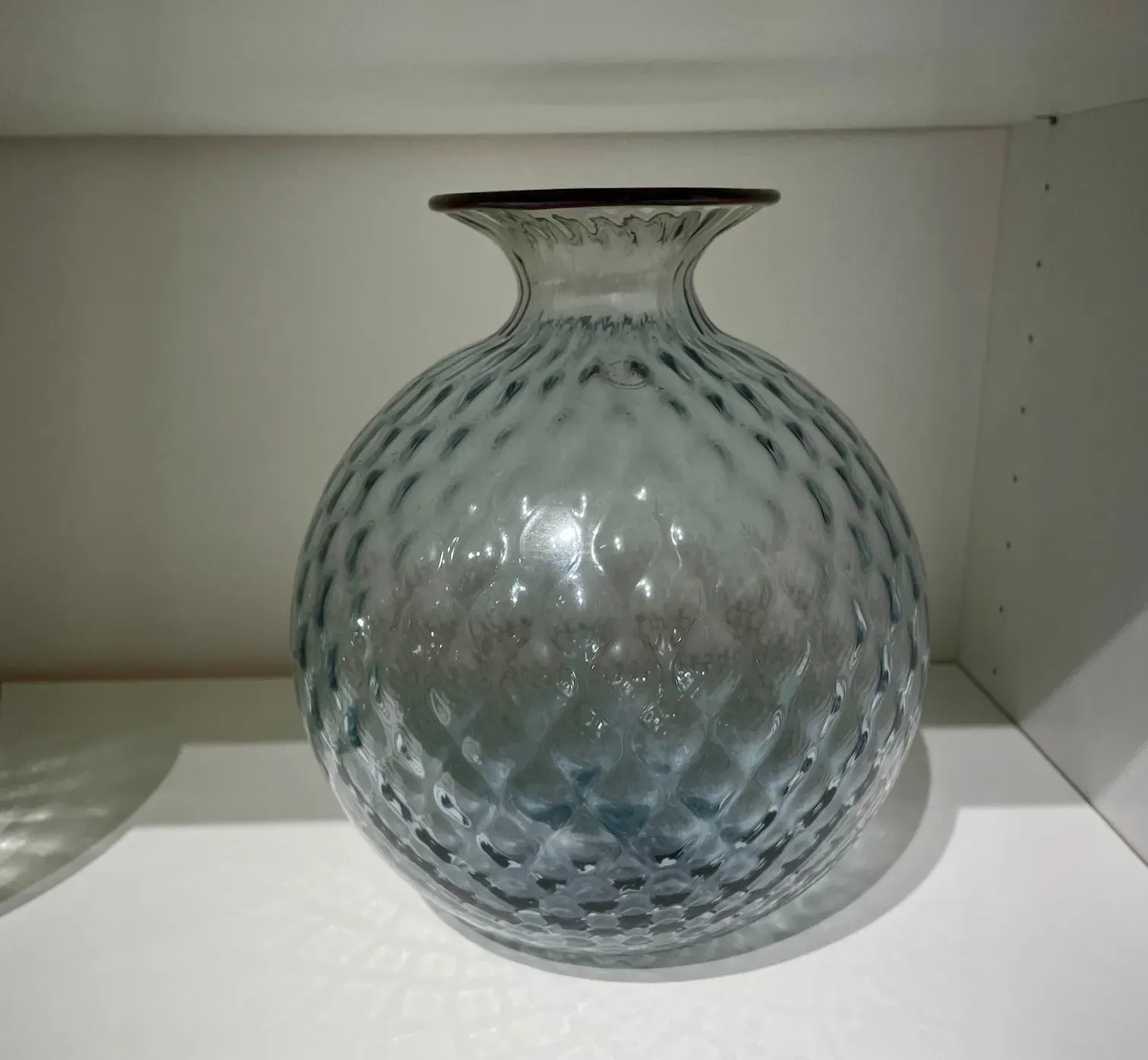Vaso Monofiore Venini realizzato con la tradizionale tecnica di lavorazione Balloton. Questa tecnica ่ usata per ottenere un particolare effetto ottico. Si basa sull'uso di uno stampo in metallo con all'interno delle punte a piccola piramide a base quadrata che, durante la soffiatura, conferiscono all'oggetto un effetto a rilievo incrociato. Dimensione diam. 21,5 cm x H 24,5 cm 100.29. Colori disponibili indaco, uva.