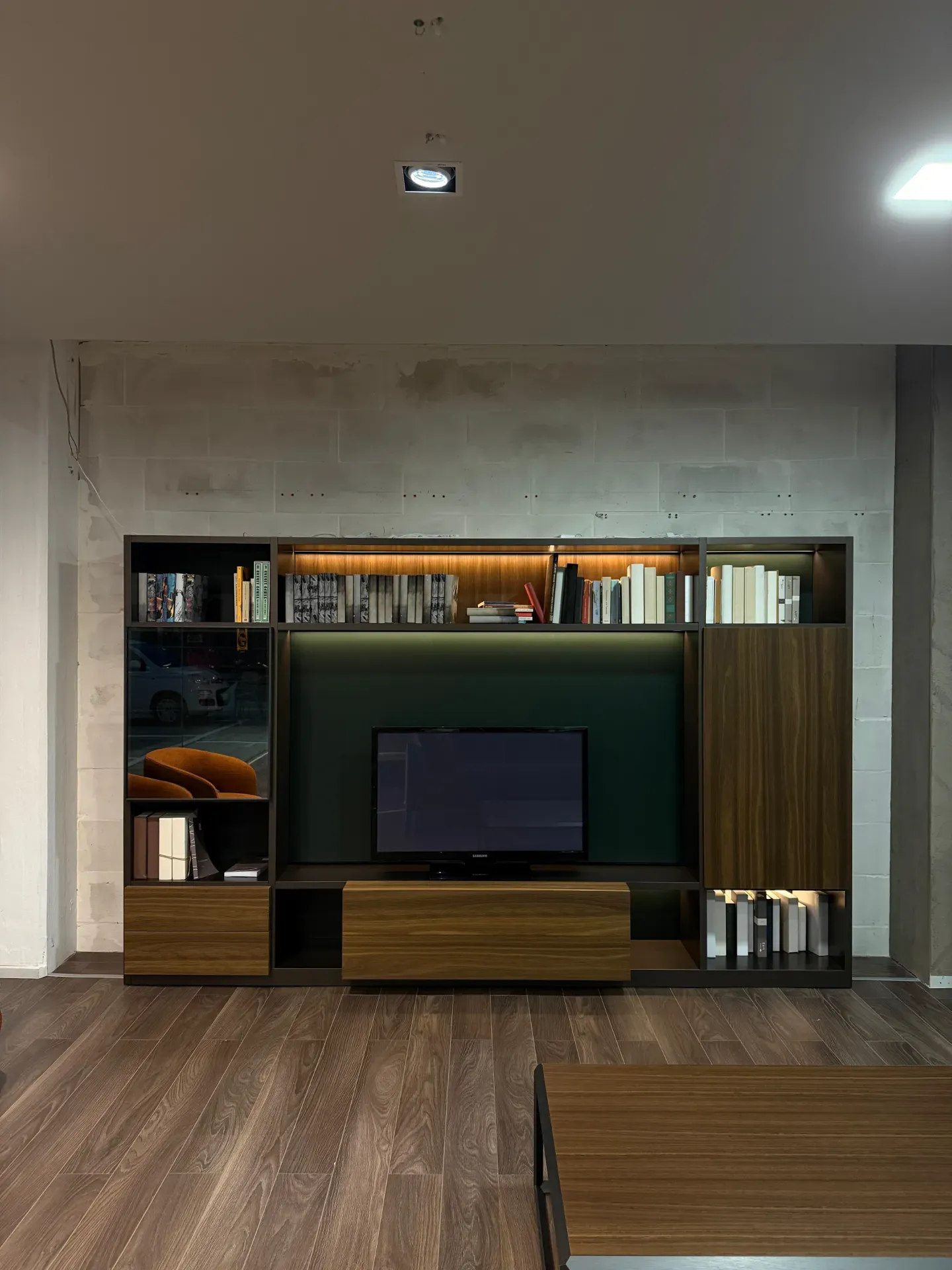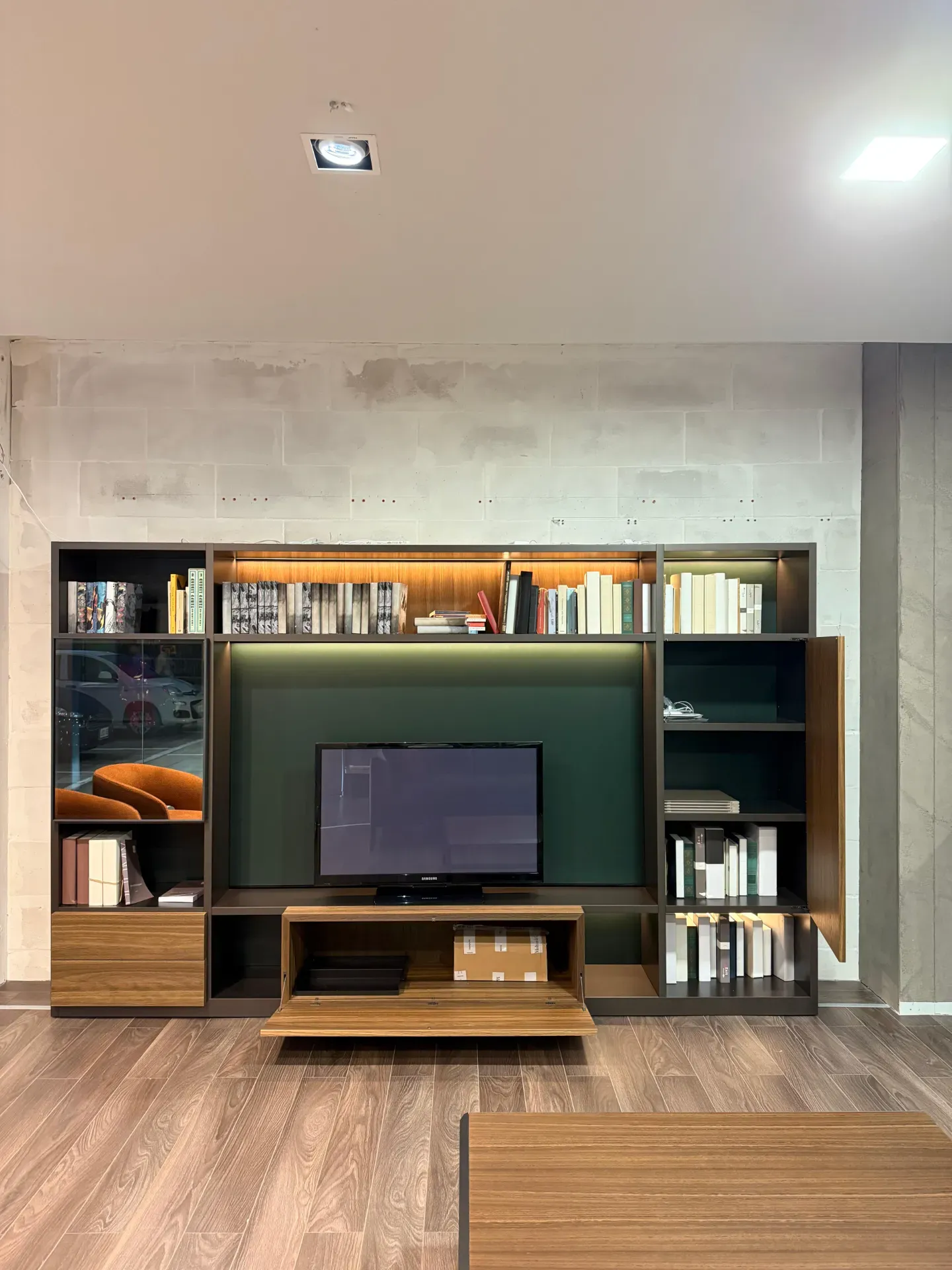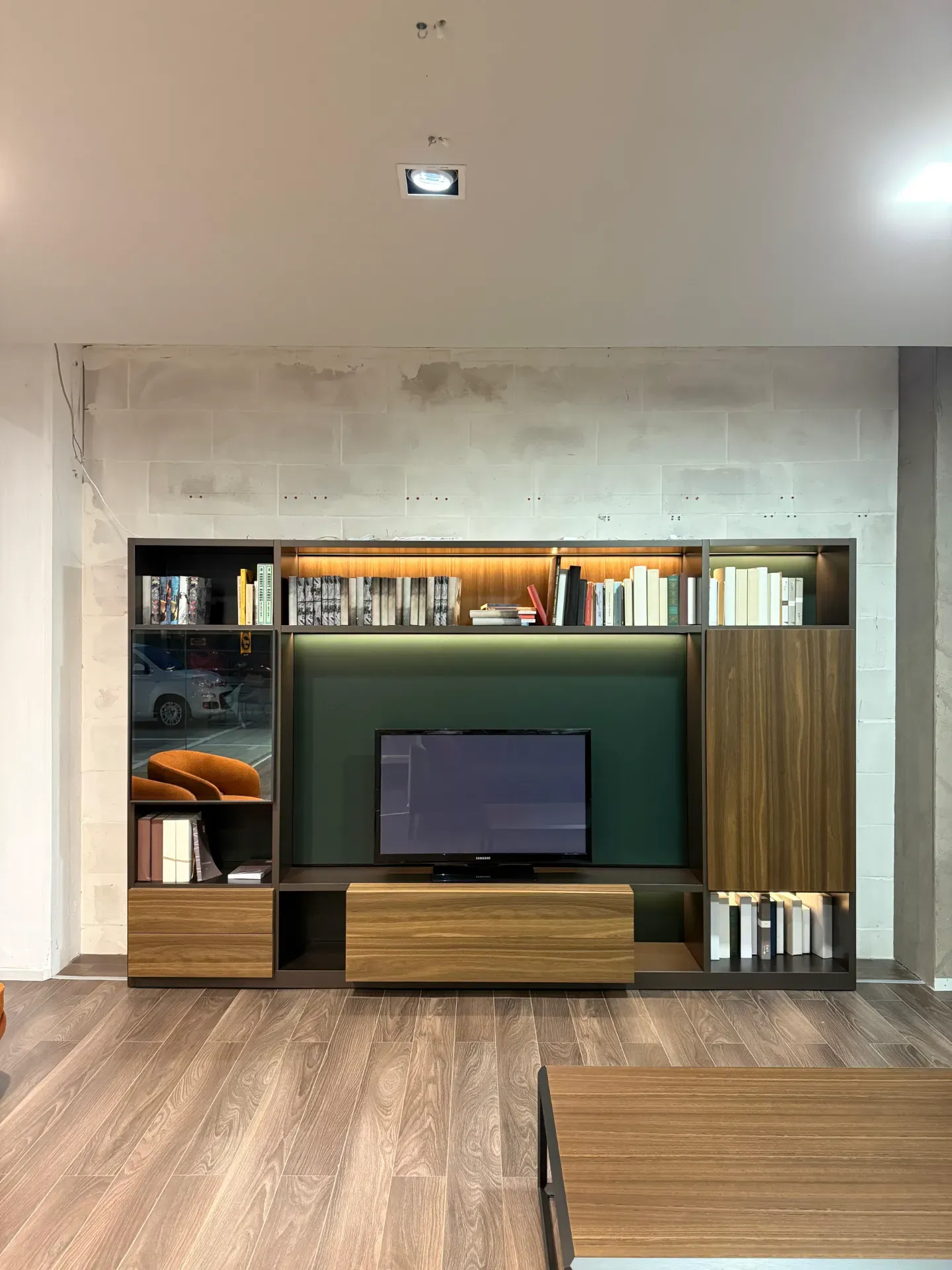 Questa proposta specifica in offerta outlet si presenta con una struttura in laccato opaco e dei frontali in essenza noce. Si tratta di un occasione perfetta per chi vuole un sistema giorno di alta gamma, di design e funzionale, con un vantaggio economico significativo.