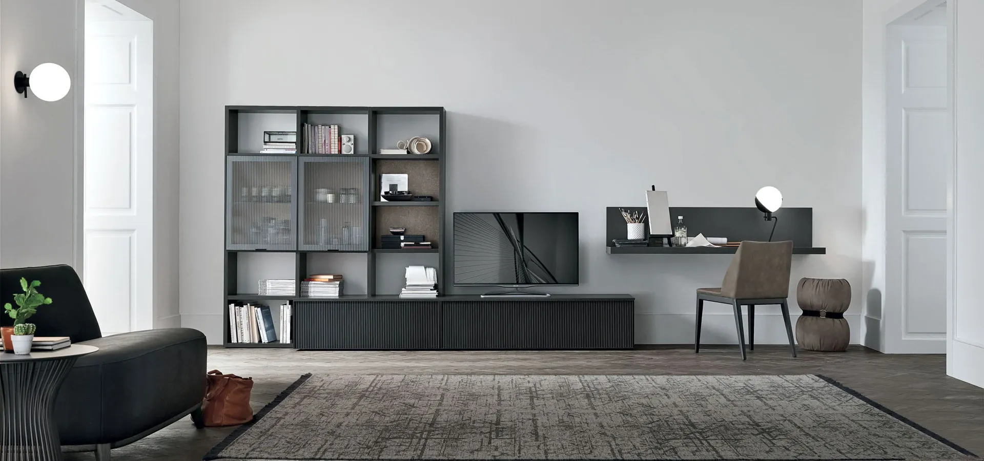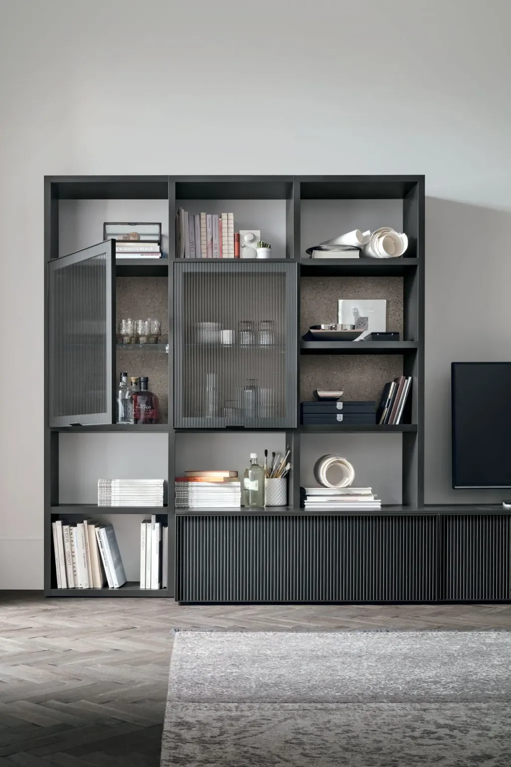 Parete attrezzata dal design moderno e materico, ideale per arredare il soggiorno con stile e funzionalità. La composizione unisce libreria, contenitori e vano TV, offrendo ampio spazio contenitivo e un forte impatto estetico.