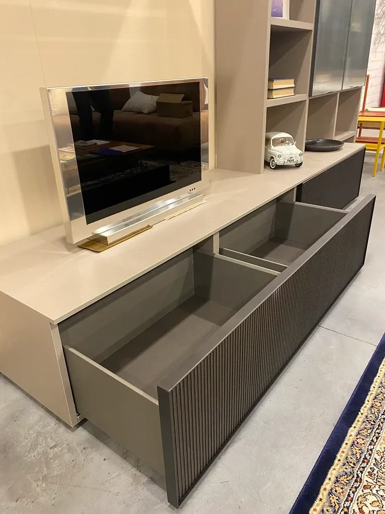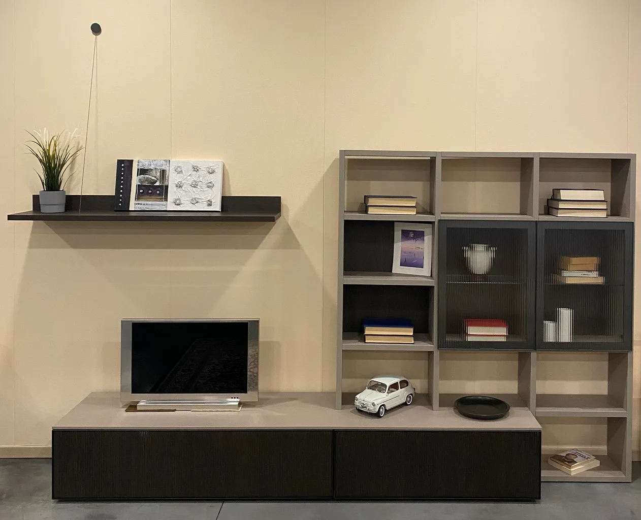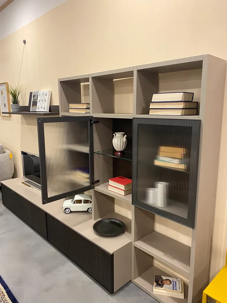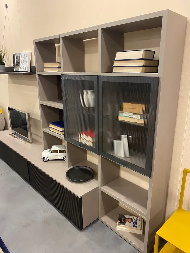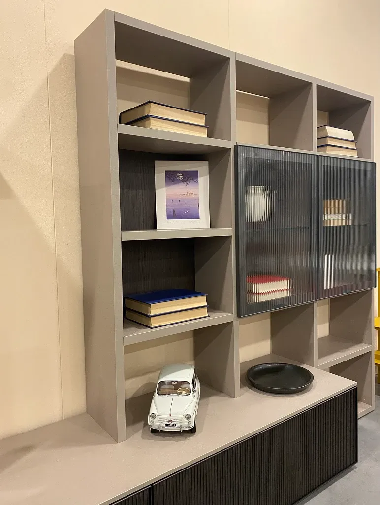 Composizione living: 3 colonne spalla da cm 54 in materico cemento cava, schienale rovere carbone, anta telaio vetro cannettè; 2 basi con cestone cm 144 e cm 108 in rovere carbone cannettè, telaio antracite; top in cemento cava.
