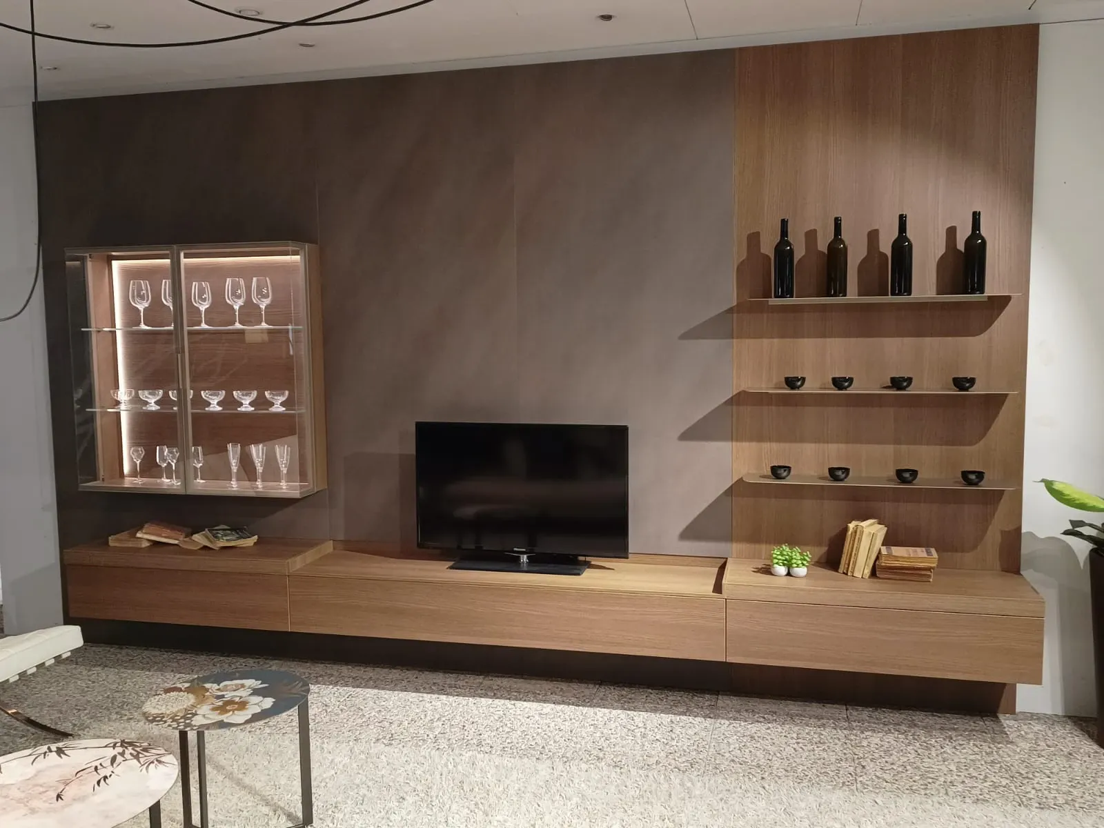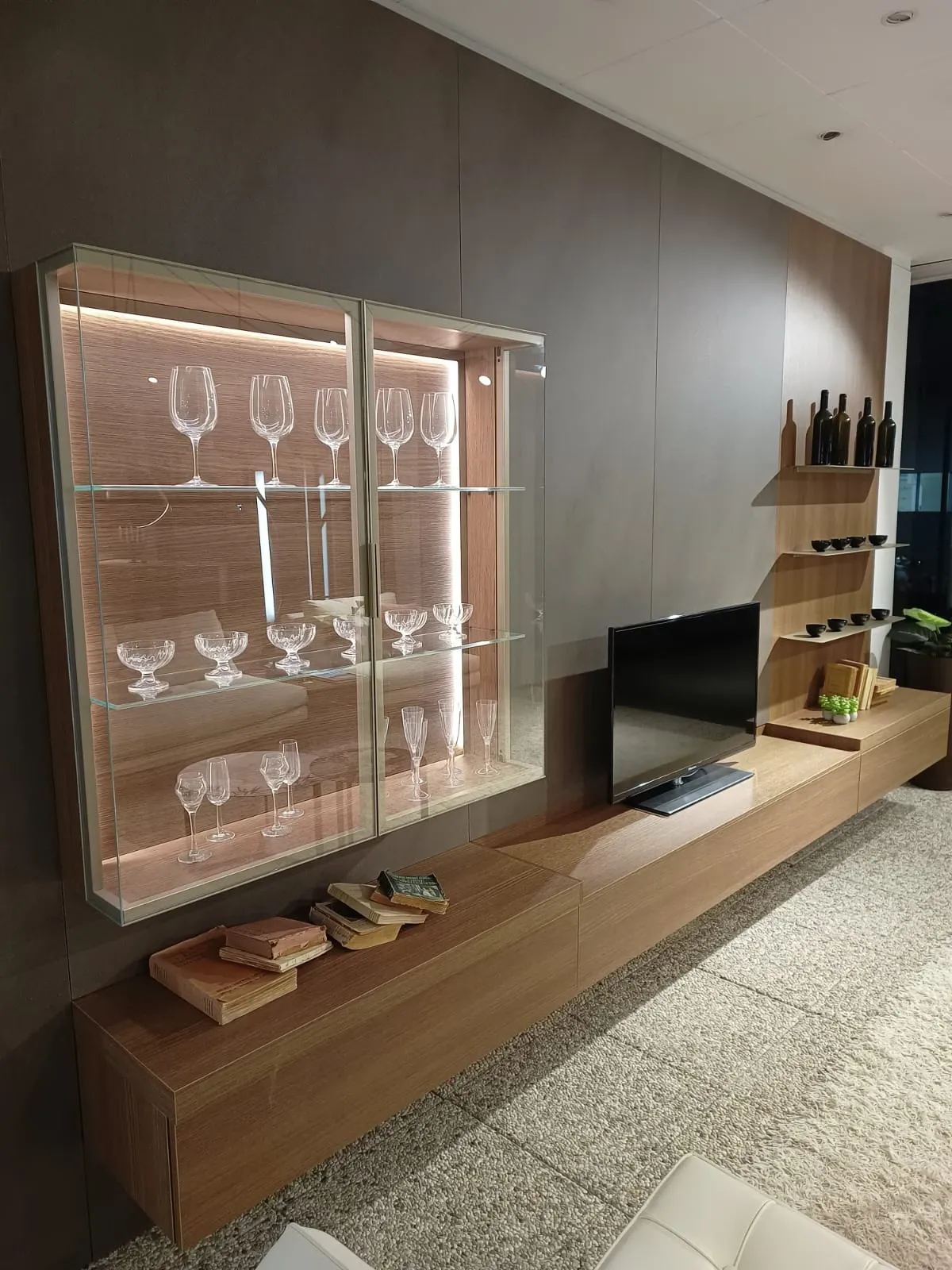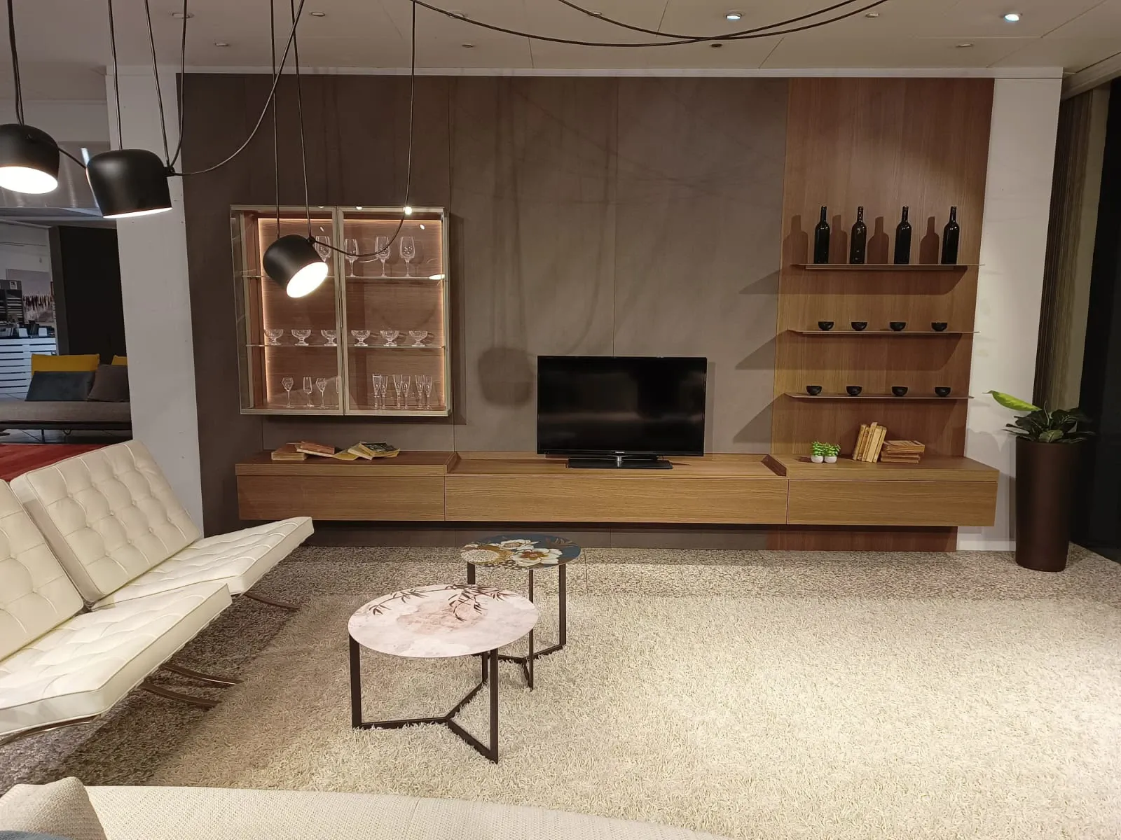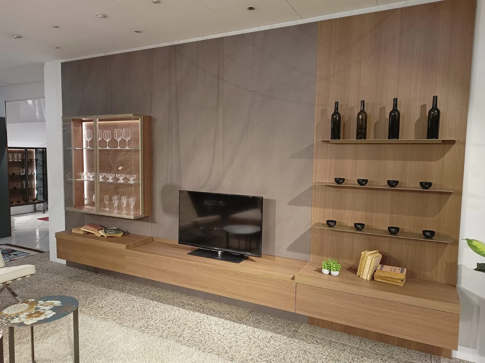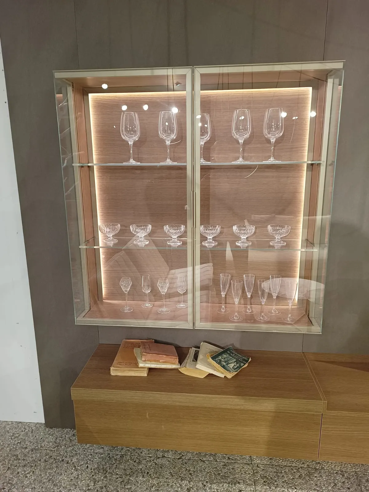 Soluzione presentata al Salone del Mobile di Milano , con pannelli boiserie in materico colori : Rovere Cognac e Calce scura -Misura Parete cm 432 H 265 attrezzata con una bellissima vetrina d'effetto mod. Teka sospesa, modulo da 108 h 108 p. 29 completa di ripiani in vetro e luci. Mobile sospeso composto da : 2 cassetti cm 108 p. 40 h 24 con top sp. 6 cm, base centrale a ribalta da cm 180 p. 40 h 24 con ribalta e top a vassoio. A lato 3 mensole in metallo col. Palladio da cm 99 x p. 18. Misure modificabili.