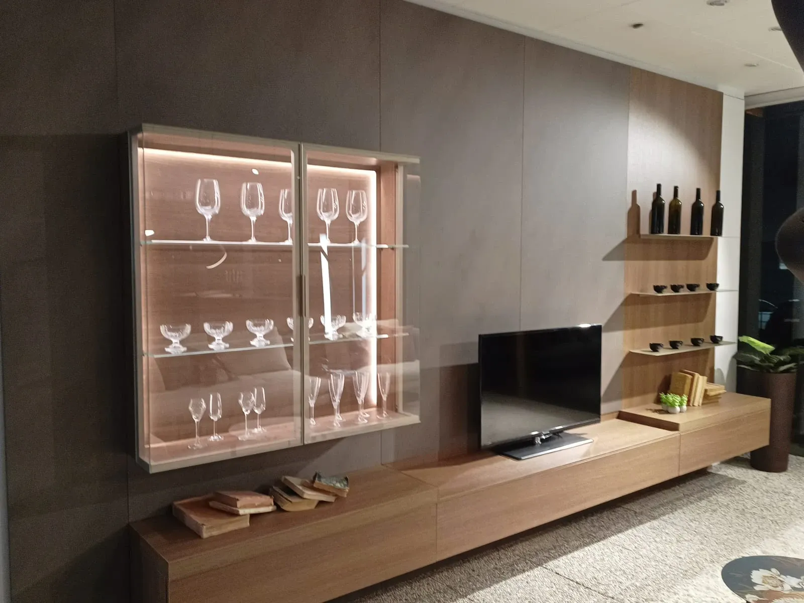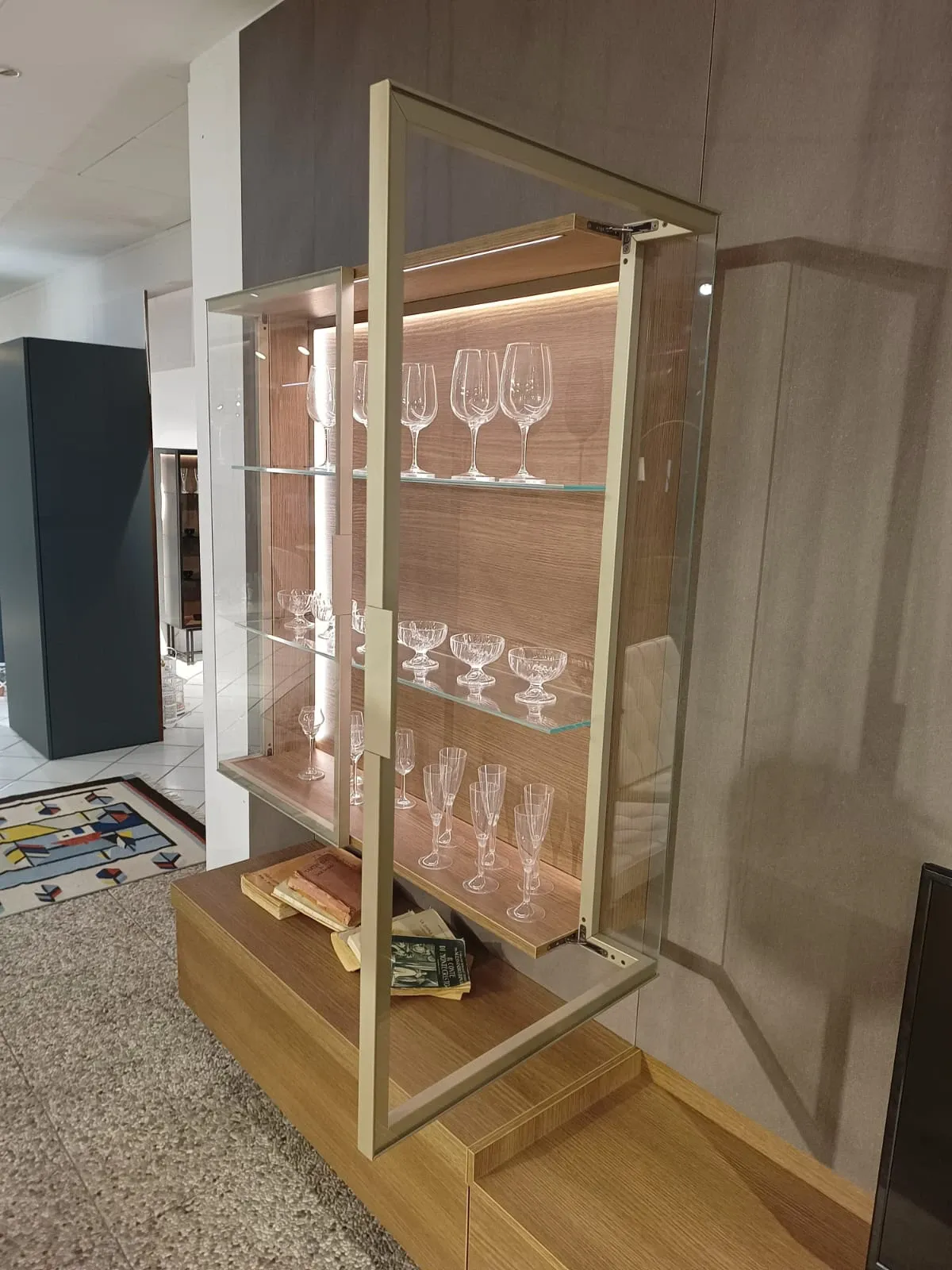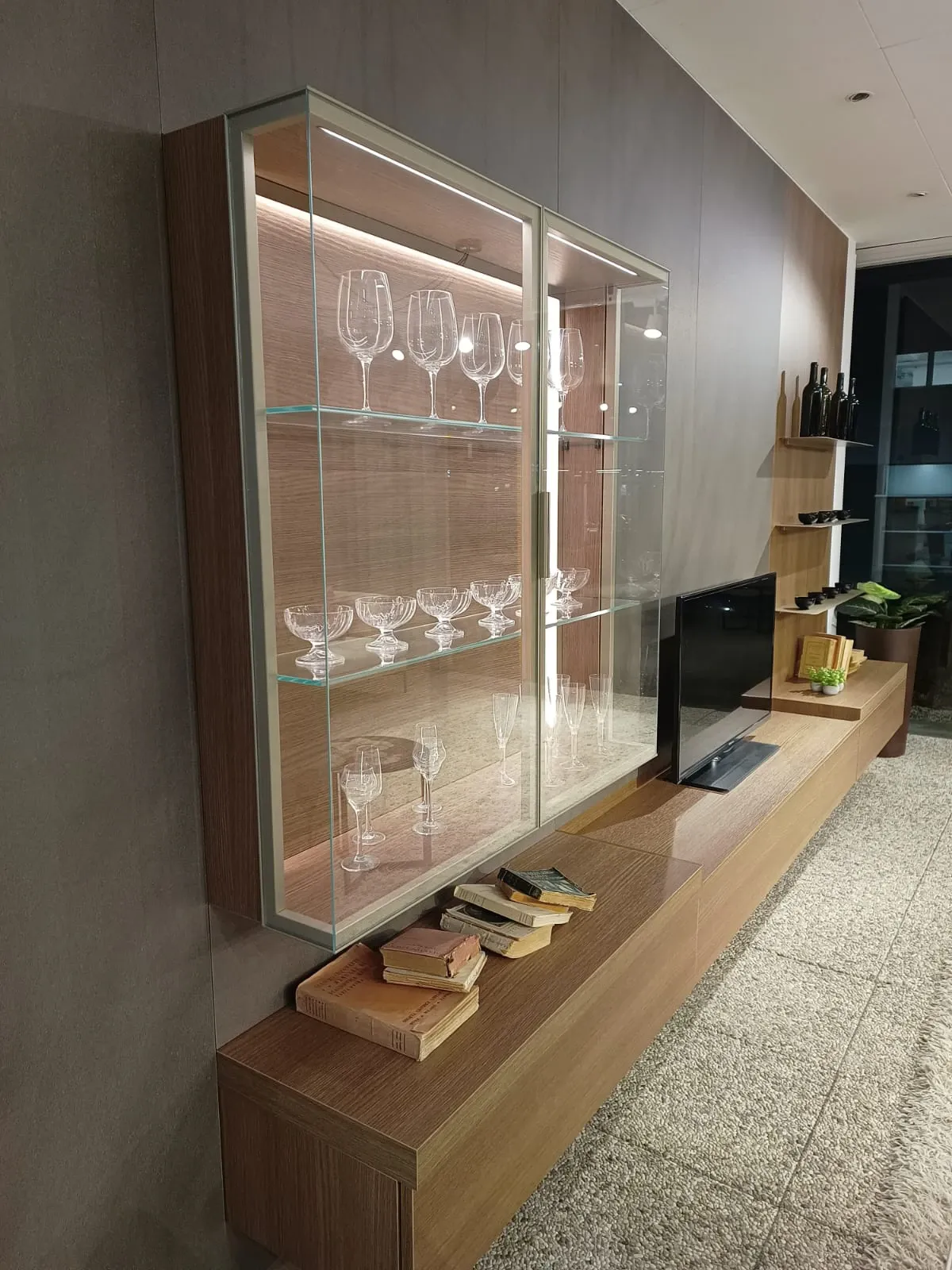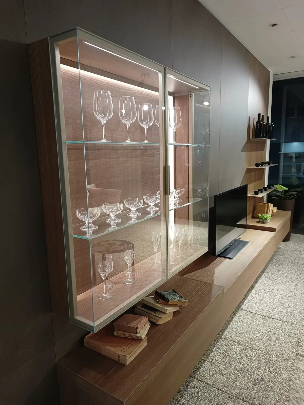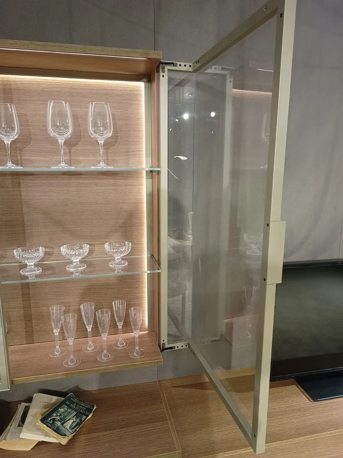Soluzione presentata al Salone del Mobile di Milano , con pannelli boiserie in materico colori : Rovere Cognac e Calce scura -Misura Parete cm 432 H 265 attrezzata con una bellissima vetrina d'effetto mod. Teka sospesa, modulo da 108 h 108 p. 29 completa di ripiani in vetro e luci. Mobile sospeso composto da : 2 cassetti cm 108 p. 40 h 24 con top sp. 6 cm, base centrale a ribalta da cm 180 p. 40 h 24 con ribalta e top a vassoio. A lato 3 mensole in metallo col. Palladio da cm 99 x p. 18. Misure modificabili.