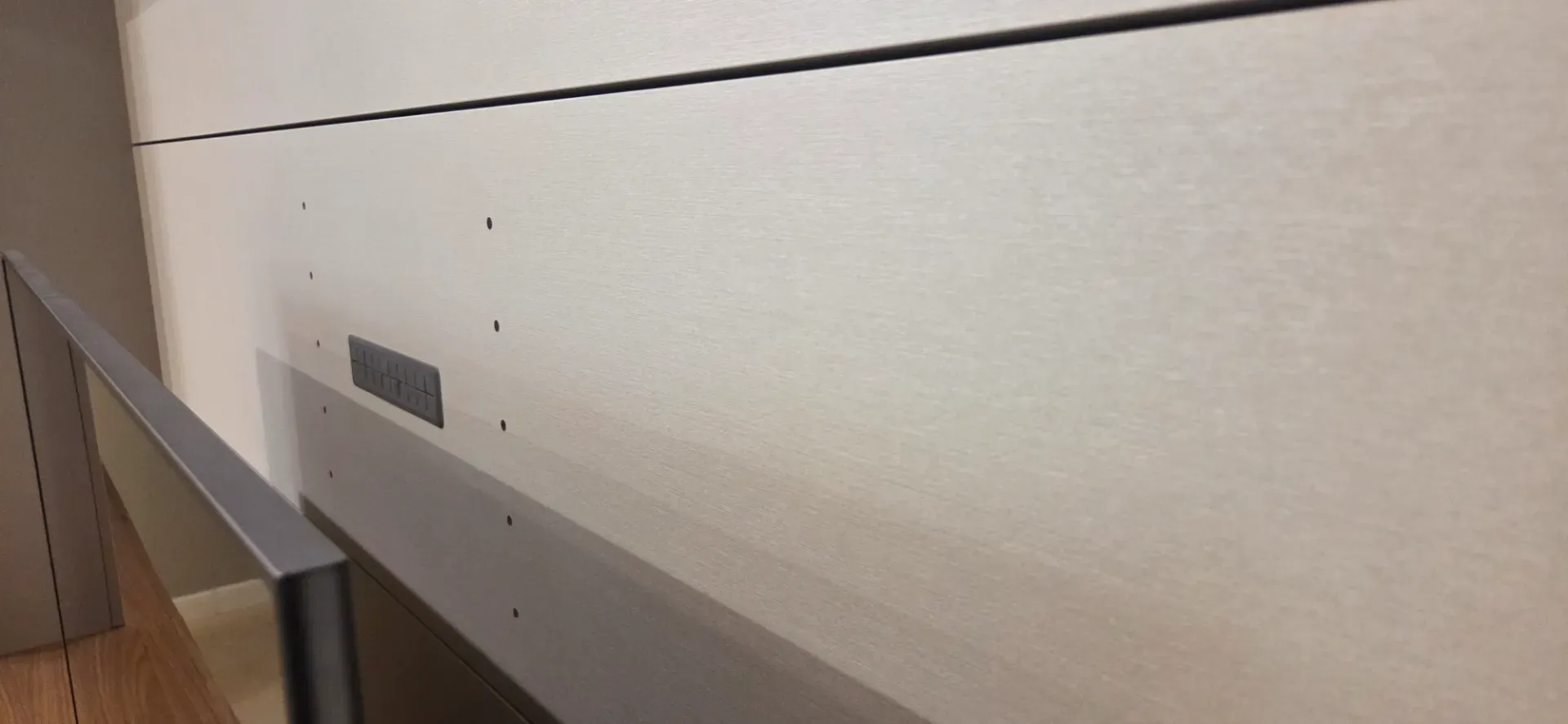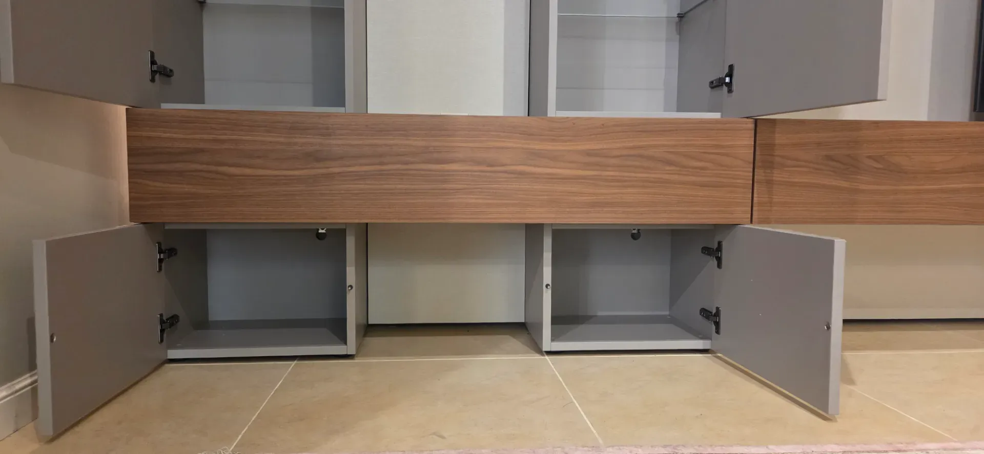 I tre cestoni in legno noce canaletto sospesi da terra, sono differenziati da due tipologie di apertura e sono dotati di una piccola maniglia per accompagnarli durante l'utilizzo. Le due colonne di finiuta laccato opaco silice, con i ripiani interni in cristallo, hanno una tipologia di apertura a push pull. Il tutto ha come sfondo la boiserie lampo in finitura materica sketch sabbia composta da varie pannellature orizzontali, con mensole in metallo laccate palladio e una predisposizione con passacavi per un'eventuale montaggio di TV sospesa.