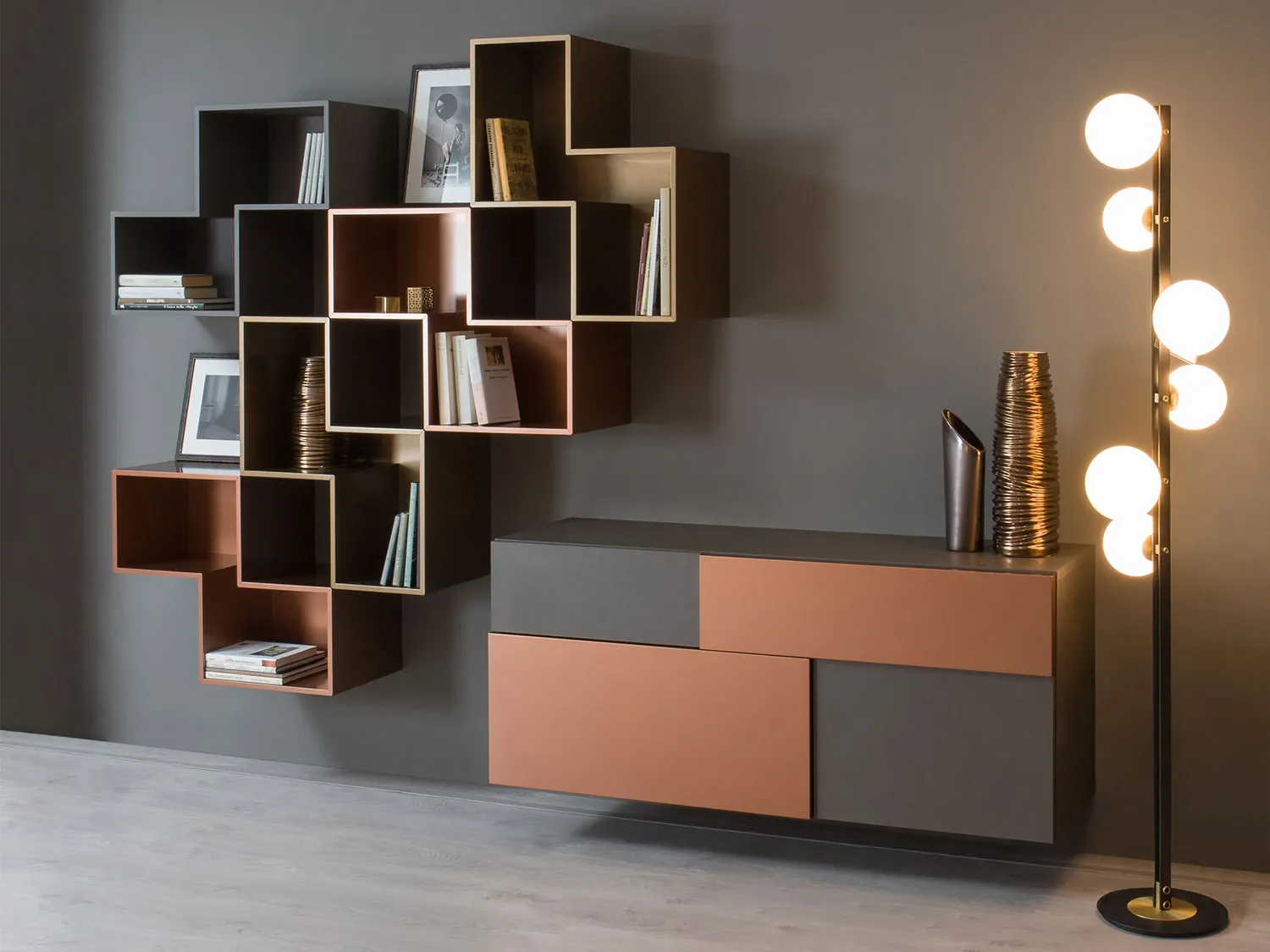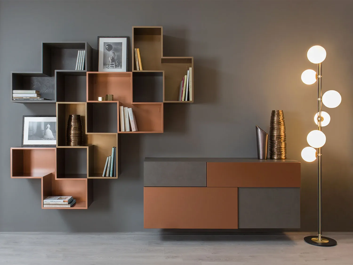 Per impreziosire un soggiorno moderne opta per una parete attrezzata che mantenga una certa coerenza stilistica, come questo modello Credenza fly deco e mensole cube outlet a prezzo ribassato.