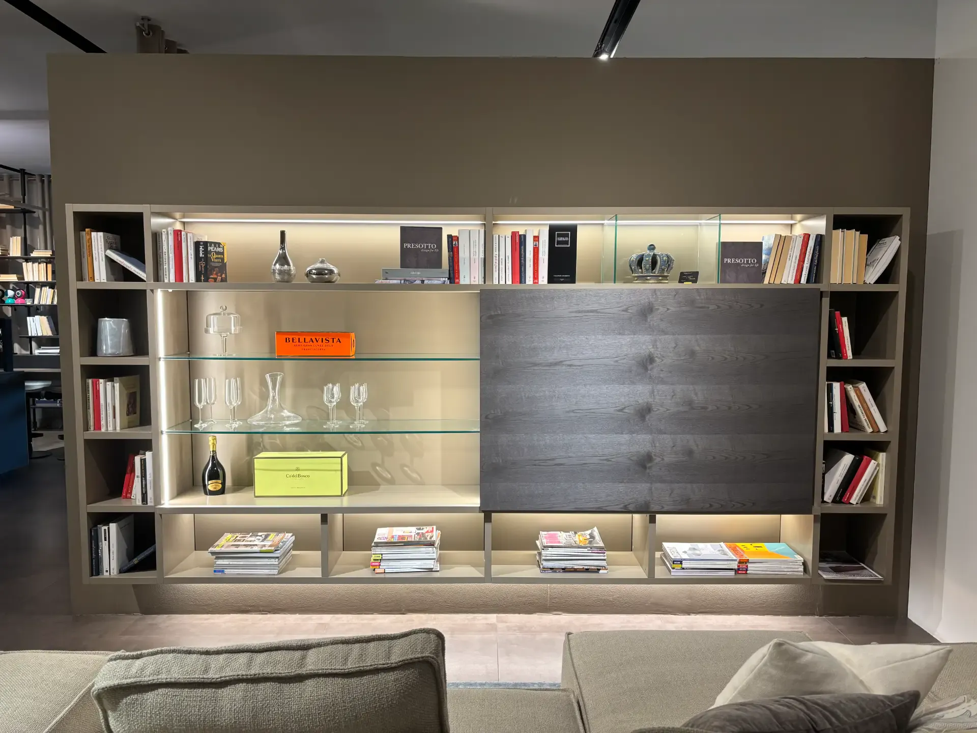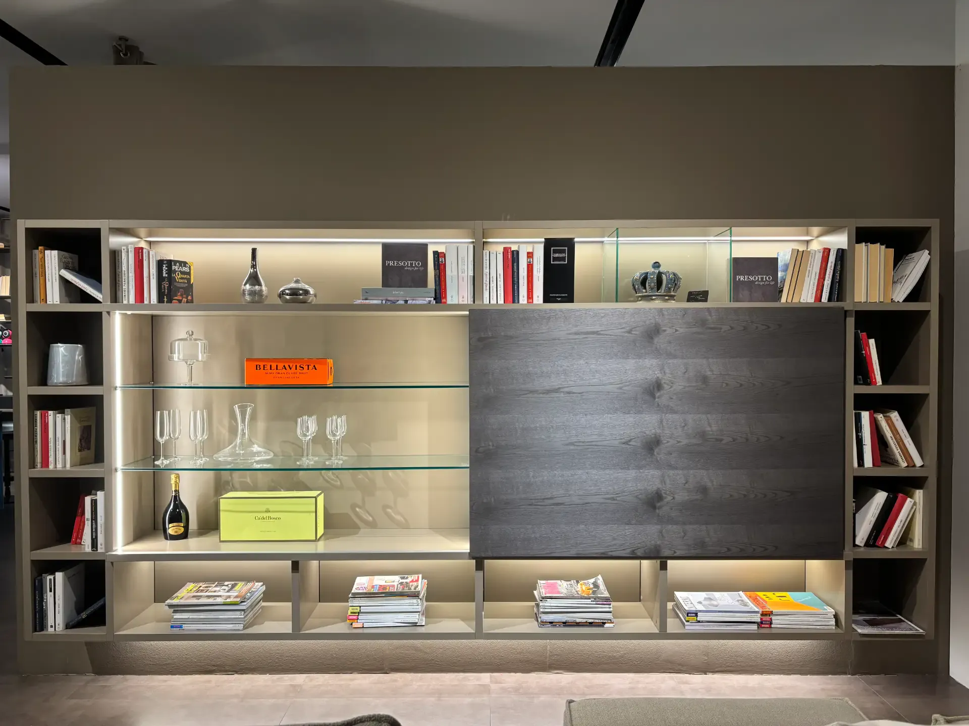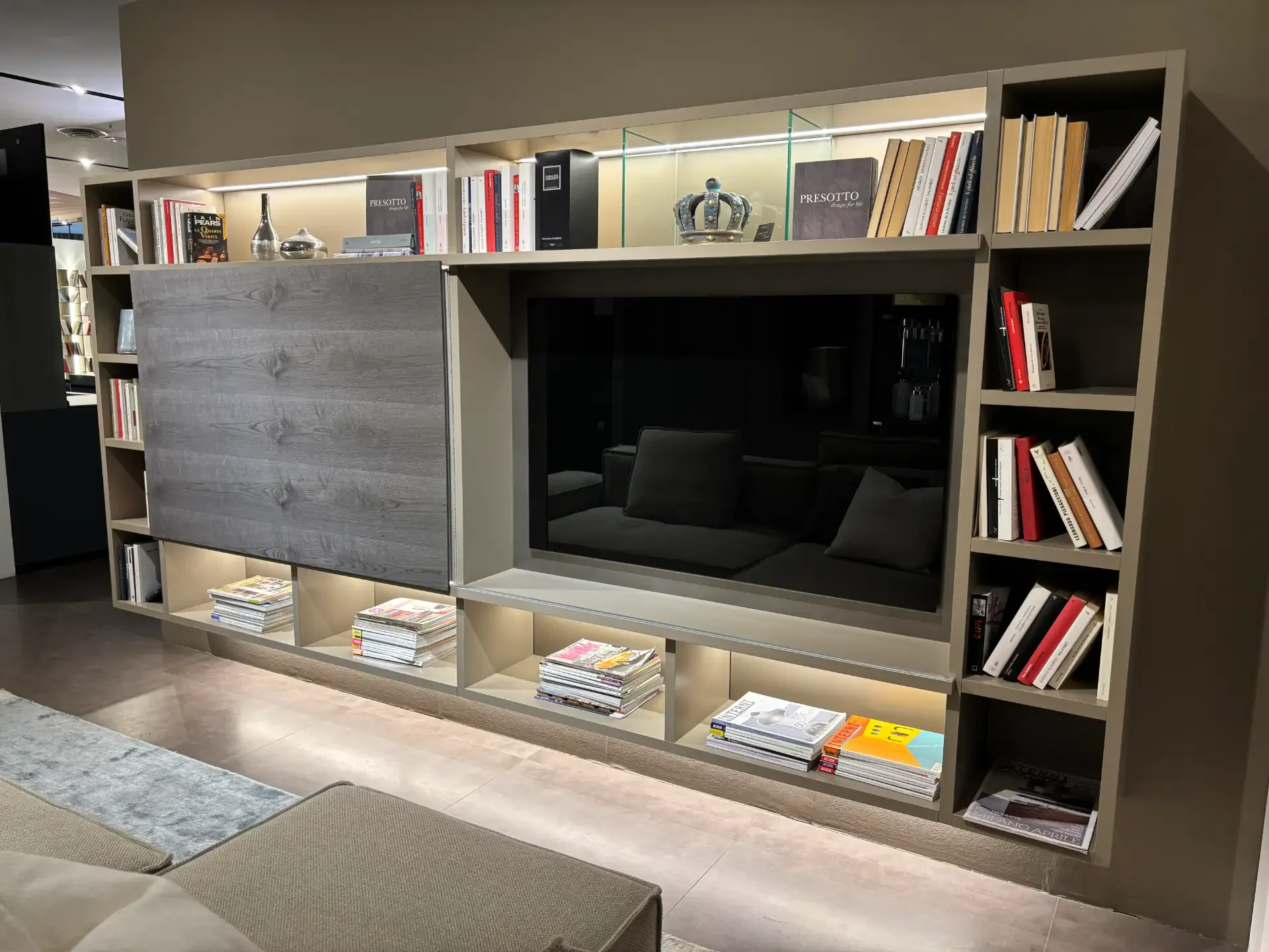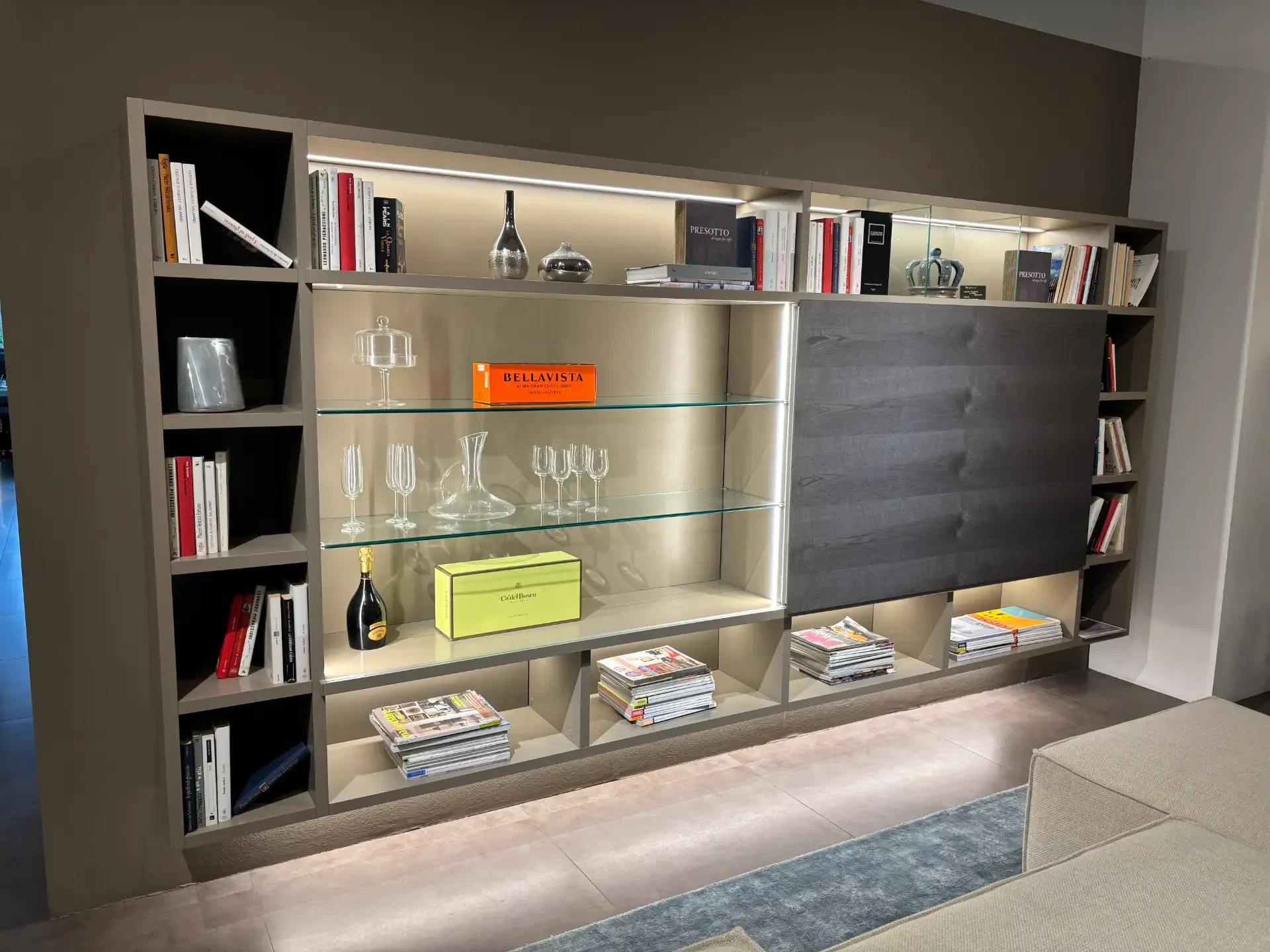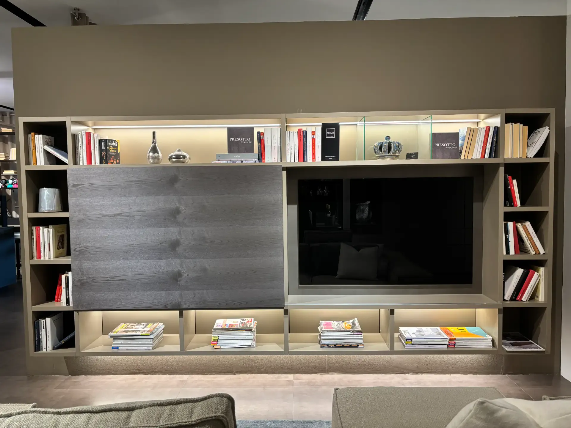 Se vuoi ultimare il living con una parete attrezzata senza maniglia, il modello Mobile presotto mostrato in foto fa al caso tuo.
