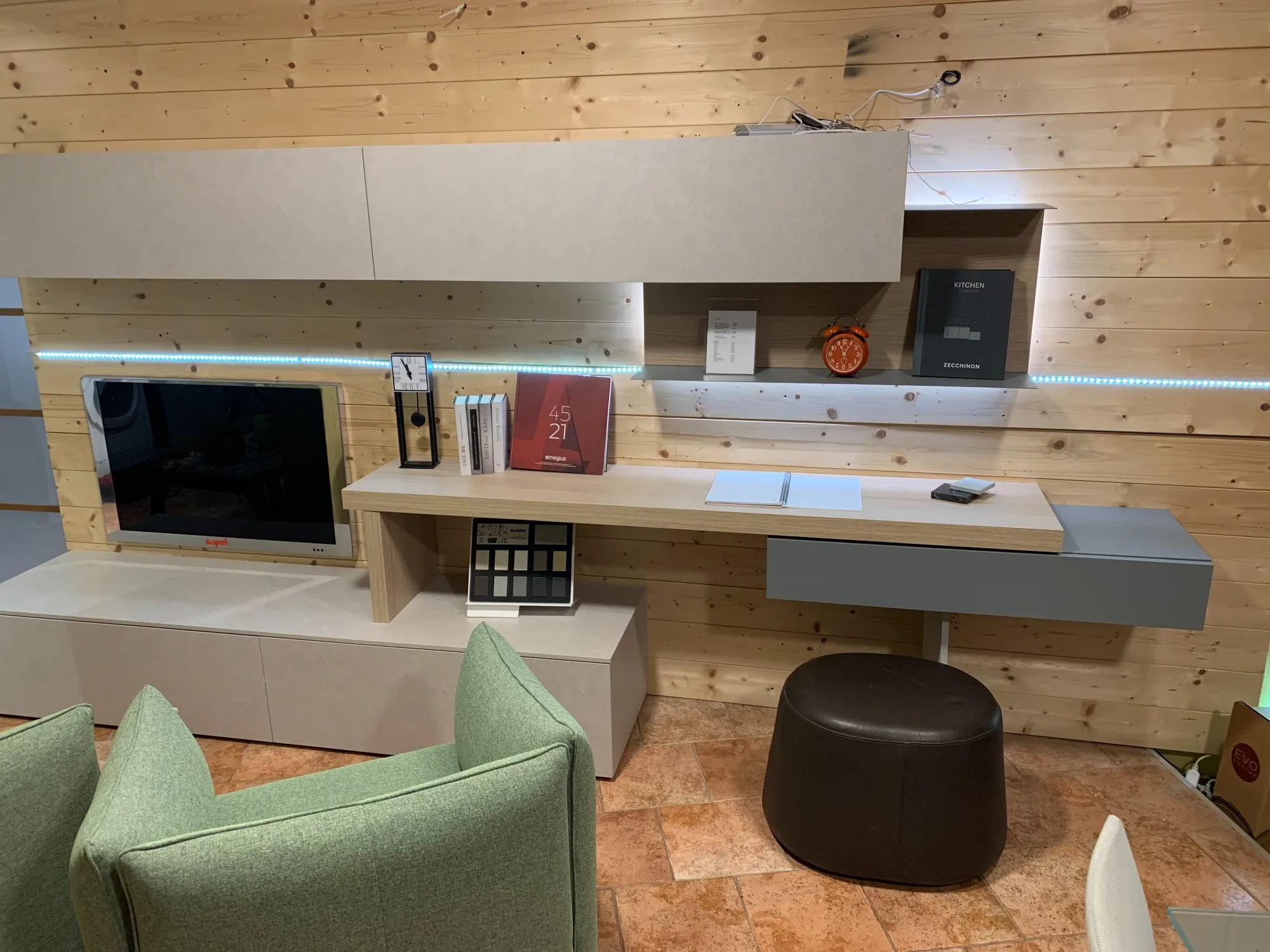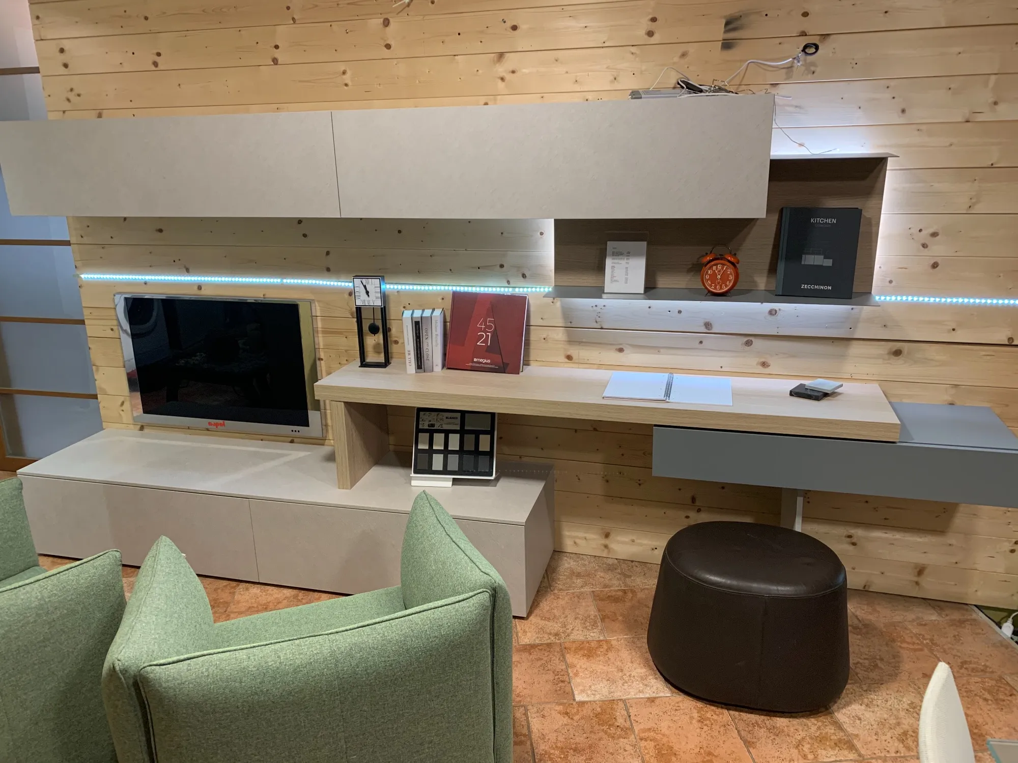 In foto è ben visibile il laminato materico con cui questa parete attrezzata è stata realizzata: la pluriennale professionalità Tomasella garantisce materiali sempre resistenti e esteticamente gradevoli.