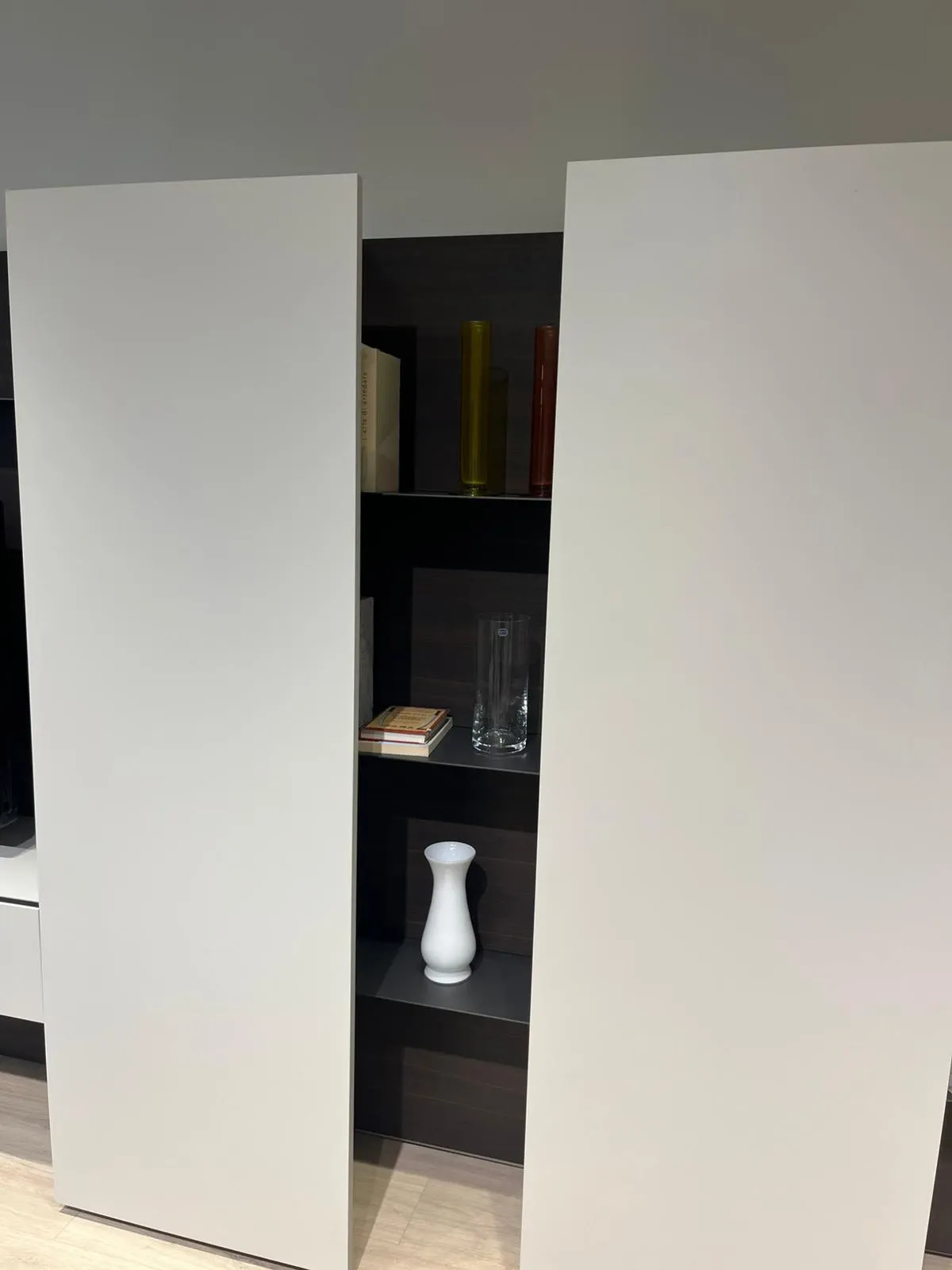 Design con ante che sbordano rispetto alla struttura, arrivando visivamente sulle mensole in metallo