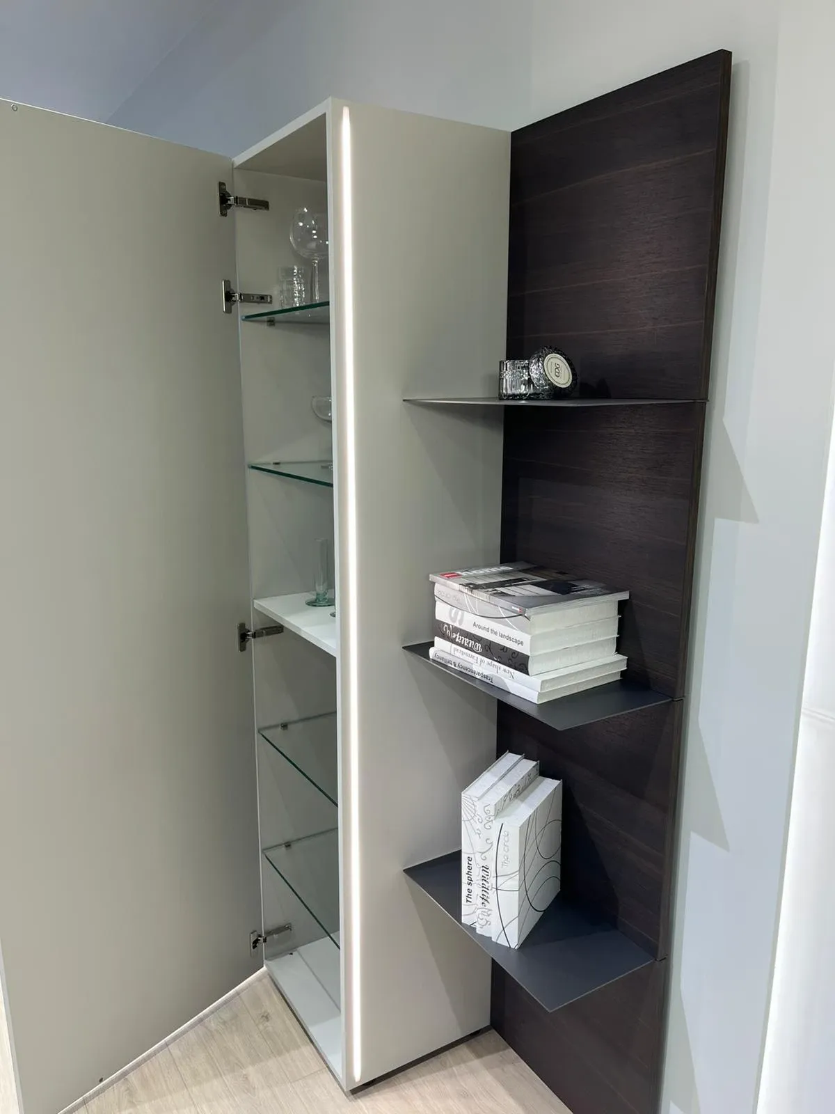 Striscia LED laterale posizionata sul fianco del pensile che illumina le mensole metalliche