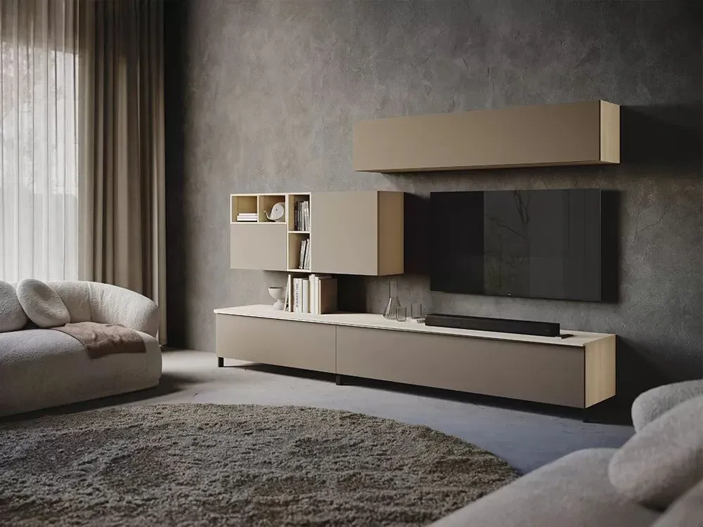 Un equilibrio perfetto tra eleganza contemporanea e calore naturale: questa composizione da 300 cm definisce lo spazio con un dinamismo armonioso, alternando volumi chiusi e raffinati elementi a giorno. Le tonalità avvolgenti del Visone si fondono con la matericità del Rovere sbiancato, creando un atmosfera luminosa e accogliente che valorizza ogni dettaglio dell abitare moderno. Grazie alla sapiente alternanza tra basi capienti e pensili asimmetrici, la struttura arreda con carattere e leggerezza, offrendo una funzionalità impeccabile in una cornice di assoluto pregio estetico.