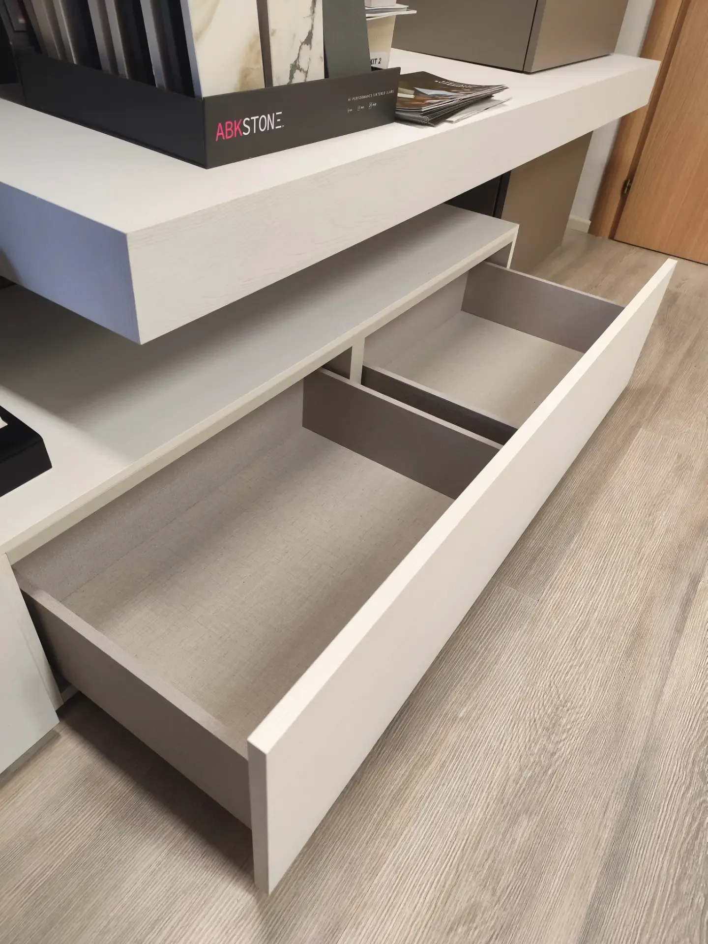 Colori MatWood White ed Eco Pepe per dare contrasto chiaro e caldo.
