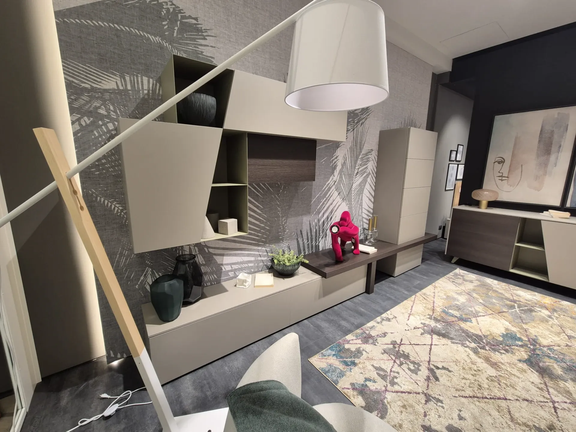 Le finiture in MT Arena e Rovere Moka creano un piacevole gioco di contrasti tra superfici chiare e toni naturali, mentre i dettagli in Metallo OC Mimetic aggiungono un tocco contemporaneo e grintoso. L alternanza di pieni e vuoti, di volumi chiusi e moduli a giorno, rende questa composizione visivamente leggera ma incredibilmente capiente.