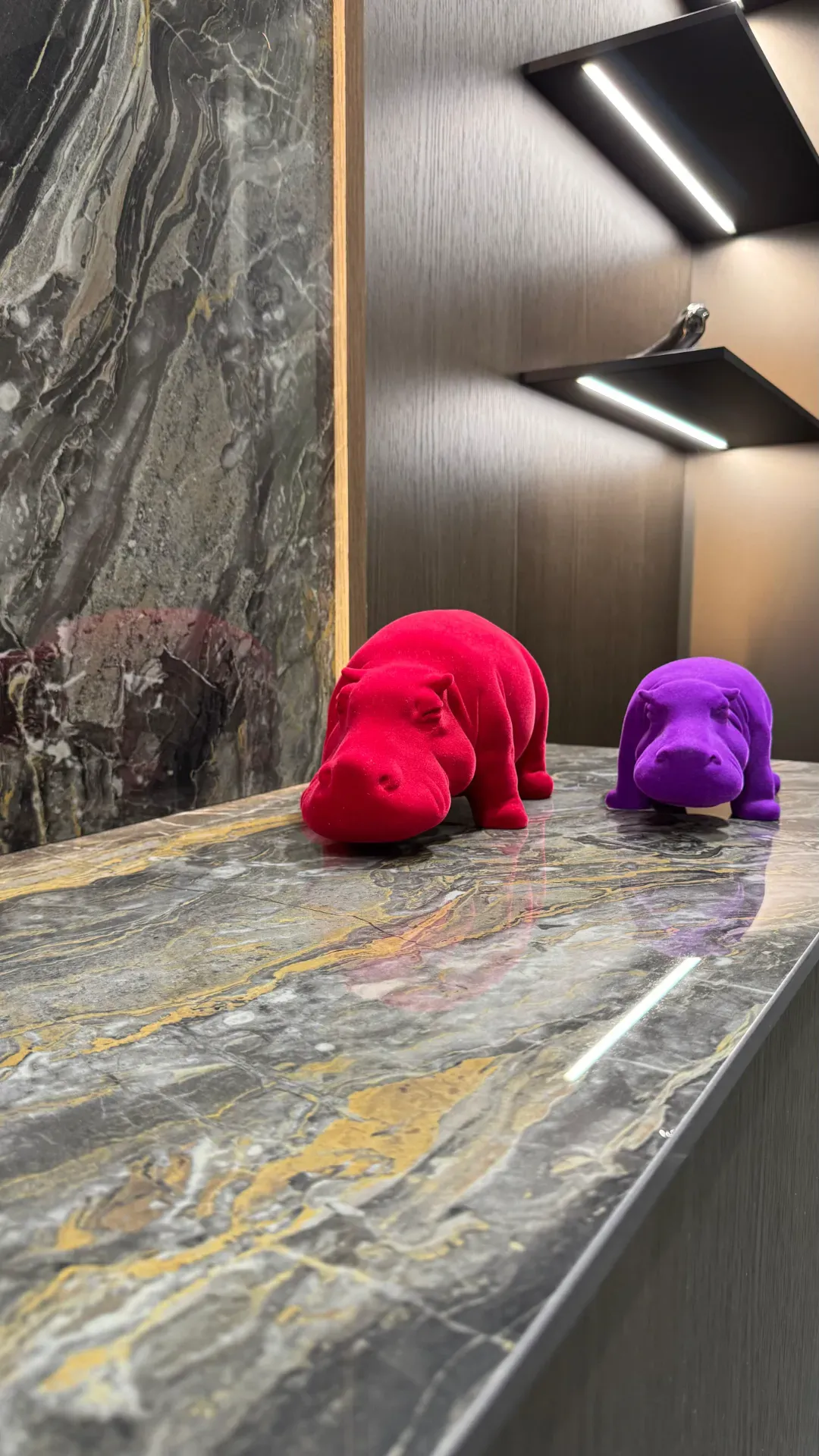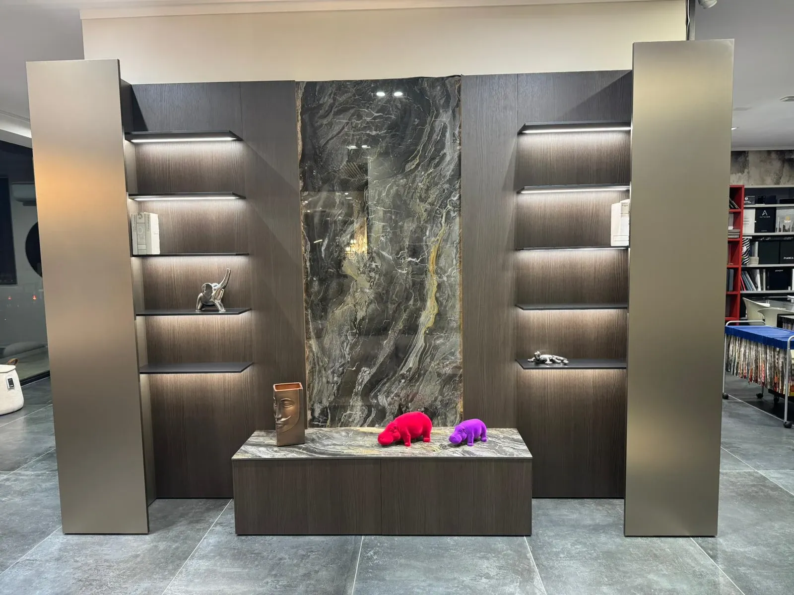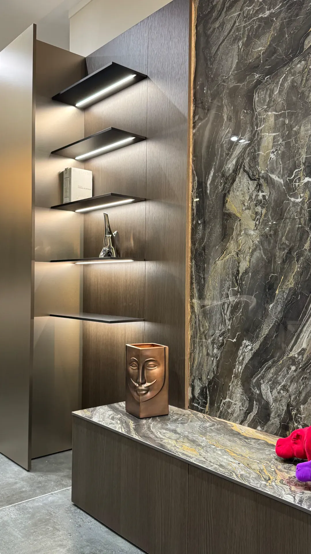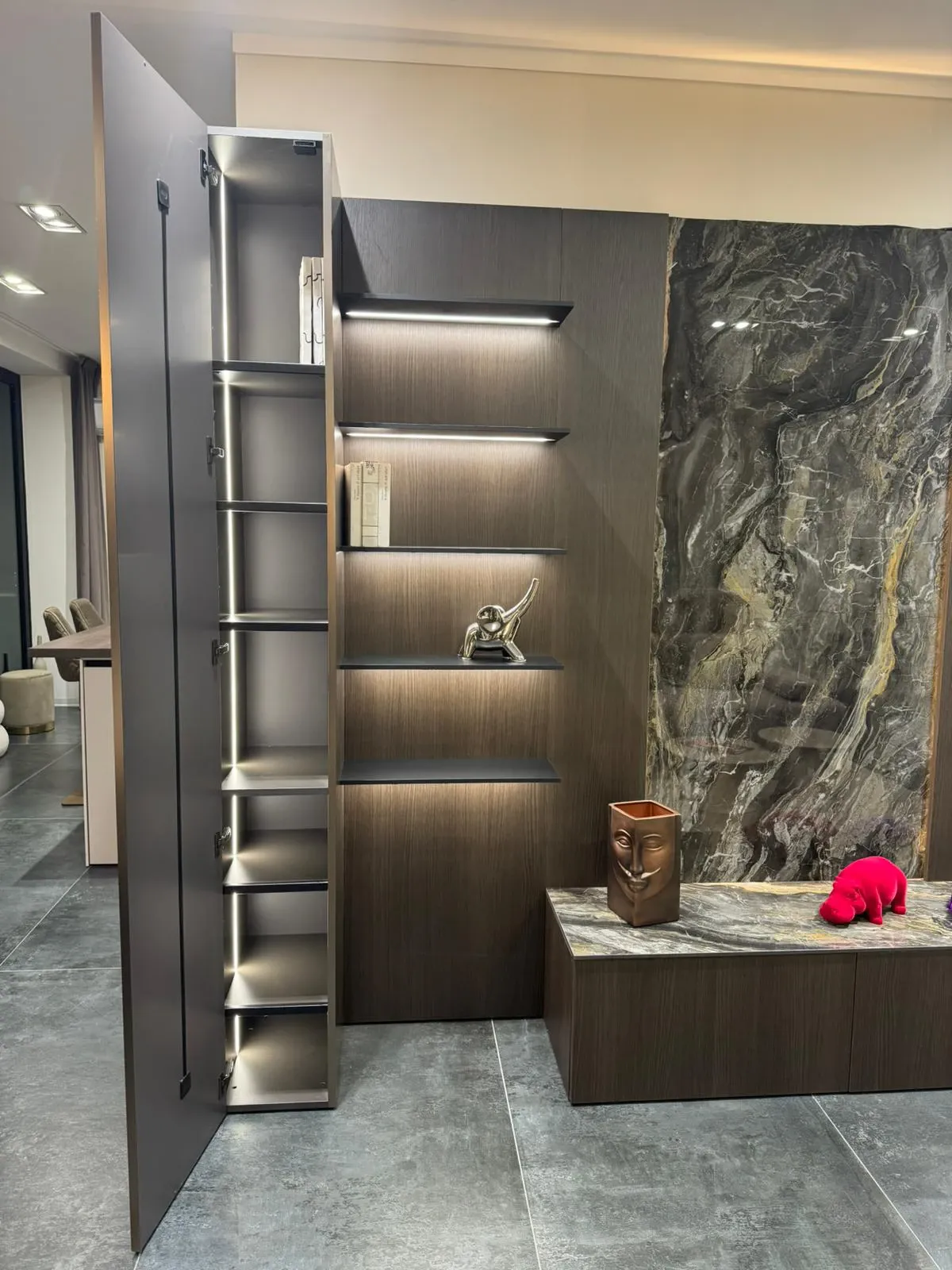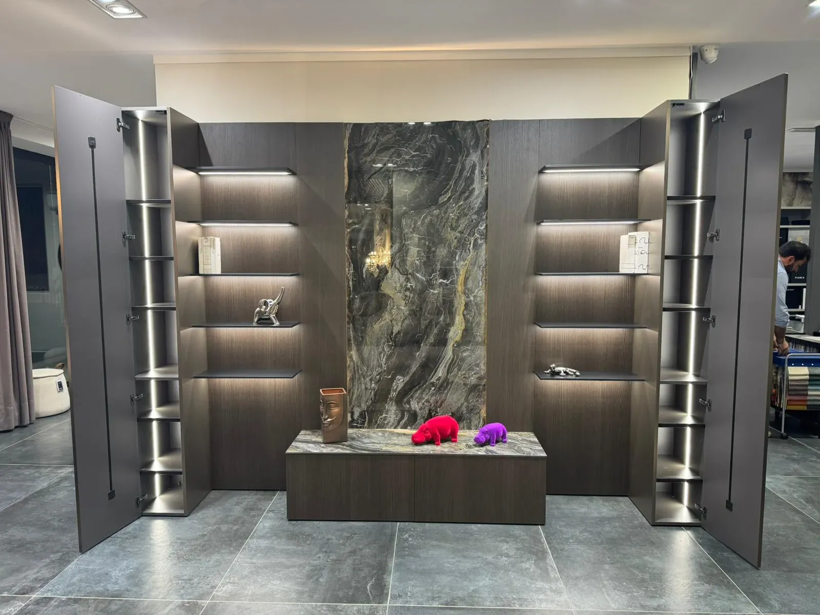 Inoltre sia le mensole che il retro boiserie che l'interno delle colonne sono illuminati da led.