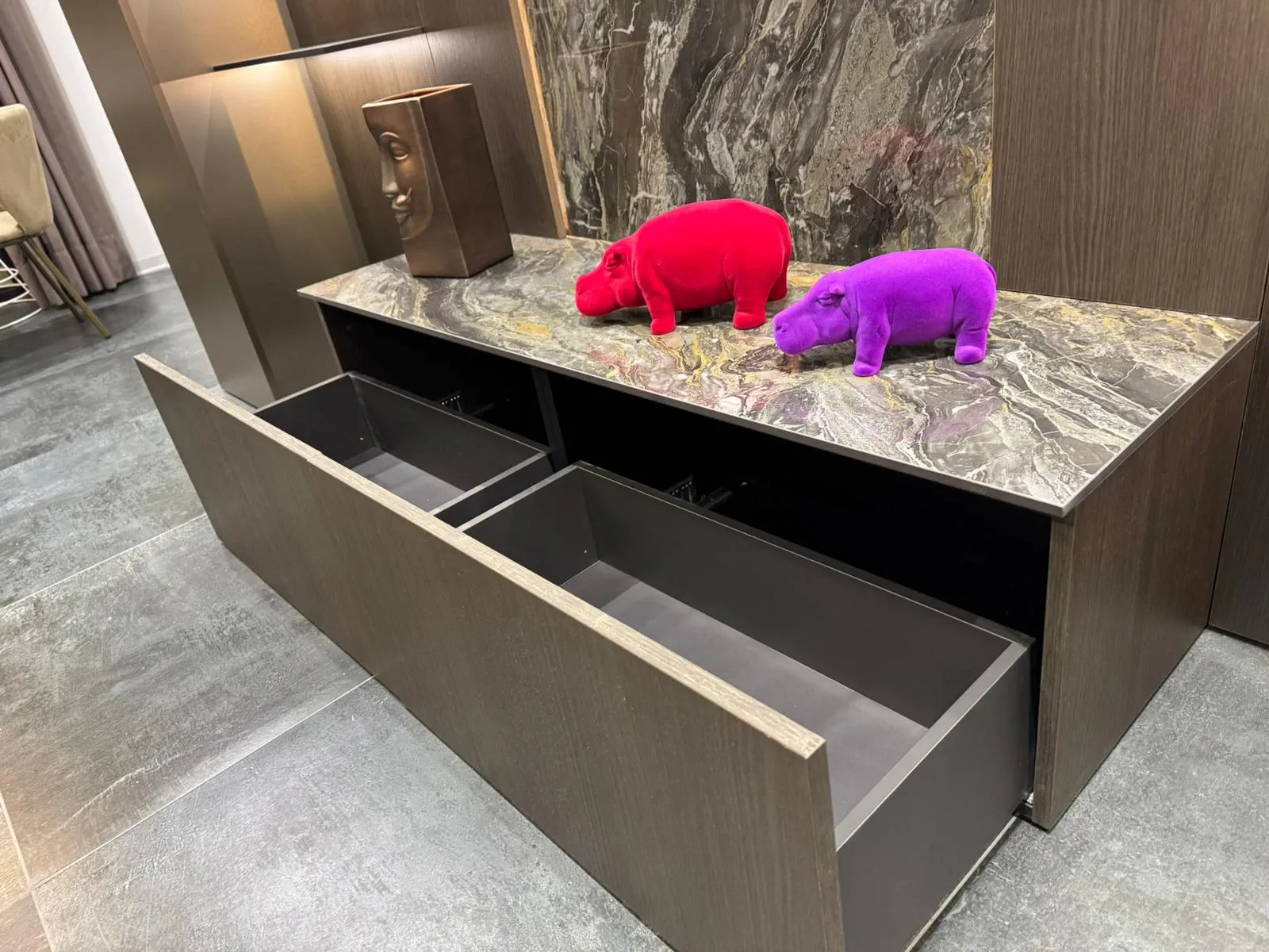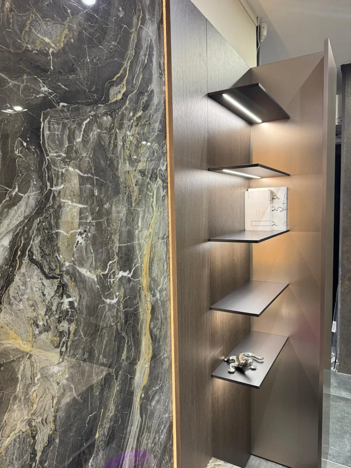 Per impreziosire la parete è stato inserito sia il top che la parte centrale della boiserie in gres OROBICO DARK LUCIDO dell'azienda Marazzi.