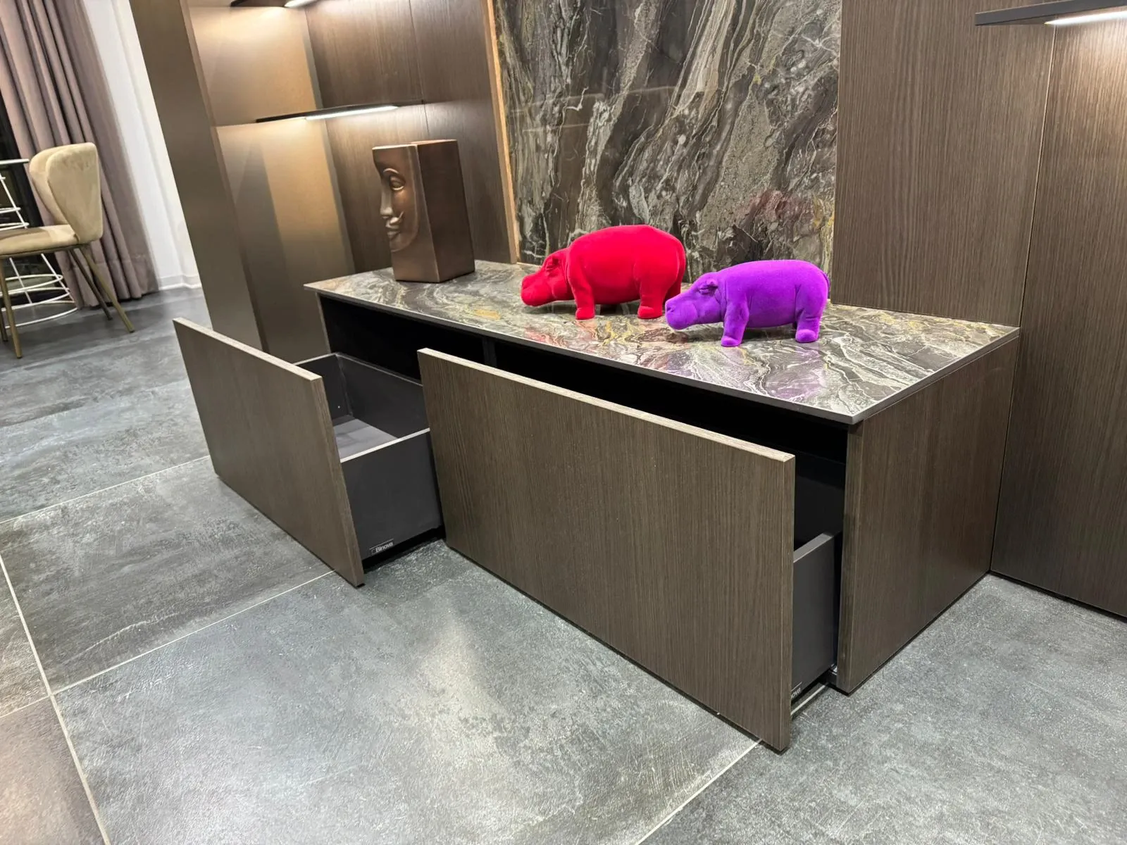Stupenda parete attrezzata dell'azienda Binova, con colonne laterali in finitura Tech Alluminio Campagne con anta sporgente per consentire l'apertura, mentre le basi cestoni centrali ed il pannello boiserie sono stati realizzati in finitura rovere quercia.